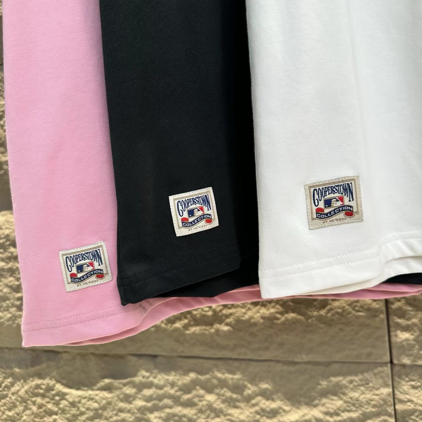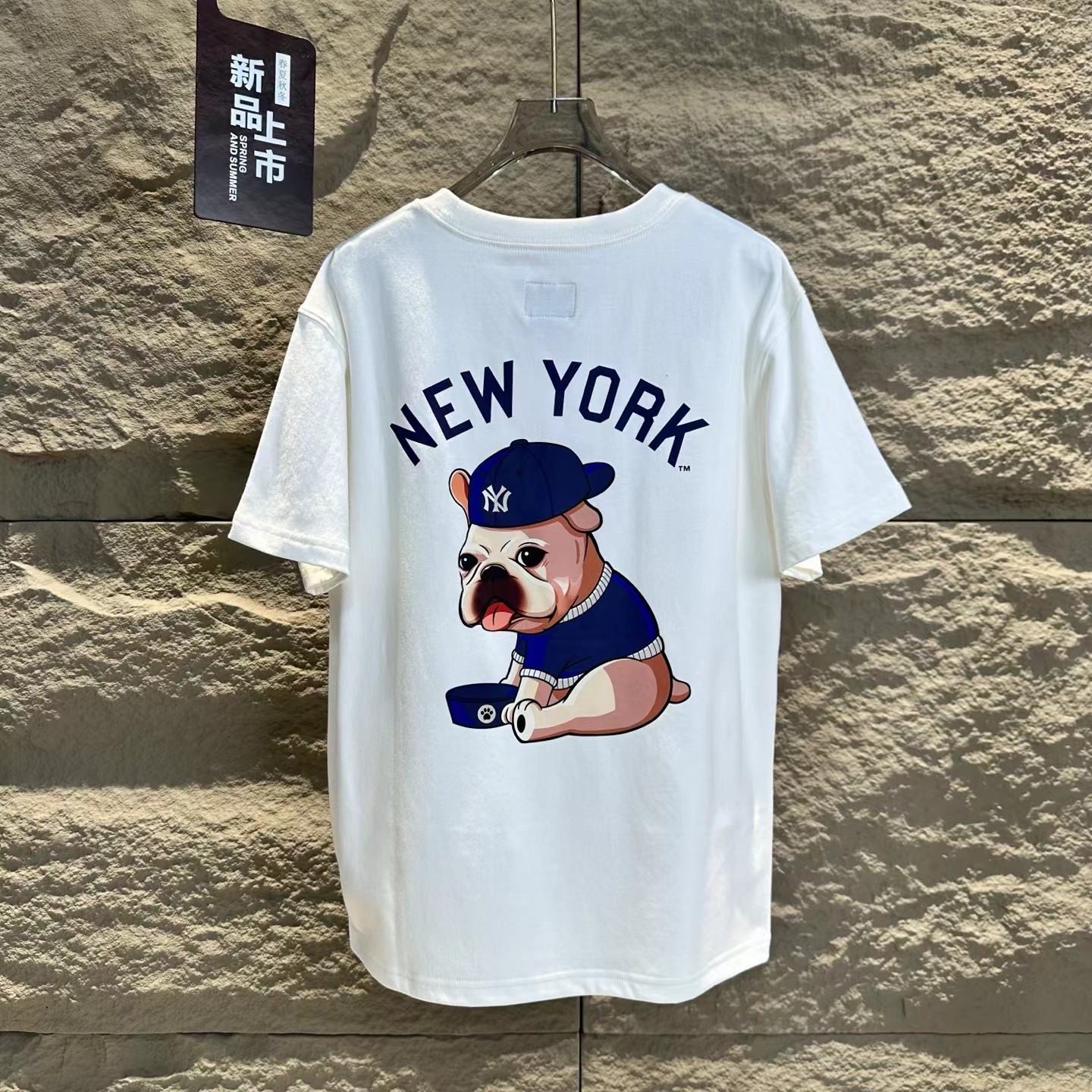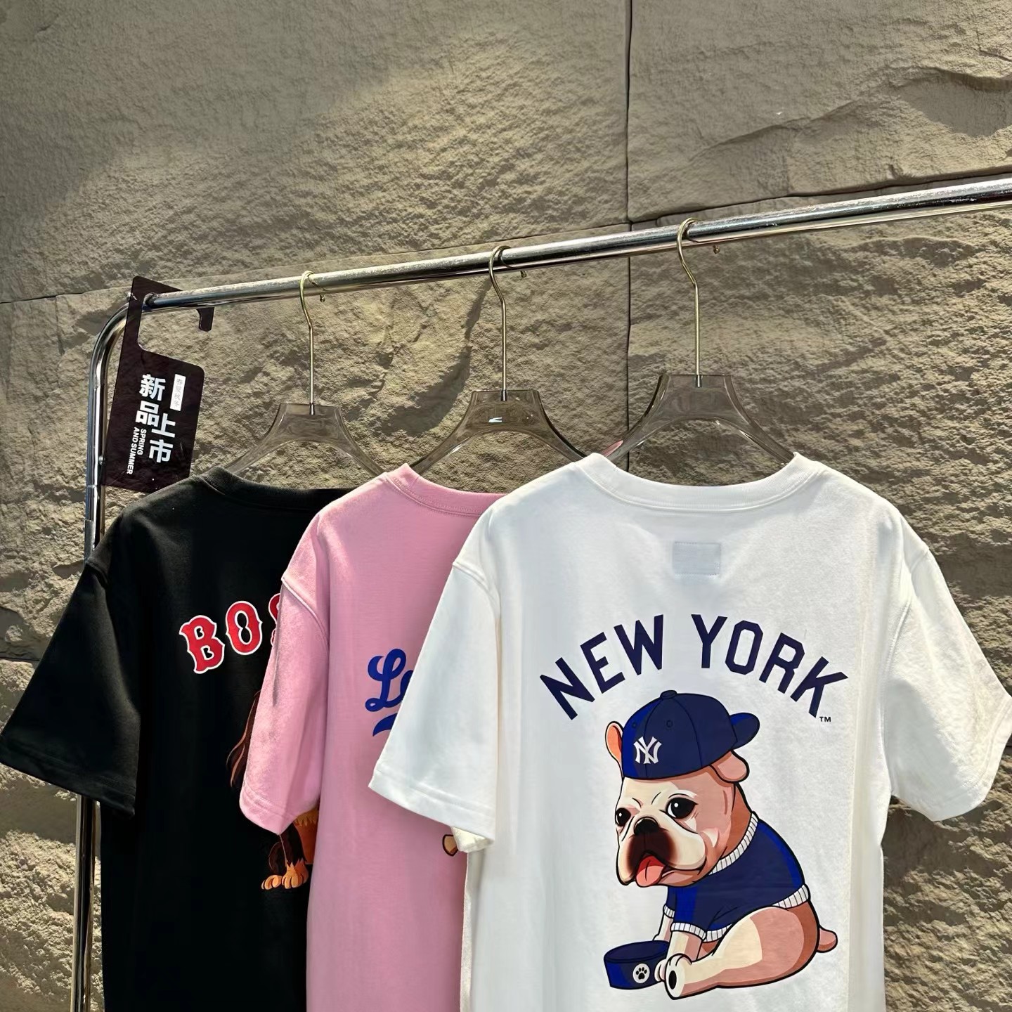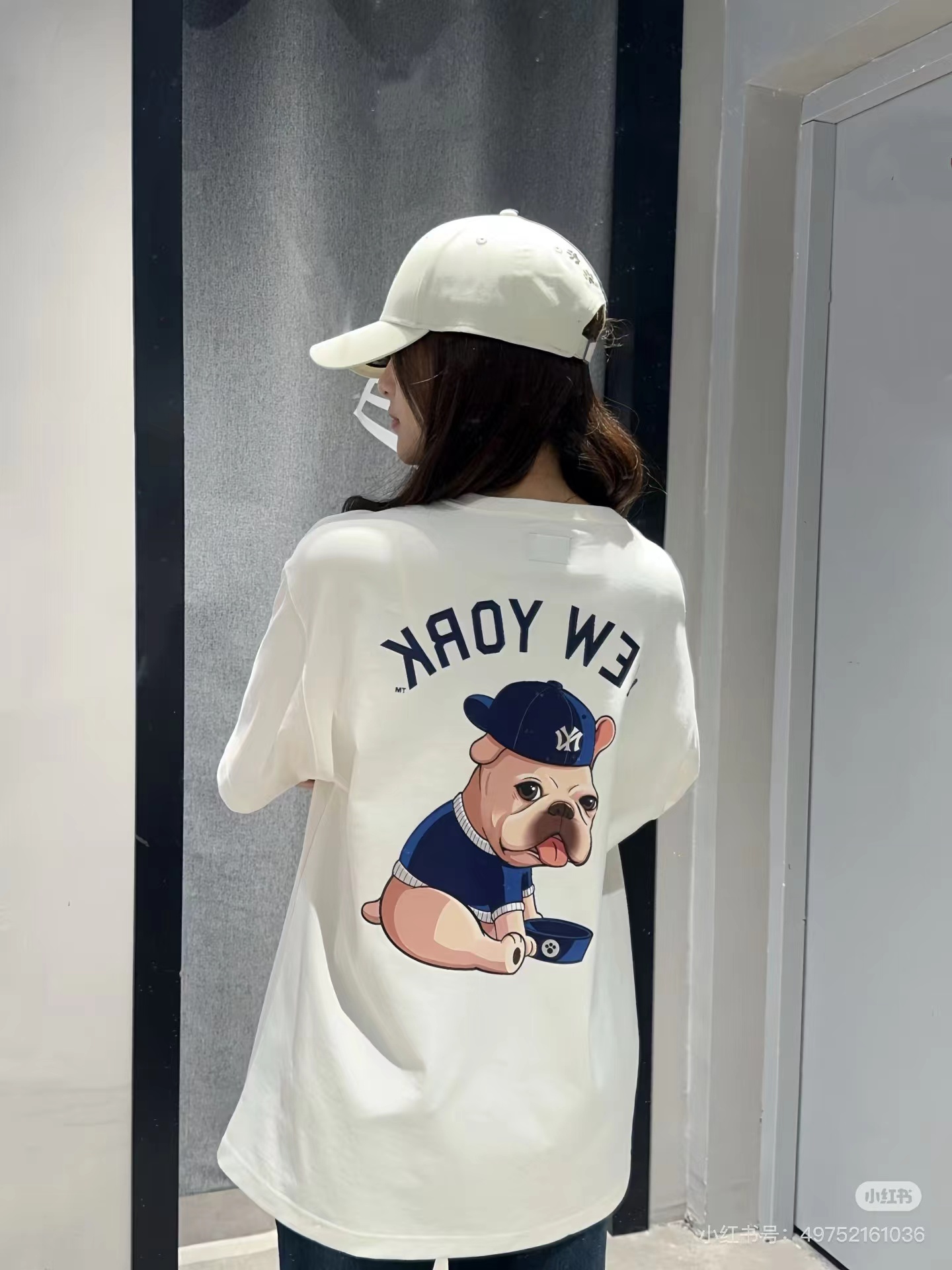 春季新款萌宠印花短袖T恤运动透气上衣男女。 萌宠系列短袖,主打趣味运动风格。背面图案:粉色背面印有字样与斑点狗(大麦町犬)卡通形象,小狗叼着棒球棒、抱着棒球,充满棒球运动趣味。黑色背面的是腊肠犬的卡通形象长耳粽狗。白色背面的是法国斗牛犬的卡通演绎。正面:左胸有字母/队徽设计,袖口带有小徽标点缀。版型:宽松直筒常规版型,适合日常休闲与运动穿搭,面料与穿着,,面料:棉+涤纶混纺,兼顾柔软亲肤 透气鞋与挺括不易变形 厚度:适中,适合夏季穿着。追求时尚舒适运动风,男女都可以。