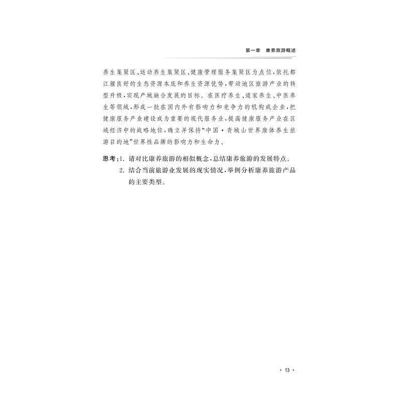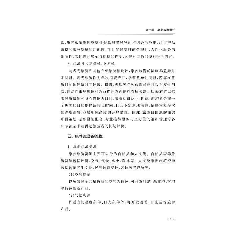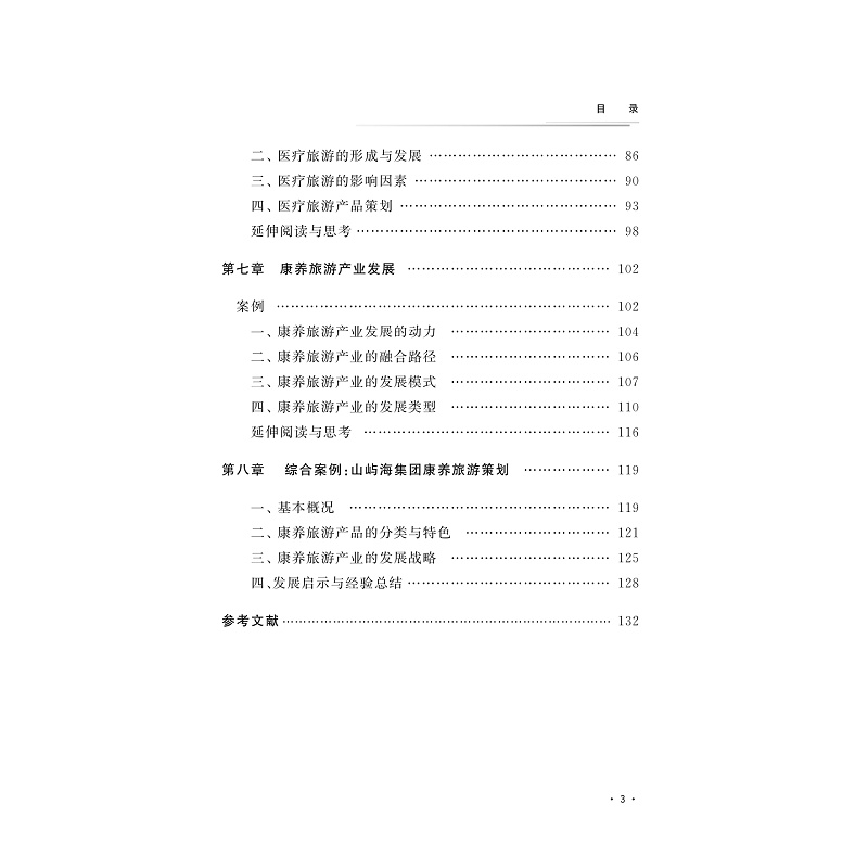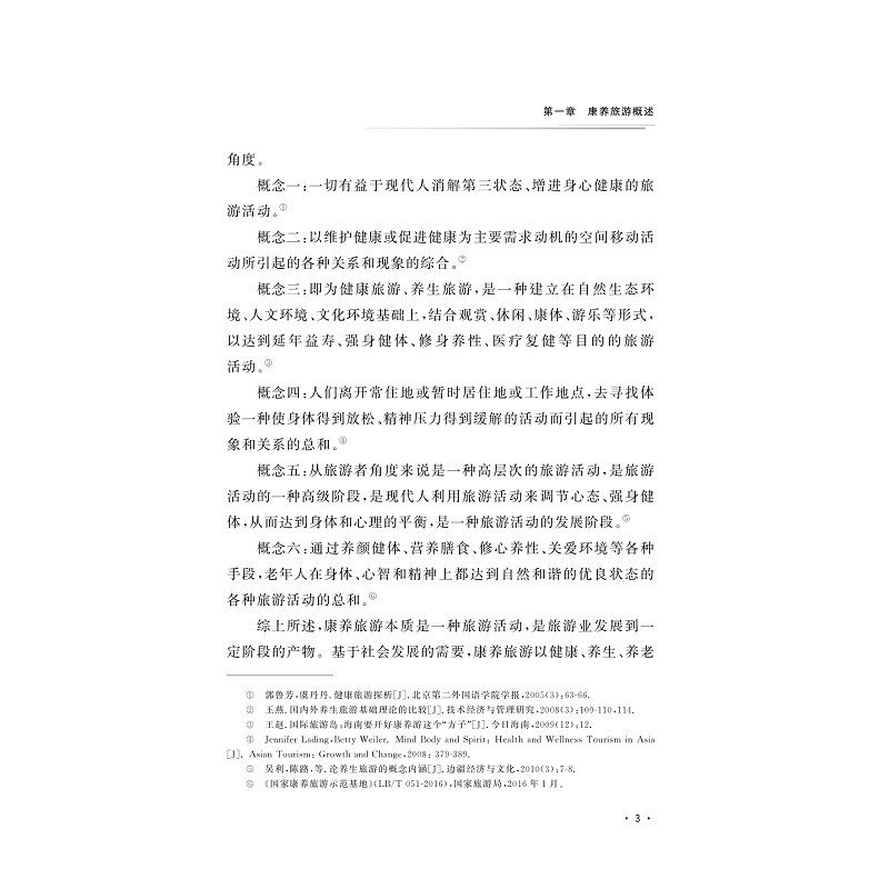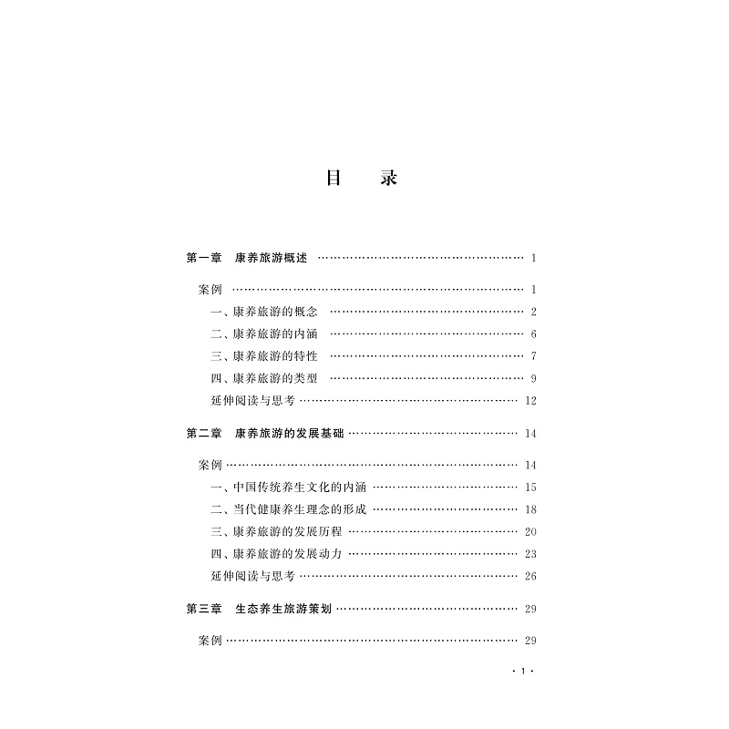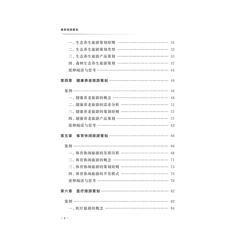 本教材主题符合当前健康服务业发展的大趋势,将基于对休闲养生旅游市场的全面认知,重点探讨休闲养生旅游产品的开发,分别从生态养生旅游、健康养老旅游、体育健身旅游和医疗旅游等方面引导学生开展具体探讨和实务练习,并结合案例进行综合分析。