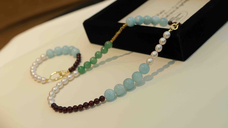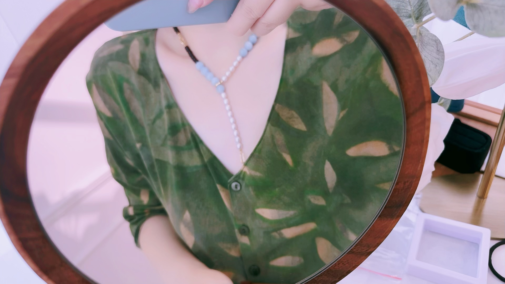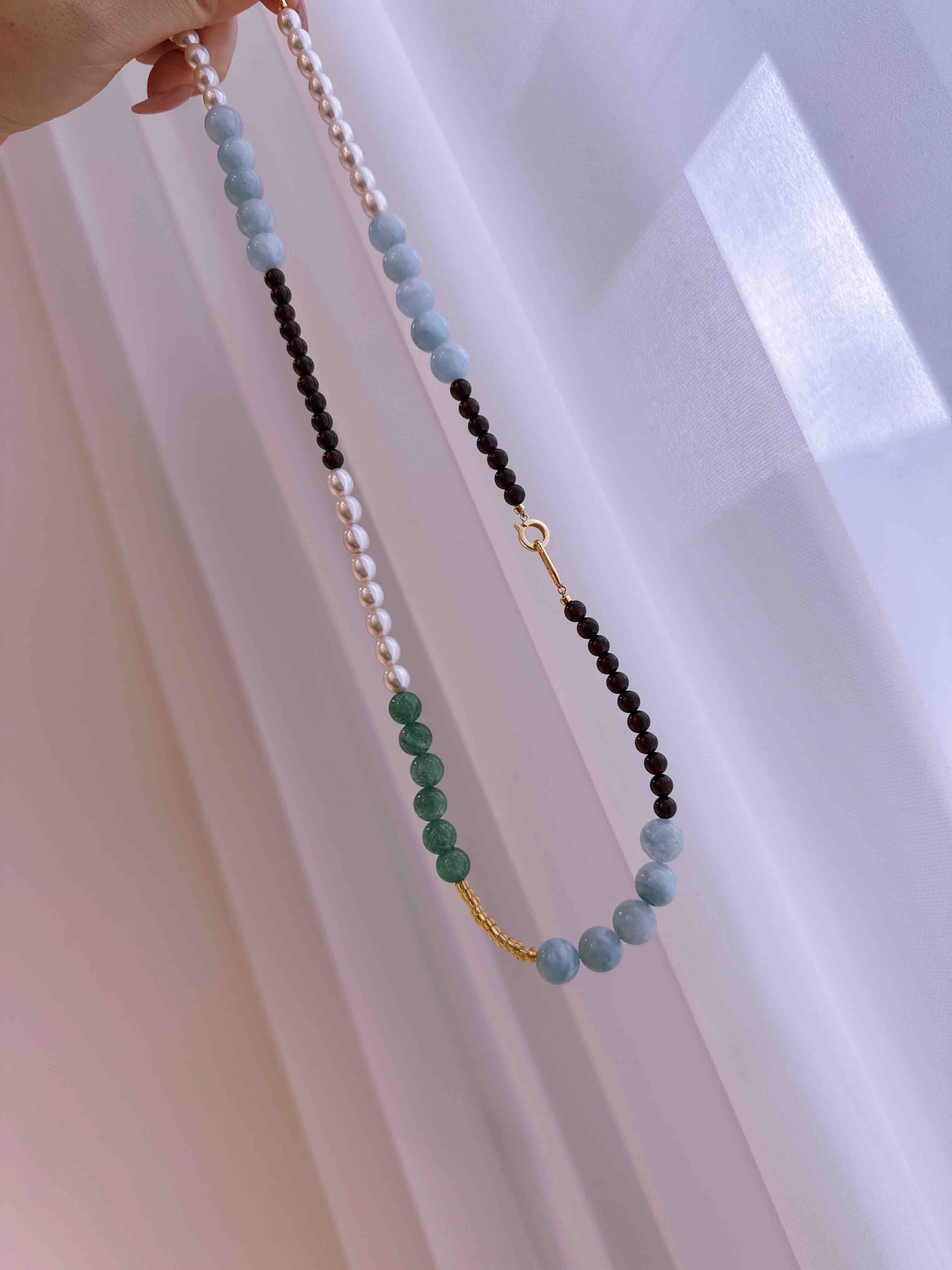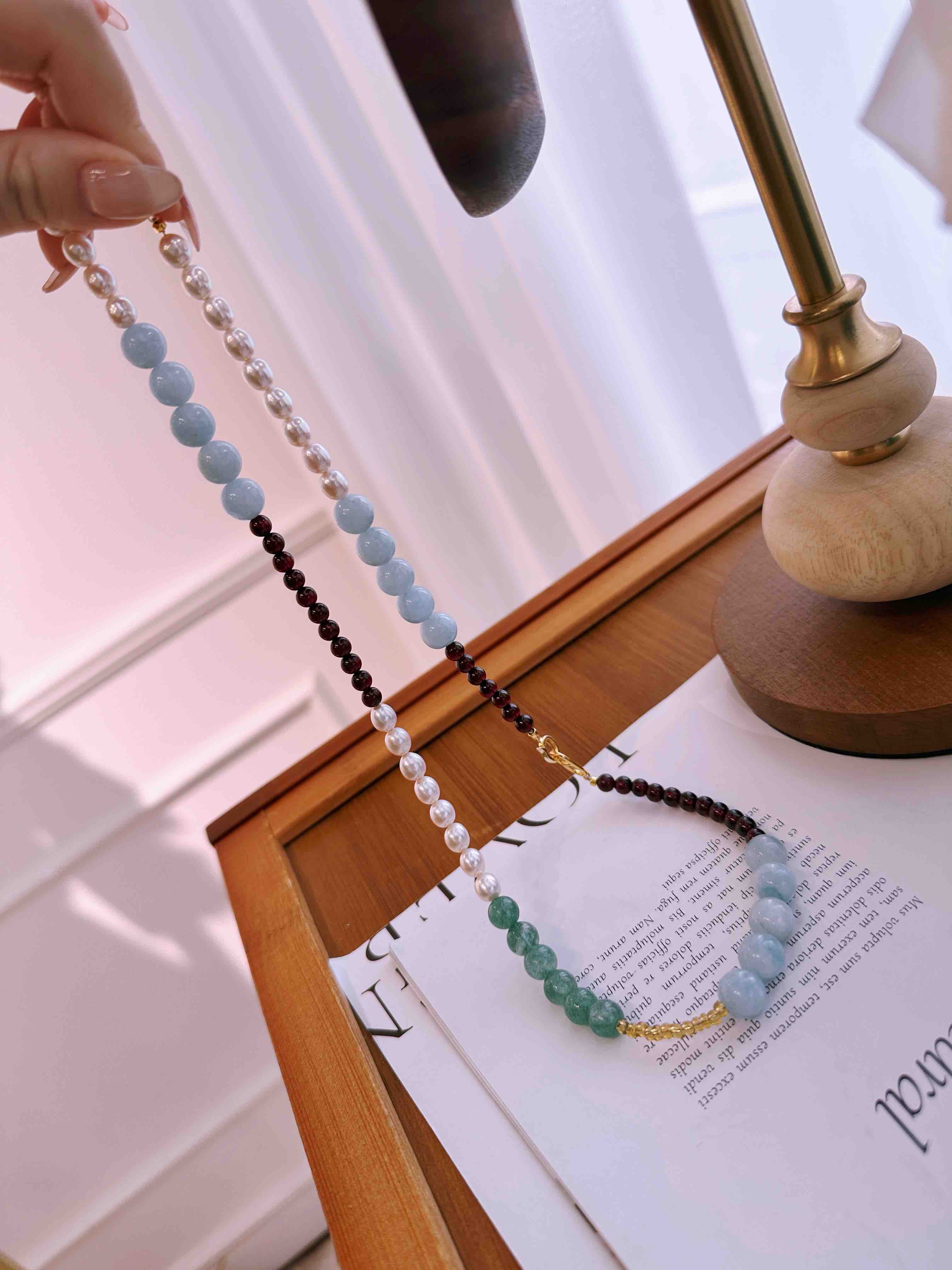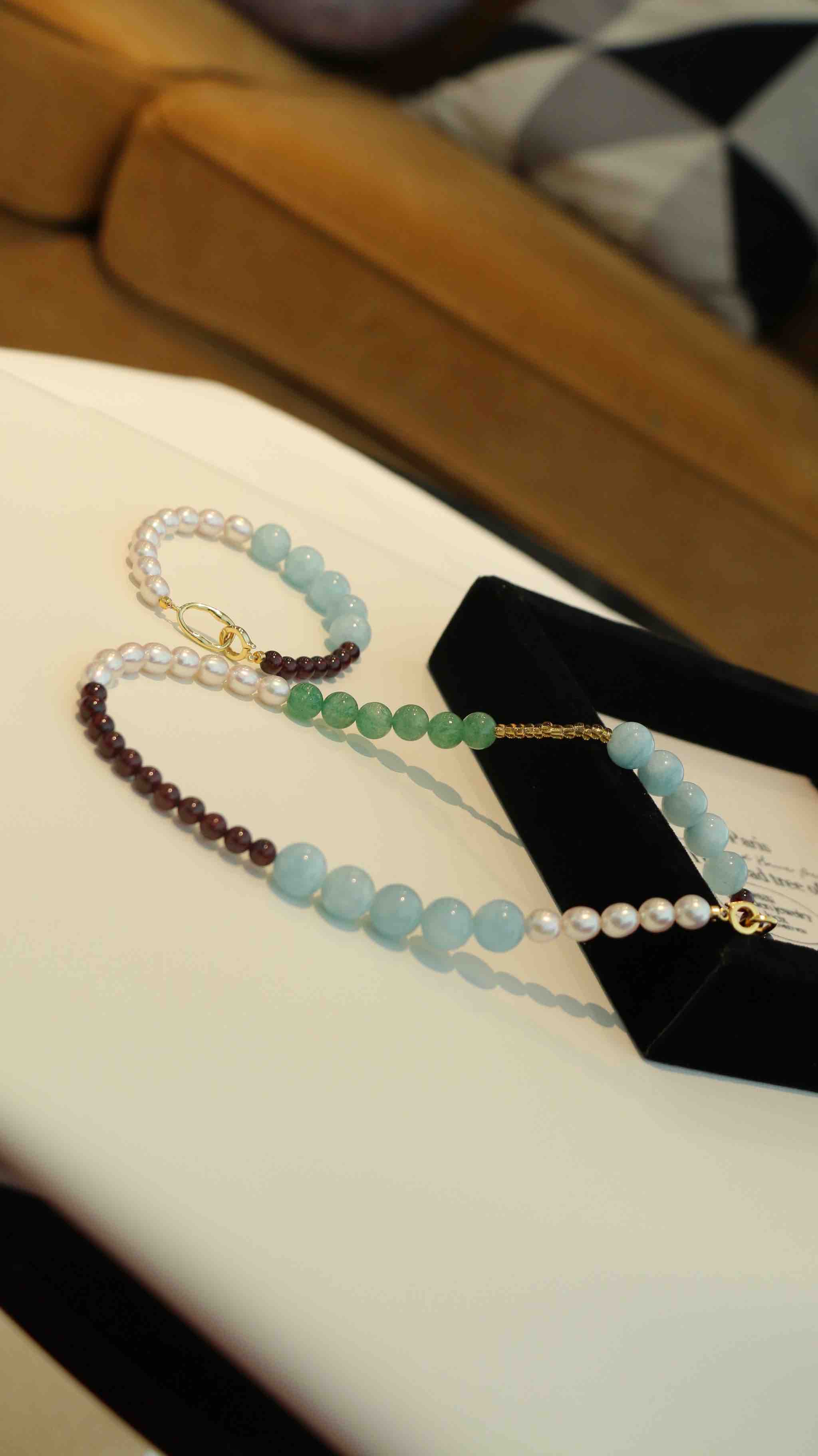 九月,🆕上新一款特别一点的天然宝石+珍珠项链,海蓝宝 8mm &绿草莓晶 8mm &石榴石 5mm &珍珠胖米 6.5-7mm。