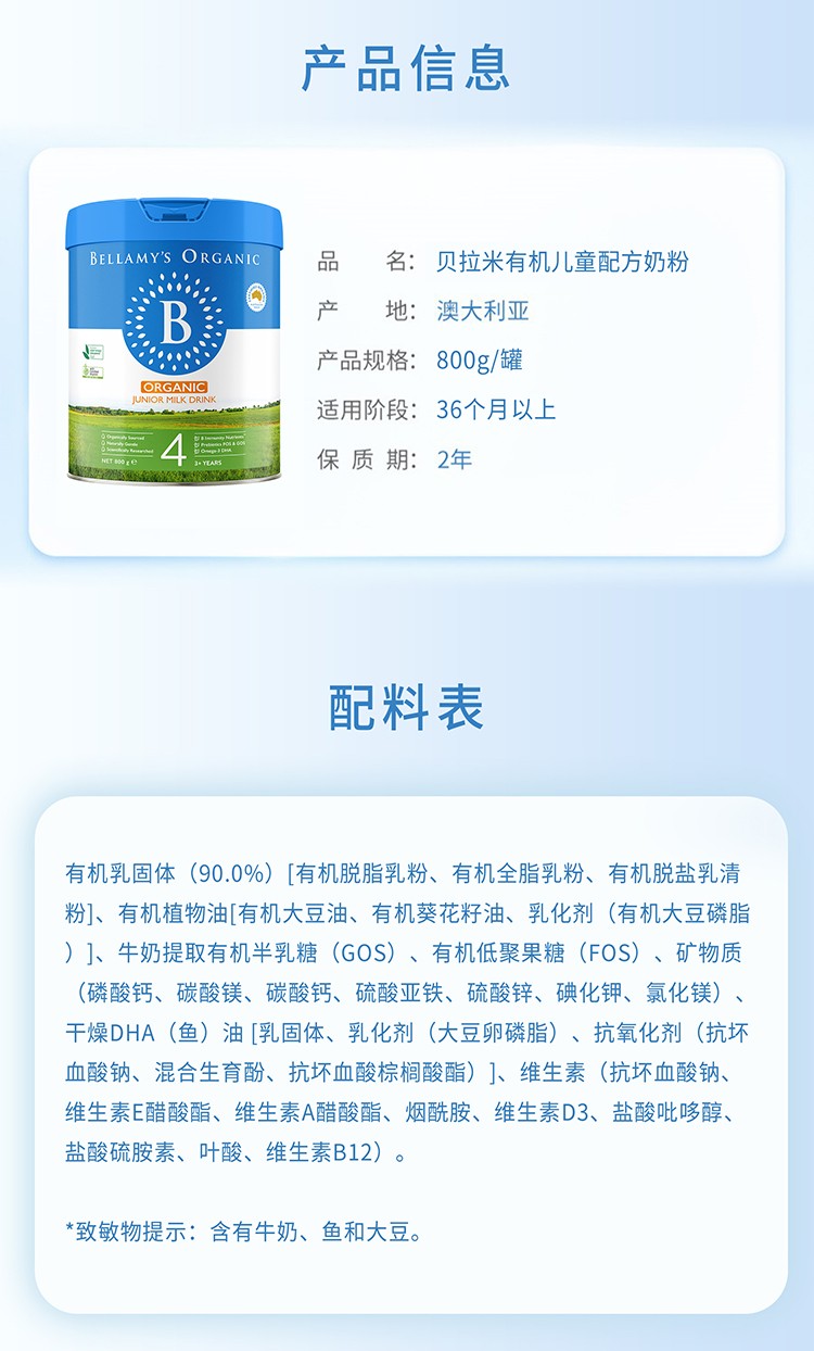 澳洲贝拉米4段有机婴幼儿奶粉 900g(升级版)