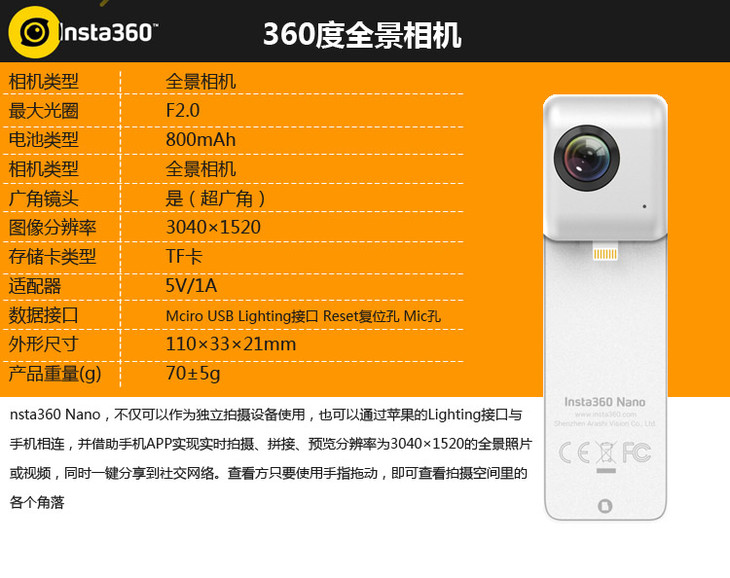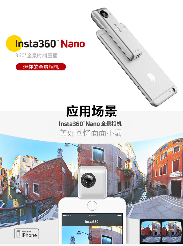 Insta360 Nano VR全景相机专业直播3K高清全景摄相机美颜相机一键分享