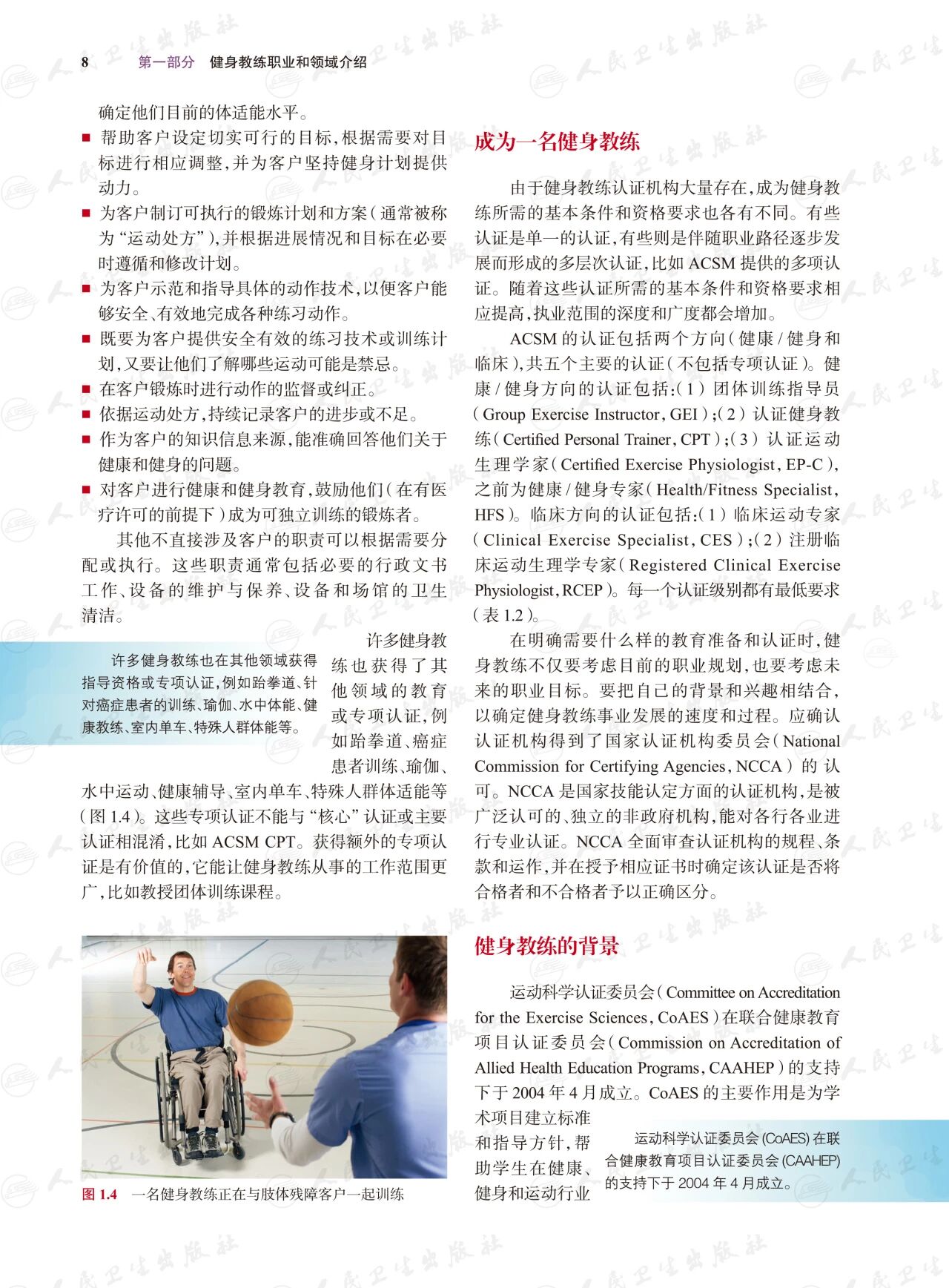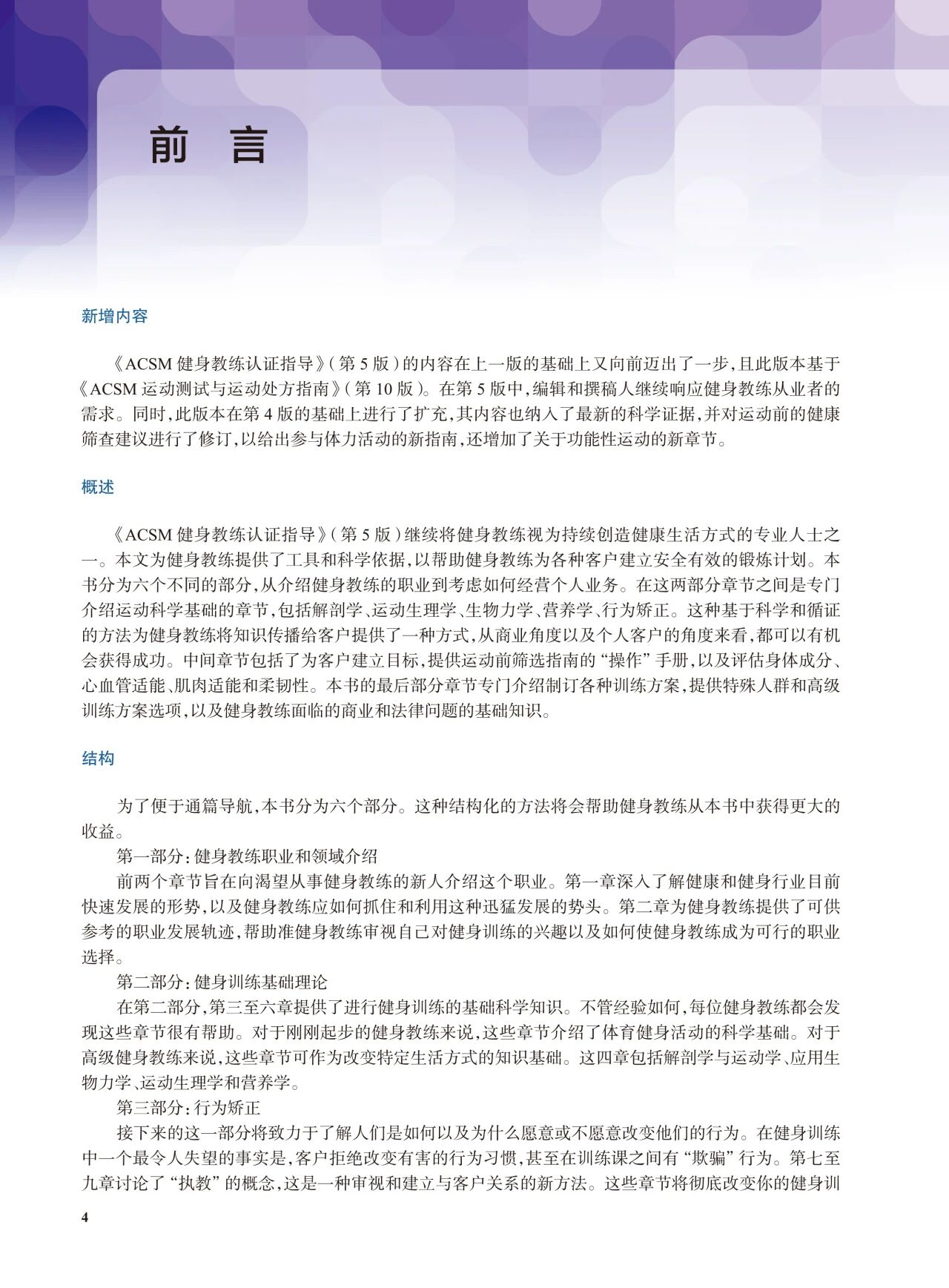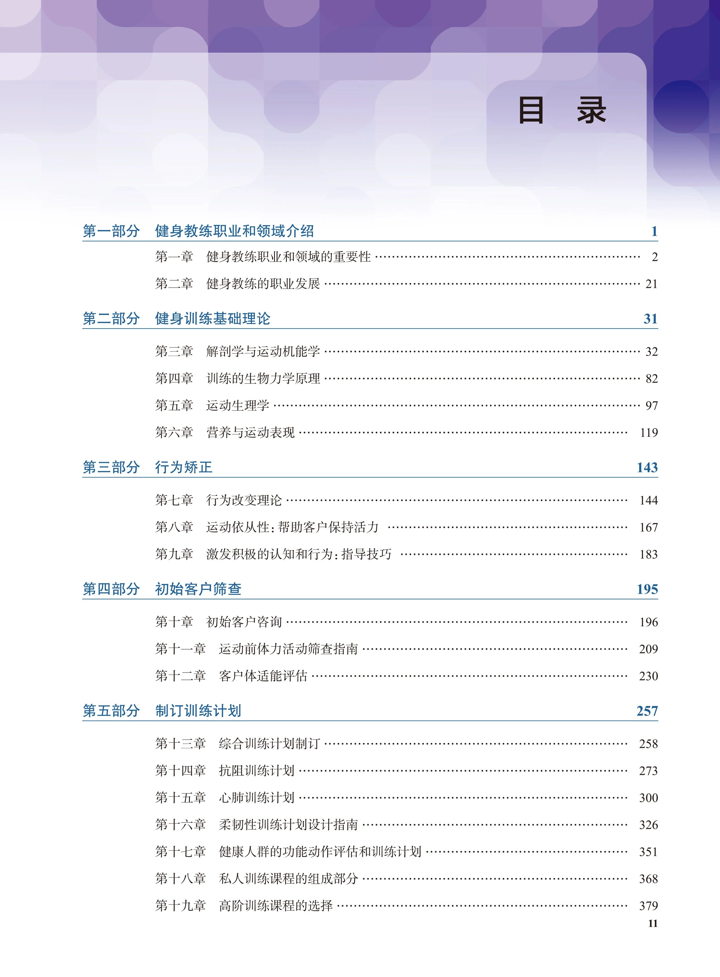 新版本纳入了全新的训练前指南,涵盖了人体解剖学、运动生理学、生物力学、行为矫正学、 营养学,力量和柔韧性评估,以及抗阻和心肺机能训练计划的制定的内容。