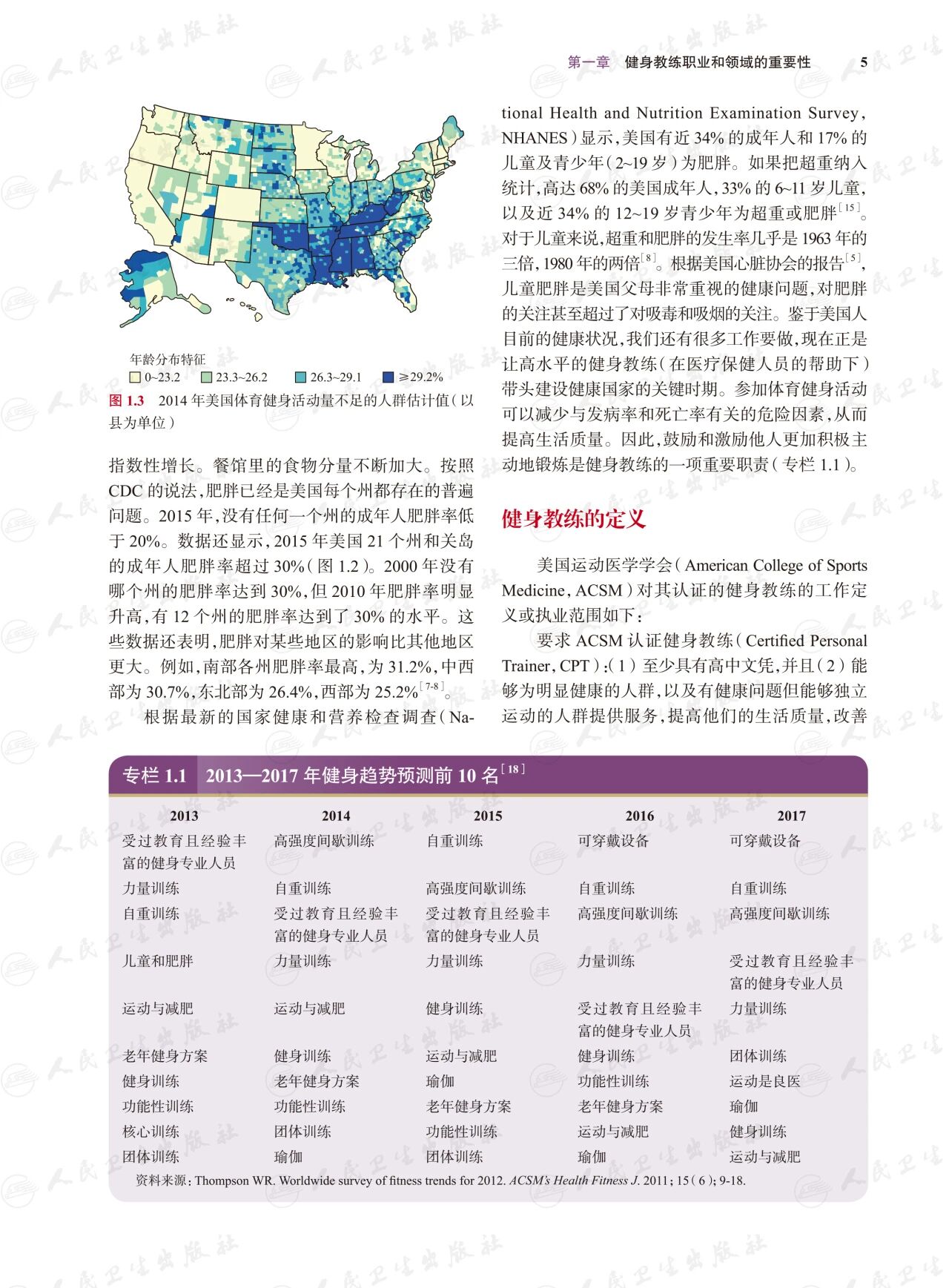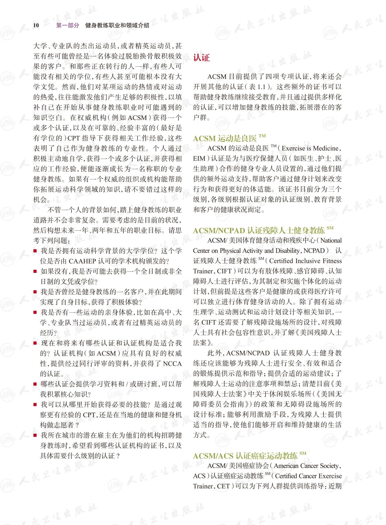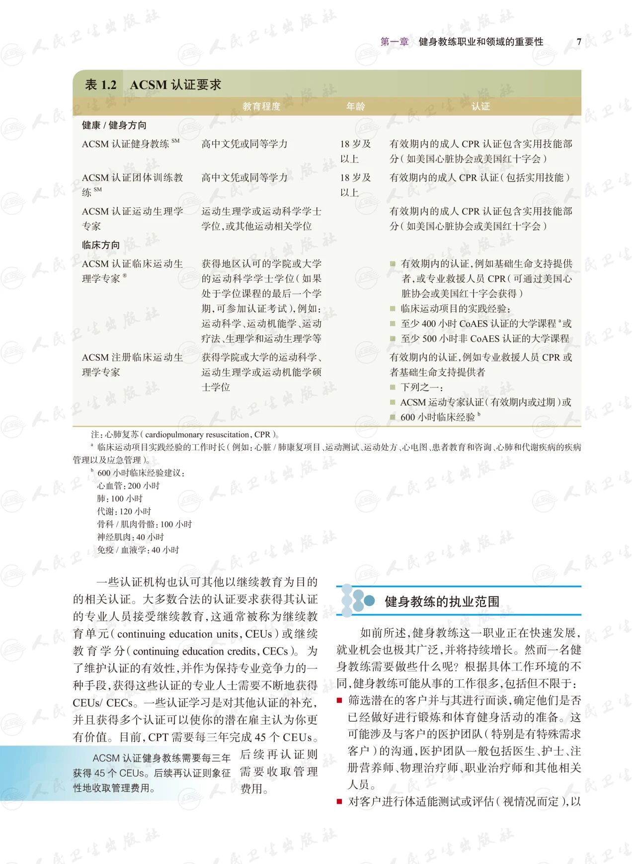 新版本纳入了全新的训练前指南,涵盖了人体解剖学、运动生理学、生物力学、行为矫正学、 营养学,力量和柔韧性评估,以及抗阻和心肺机能训练计划的制定的内容。