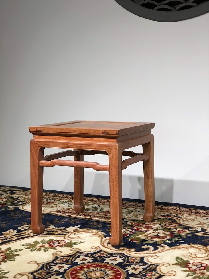 此凳子精仿于王世襄著作《明式家具珍赏》,束腰与腿足相交,下连接腿柱的横枨,中间高拱,两头低弯,形似罗锅而命名,马蹄足,四足下端略向内兜转,弧线柔和悦目。