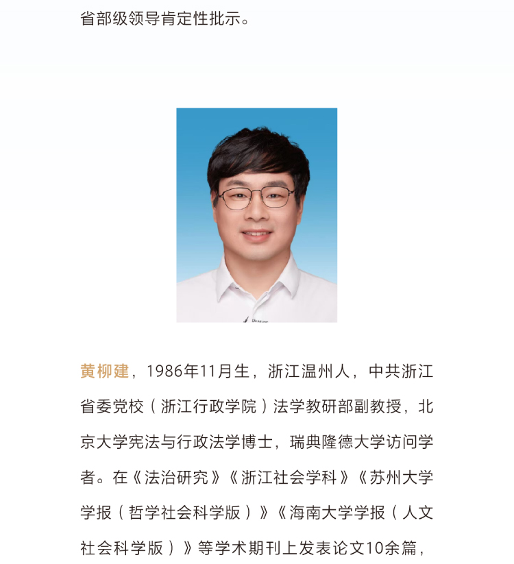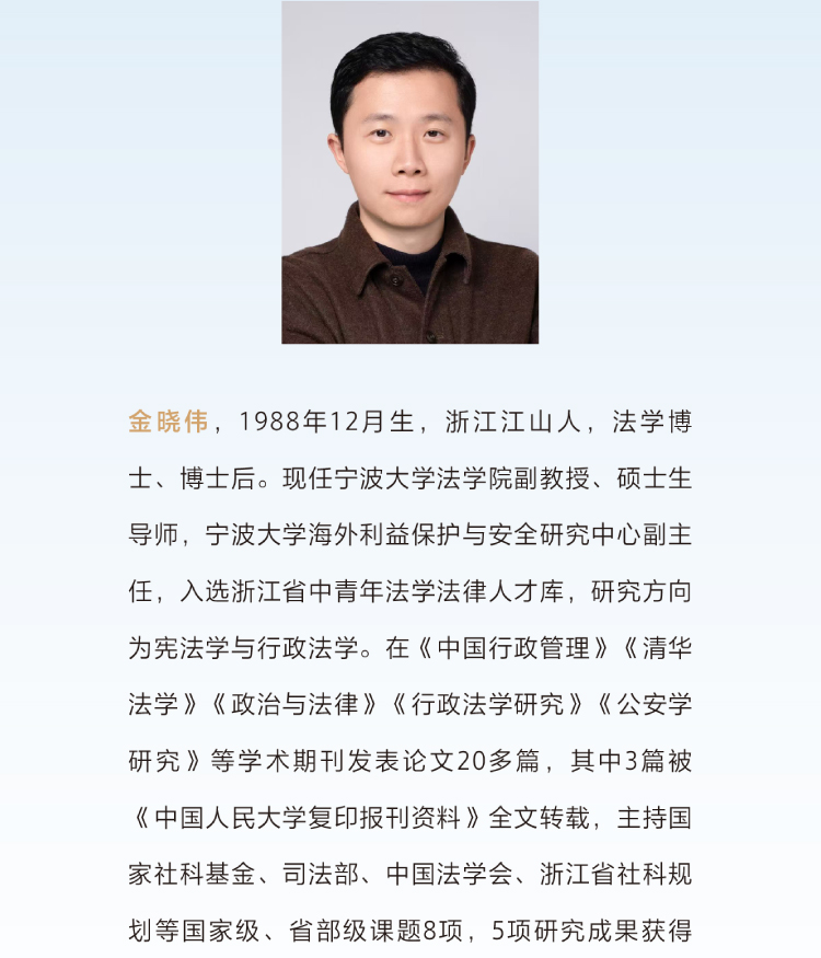 金晓伟,法学博士、博士后,研究方向为宪法学与行政法学,在浙江大学出版社出版《“治安承包”法治化研究》(2022年,独著),在中国人民公安大学出版社出版《规范警察使用武力理论与实践》(2023年,四作)。黄柳建,法学博士,研究方向为宪法学与行政法学,在浙江工商大学出版社出版《北欧司法审查制度与实践研究》(2024年,独著)。