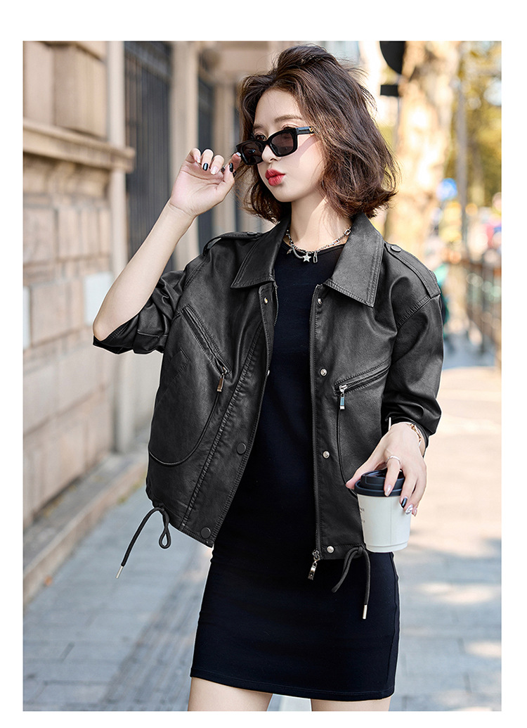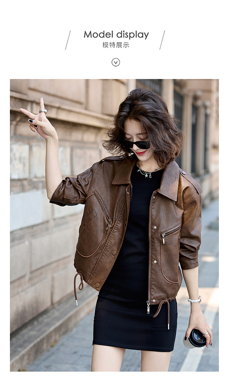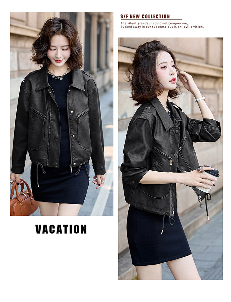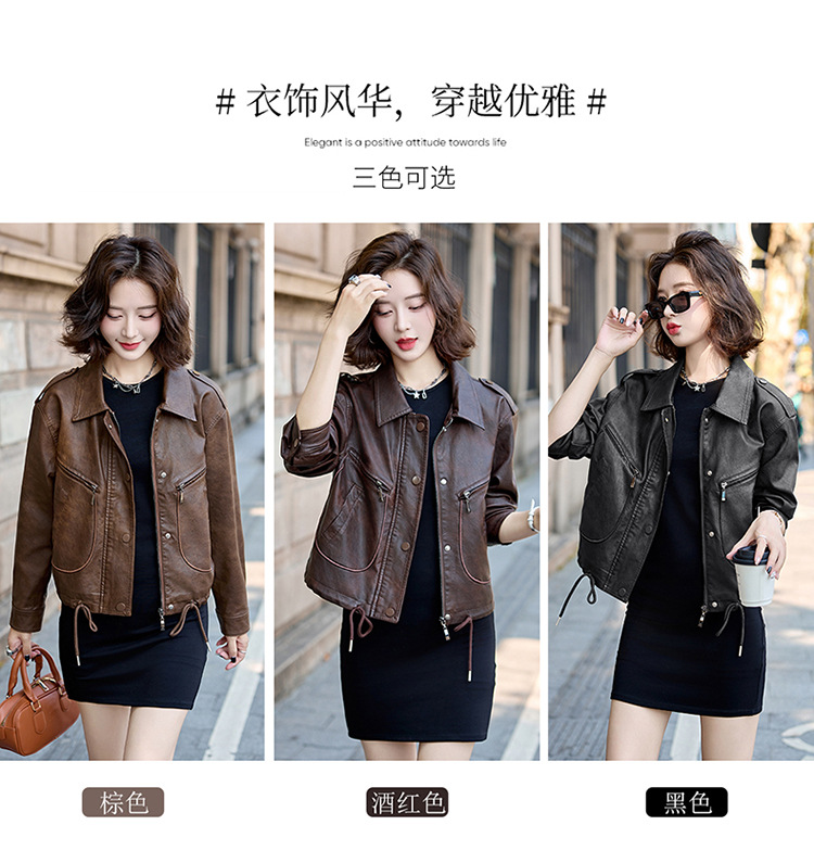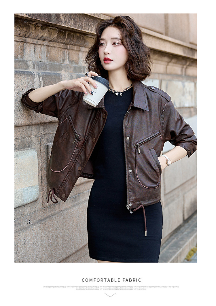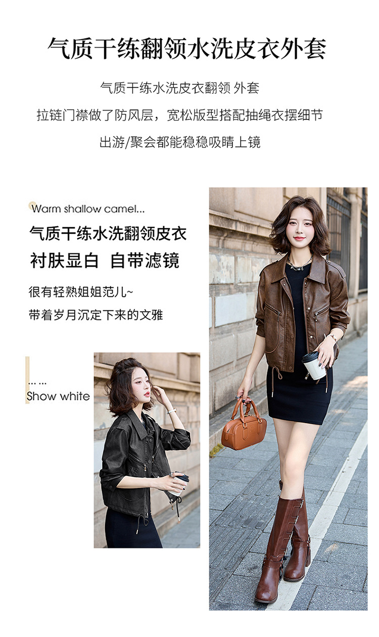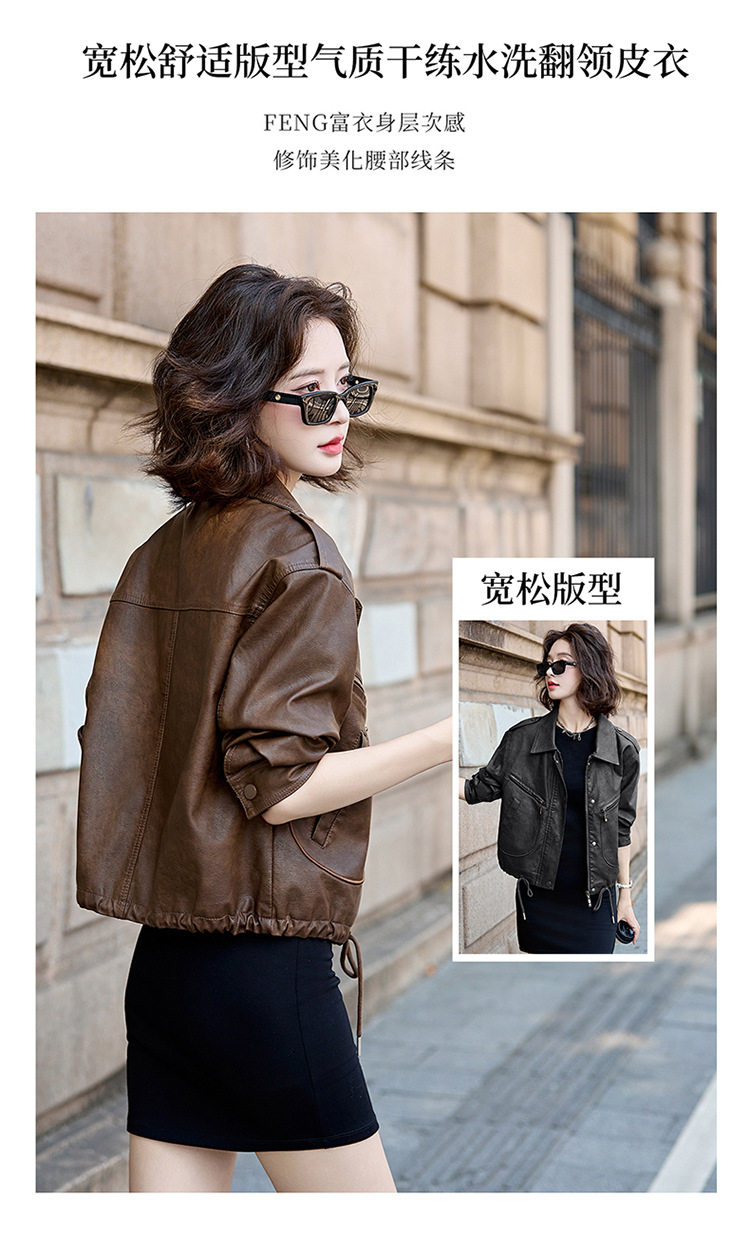 HR WZ11039气质时尚复古简约大方遮肉显瘦翻领PU皮外套