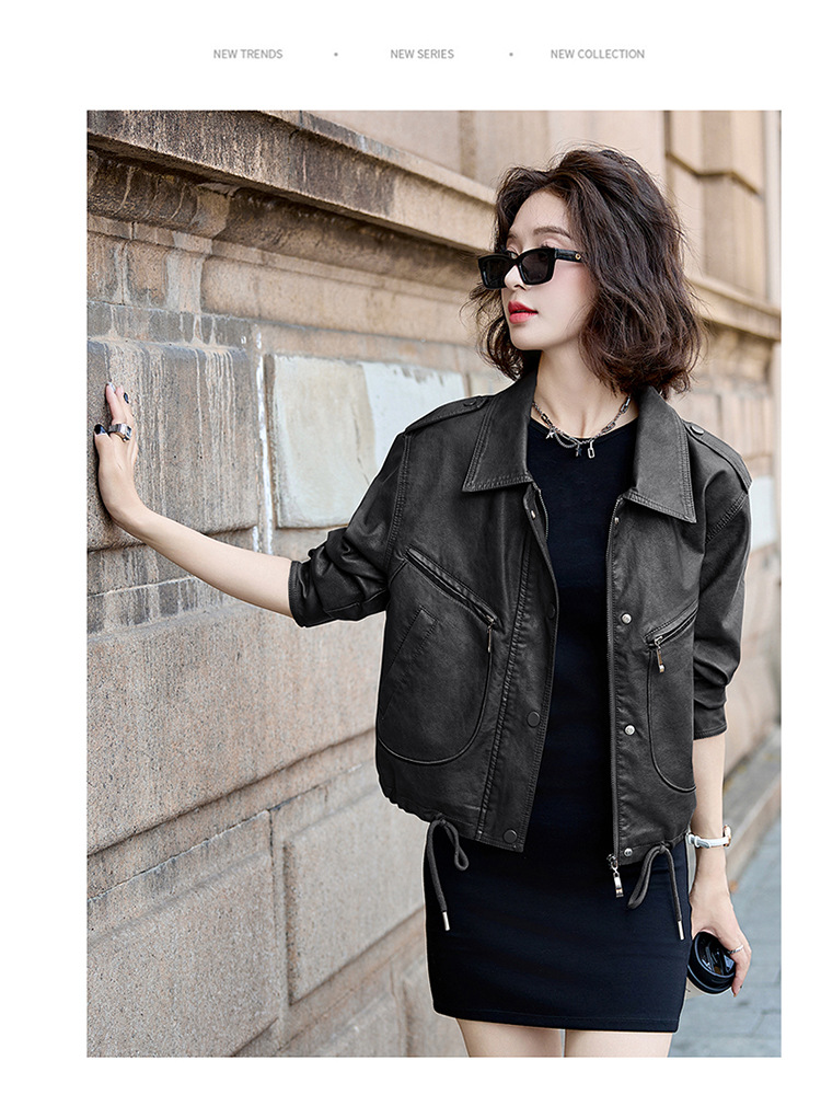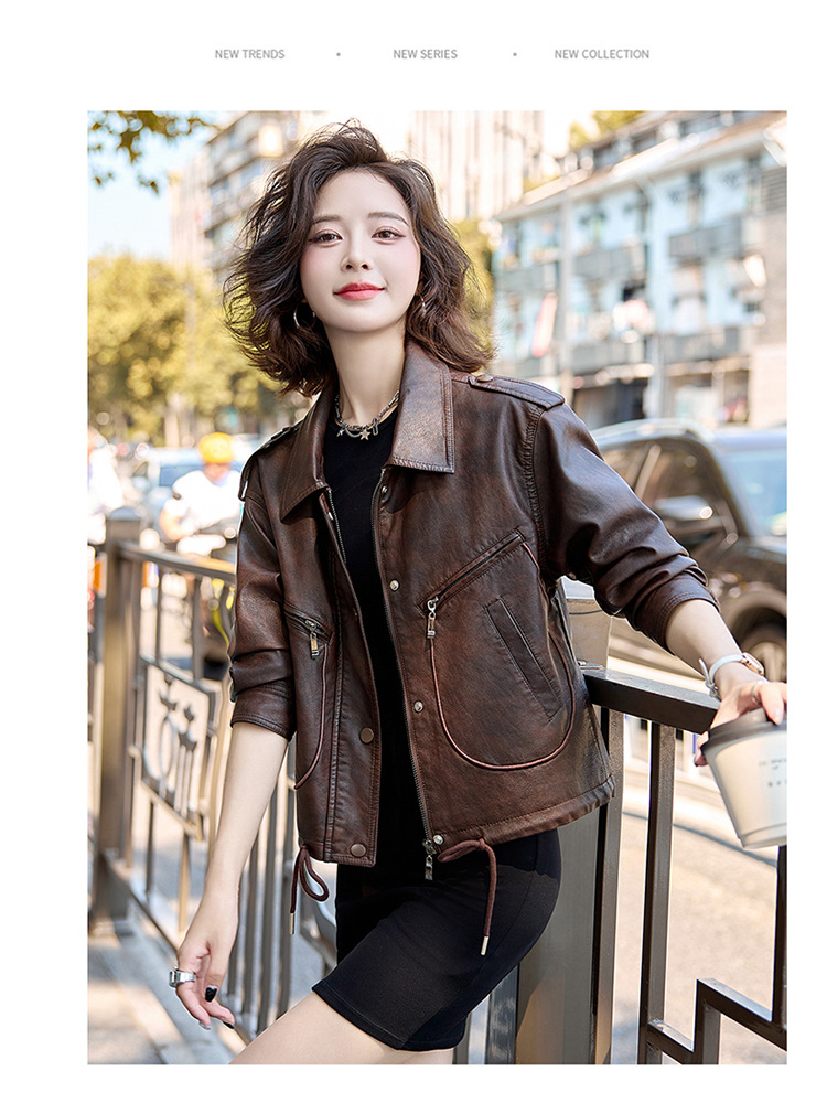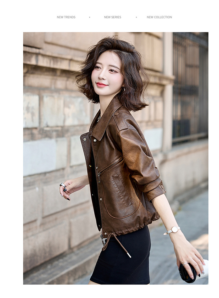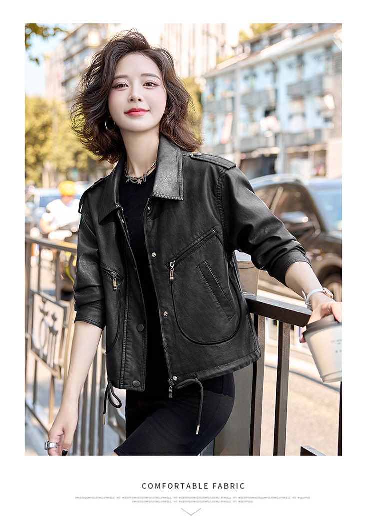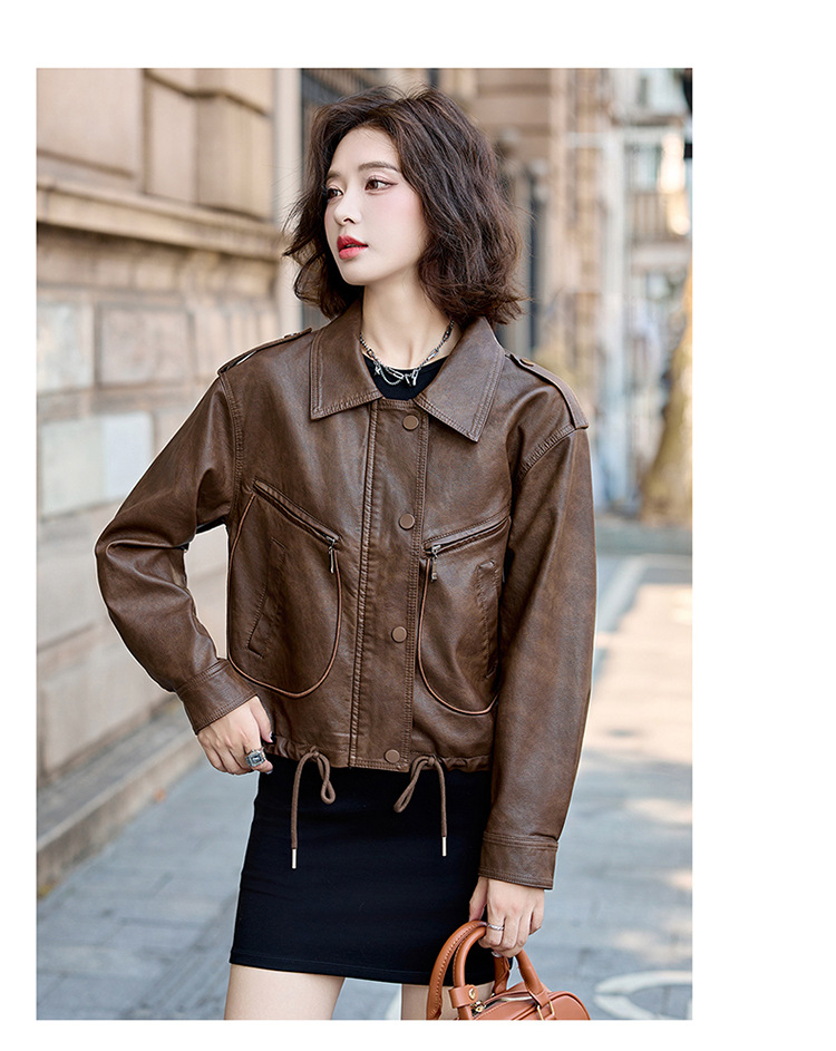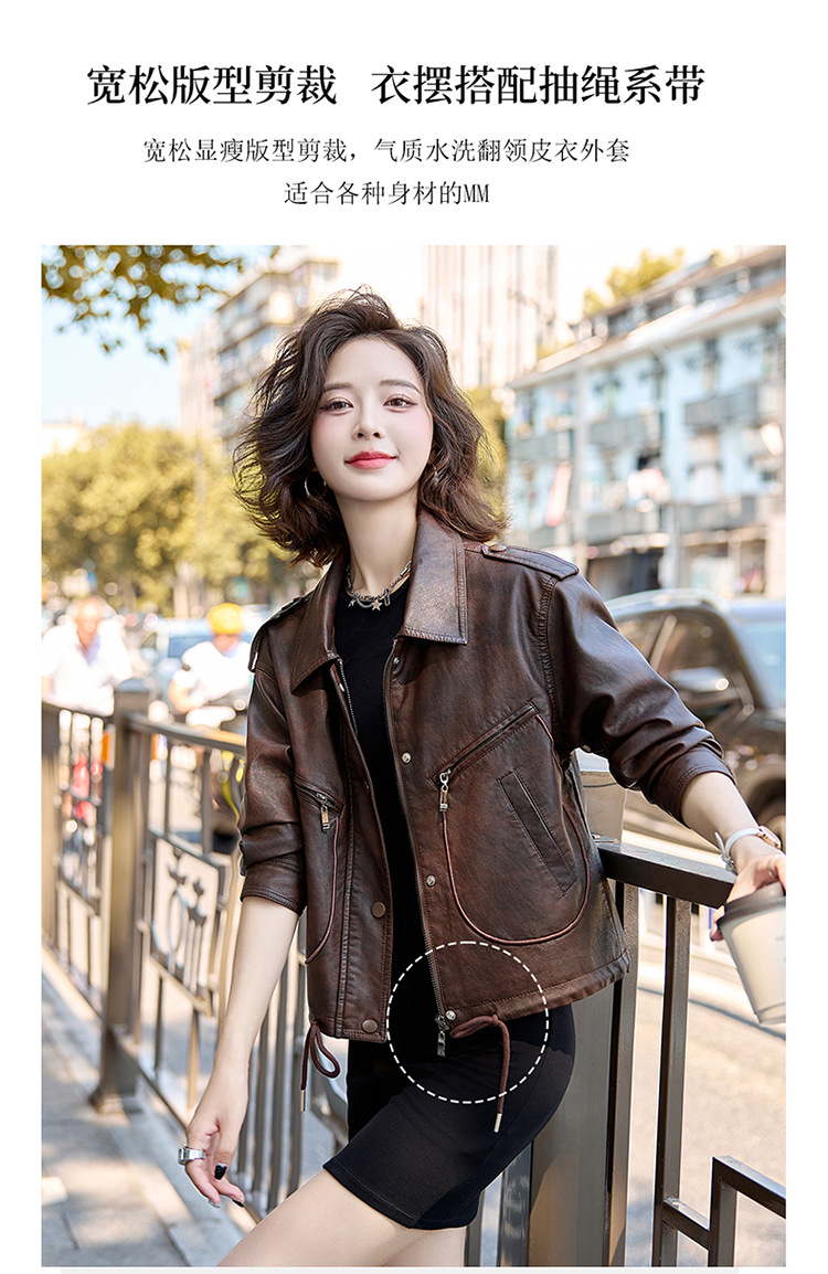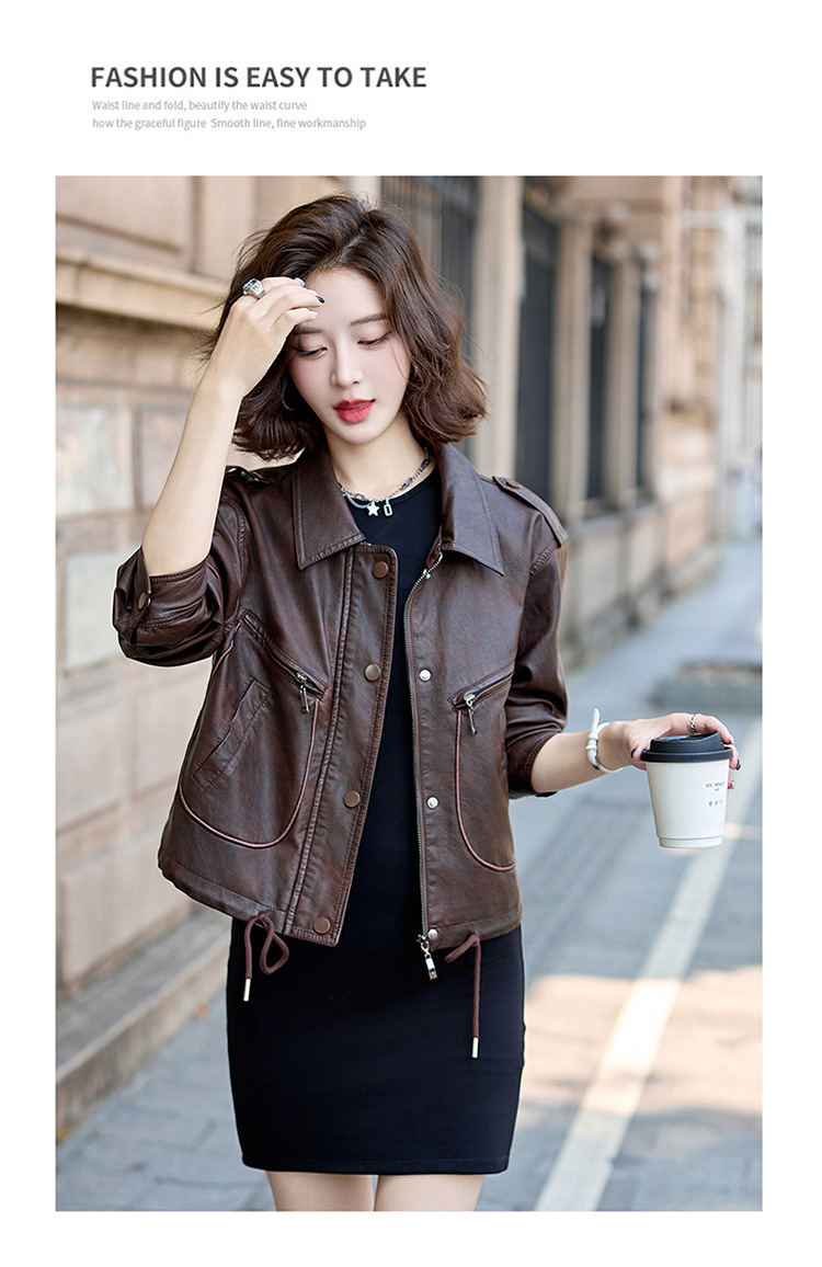 HR WZ11039气质时尚复古简约大方遮肉显瘦翻领PU皮外套