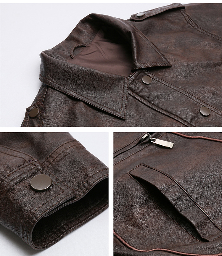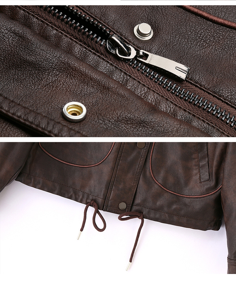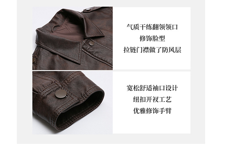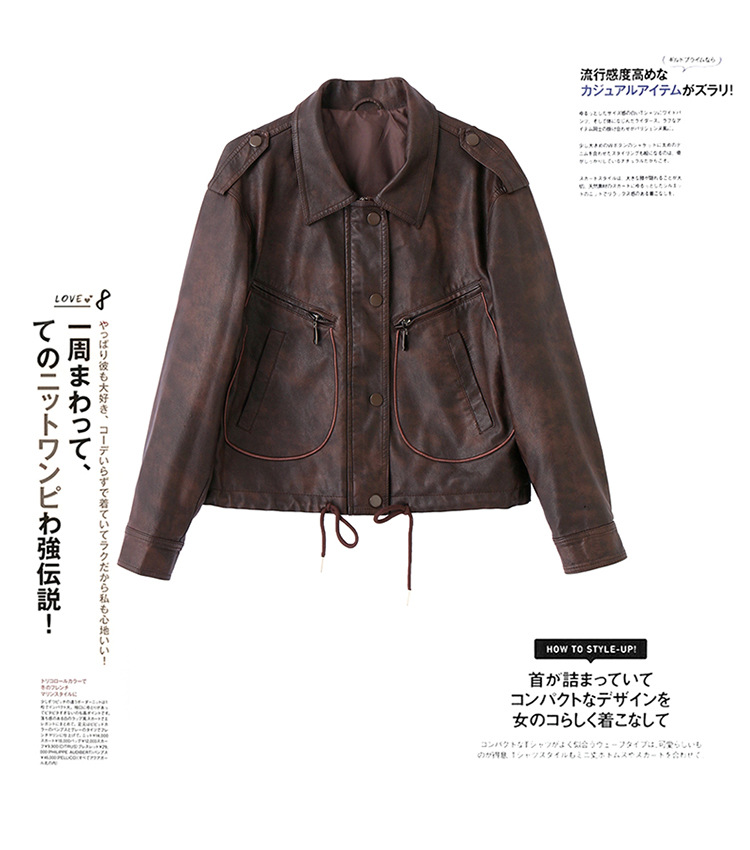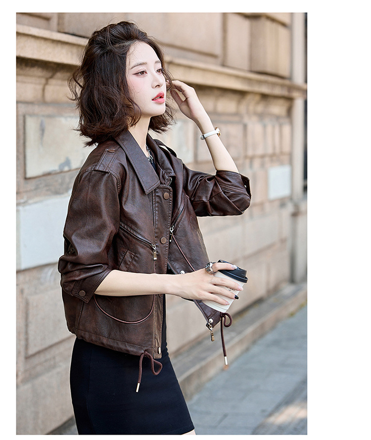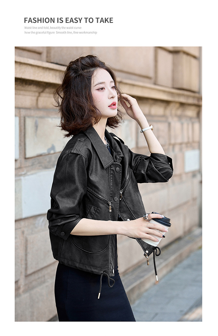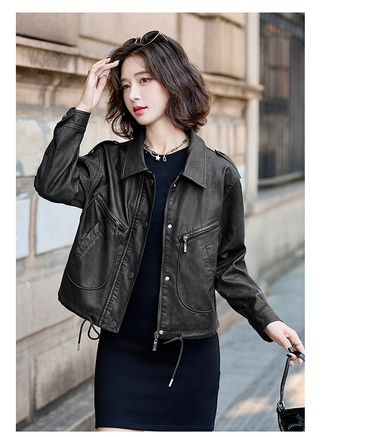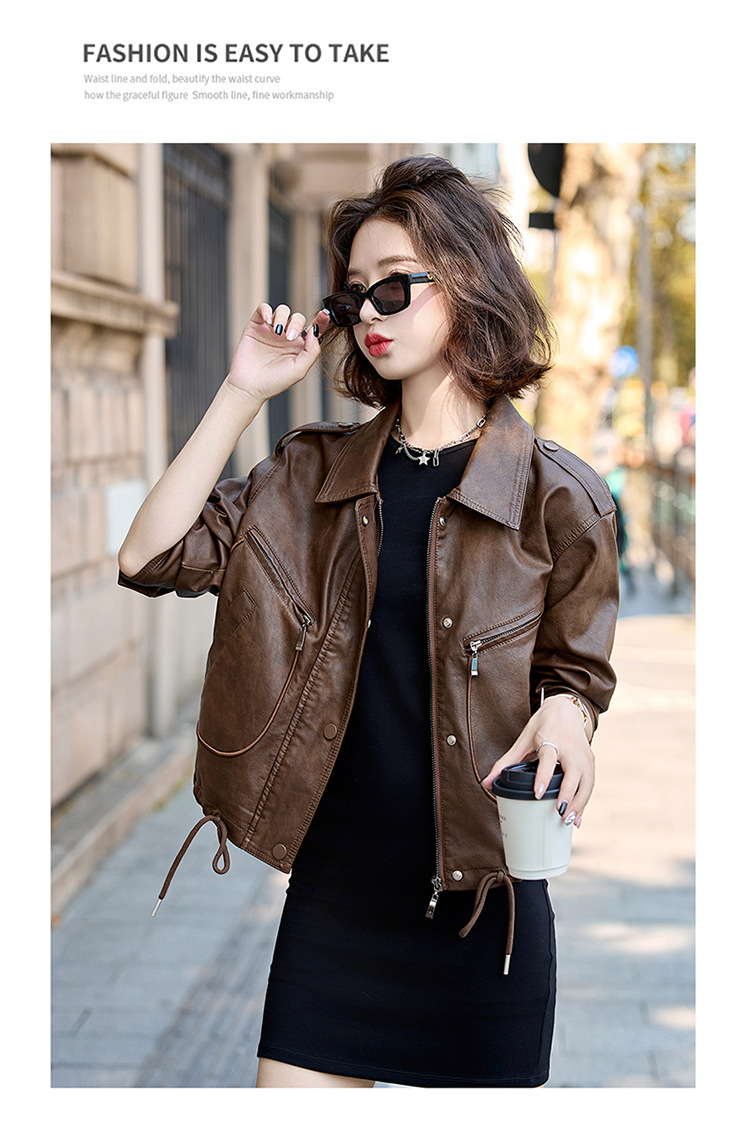 HR WZ11039气质时尚复古简约大方遮肉显瘦翻领PU皮外套