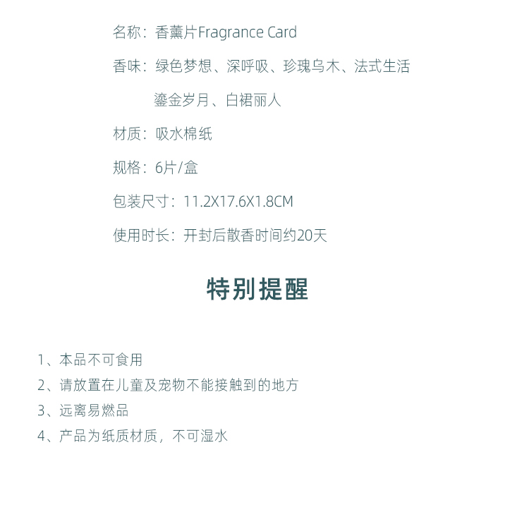 【沁迹】香薰片6片装/盒衣柜车载香薰挂件 商品缩略图0 【沁迹】香薰片6片装/盒衣柜车载香薰挂件 商品缩略图1 【沁迹】香薰片6片装/盒衣柜车载香薰挂件 商品缩略图2 【沁迹】香薰片6片装/盒衣柜车载香薰挂件 商品缩略图3 【沁迹】香薰片6片装/盒衣柜车载香薰挂件 商品缩略图4