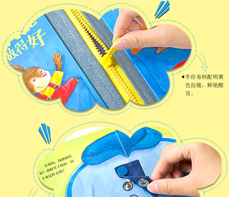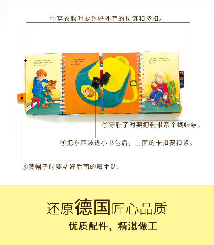 在这本书里,宝宝可以学会很多日常穿戴方面的小技能:搞定拉链、按扣、鞋带、魔术贴、卡扣和松紧口袋。翻一翻这本书,让宝宝练习自己动手做吧!