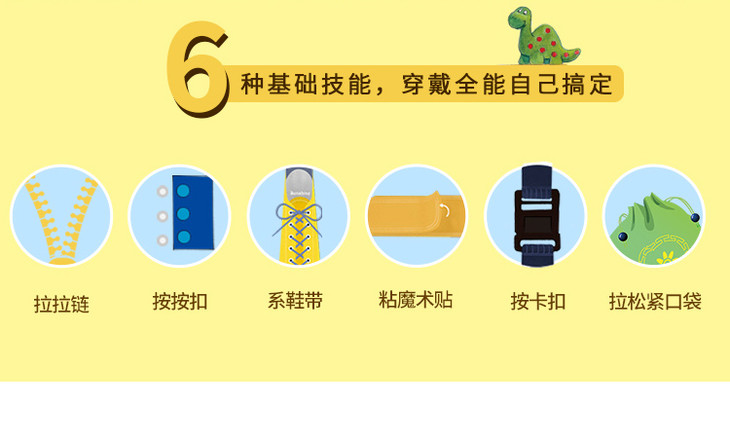 学习拉拉链、按按扣、系鞋带、粘魔术贴、按卡扣、拉松紧口袋。