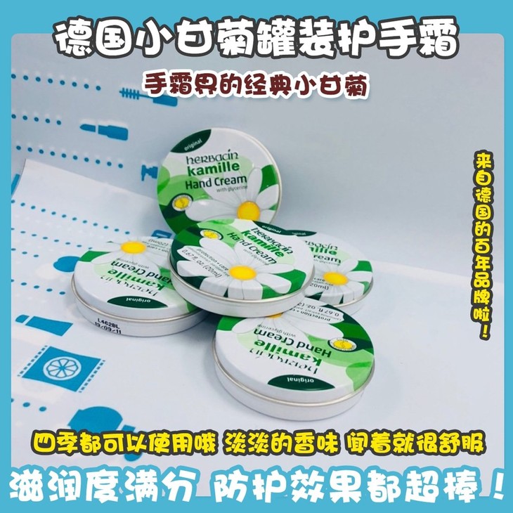 德国小甘菊罐装护手霜👍手霜界的经典小甘菊🔥,来自德国🇩🇪的百年品牌啦!小铁盒的包装,可可爱爱😋,随身携带随时保养🖖。四季都可以使用哦🍂,淡淡的香味🌬,闻着就很舒服~成分可以完全渗透肌肤✔,不会有黏腻的感觉,滋润度满分💦,防护效果都超棒!👊对抗环境的影响,像隐形手套一般保护双手😊。一生推的必备护手霜❗