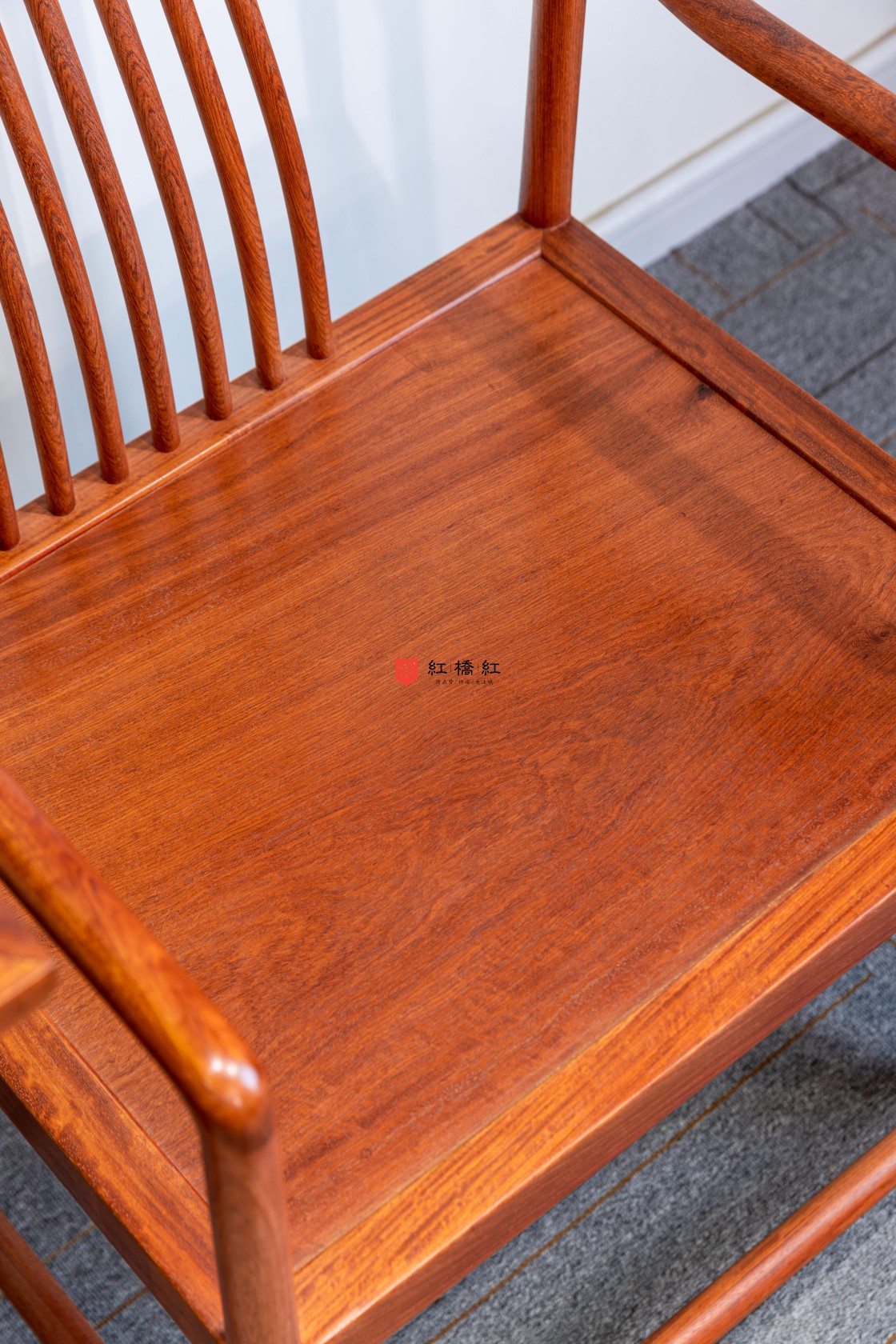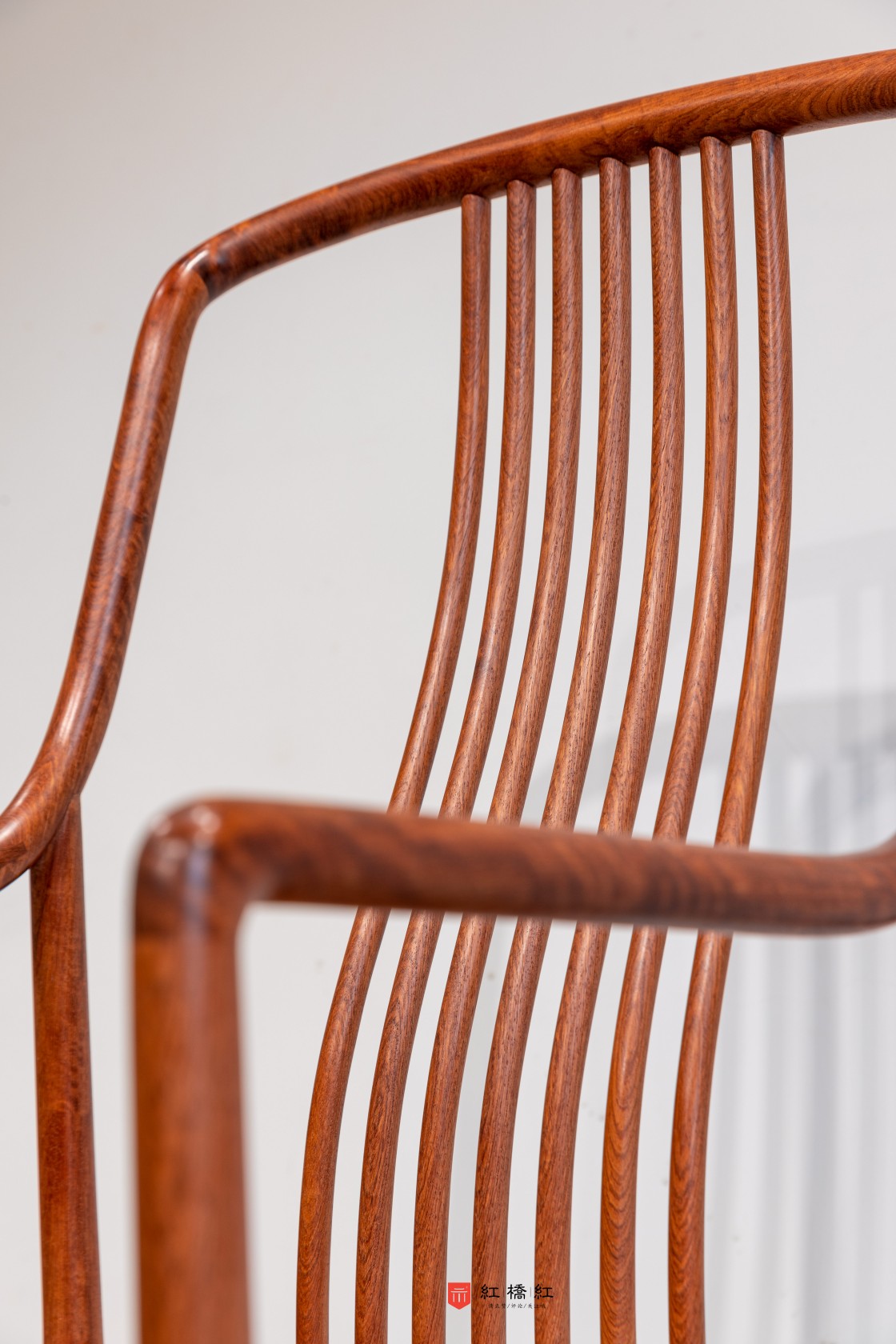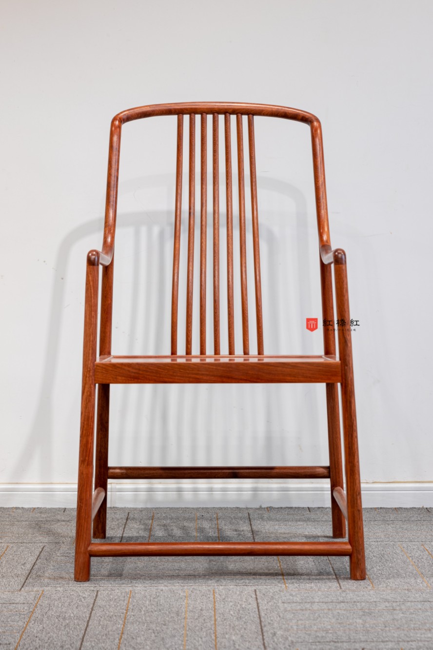 嘉选梳背椅:此扶手椅,风格疏朗通透,富现代气息。以缅甸花梨木制作,全器除座面为四面平的方材、腿足外圆里方外,通体框架采用圆材,整体方圆结合。三弯靠背采用曲棂式样,搭脑与扶手的线条柔婉,以烟袋锅榫结合。