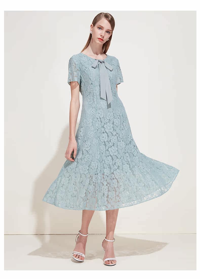 EITIE爱特爱女装夏季短袖蝴蝶结系带修身显瘦蕾丝连衣裙B1907244