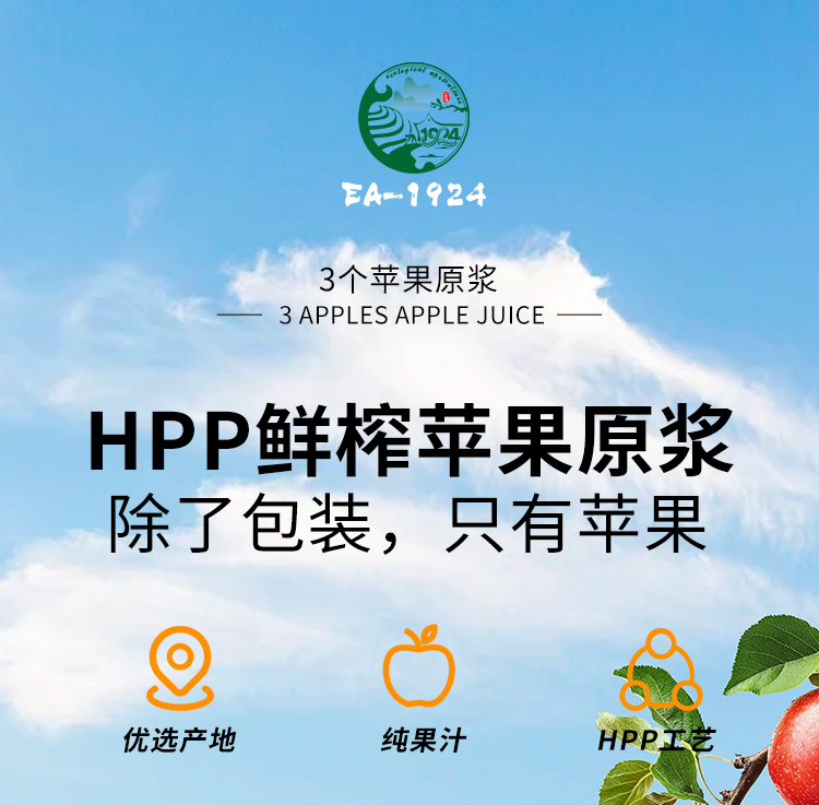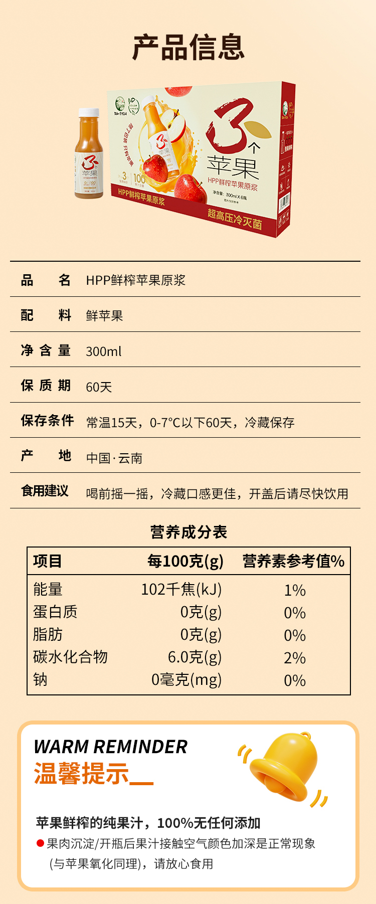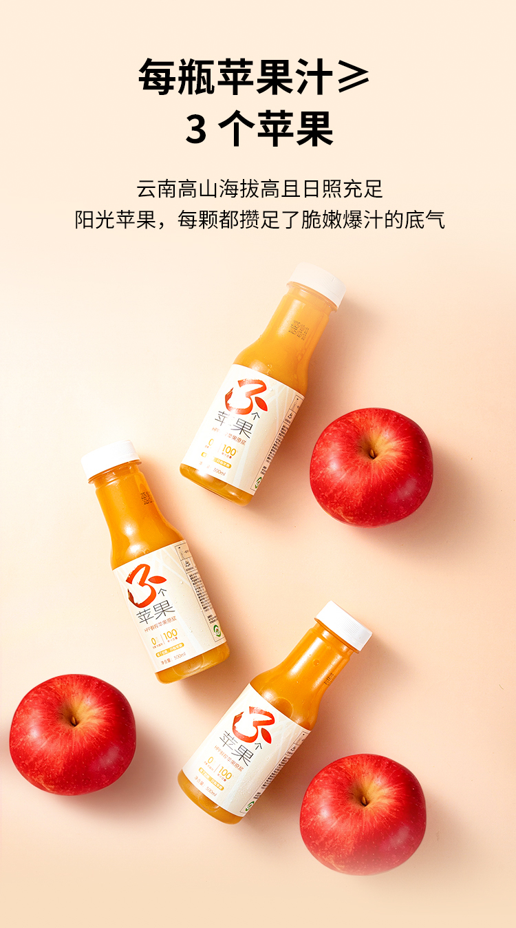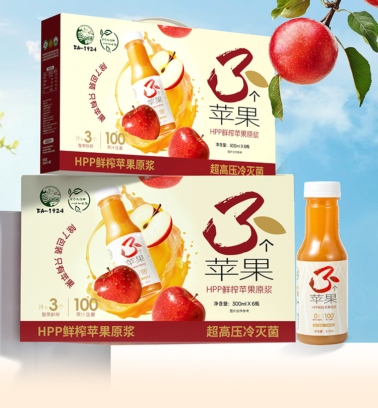 【云南生榨苹果汁】顺丰到家 云南高原“苹果”HPP生榨苹果汁🧃 一瓶=3颗苹果整果鲜榨 不加一滴水、不加一点糖、没有任何添加剂! 只有苹果本身清甜自然的味道,和您放心的纯净配料表 6瓶装