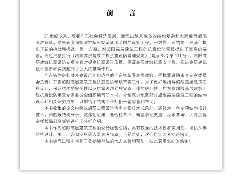 为了更好地指导超限高层建筑工程设计,保证结构的安全性以及抗震设防专项审查工作的规范性,广东省超限高层建筑工程抗震设防审查专家委员会组织编写了本书,以介绍深圳地区部分超限高层建筑结构的工程设计和相关研究成果,给予结构工程师们一些借鉴和帮助。本书收集的论文中除以超限工程设计为主介绍技术成果外,还针对一些专项结构设计技术,如超限结构分析、黏滞阻尼器、叠合柱节点、新型滑动支座、拉索幕墙、大跨度复杂楼板局部降板等进行了分析介绍。