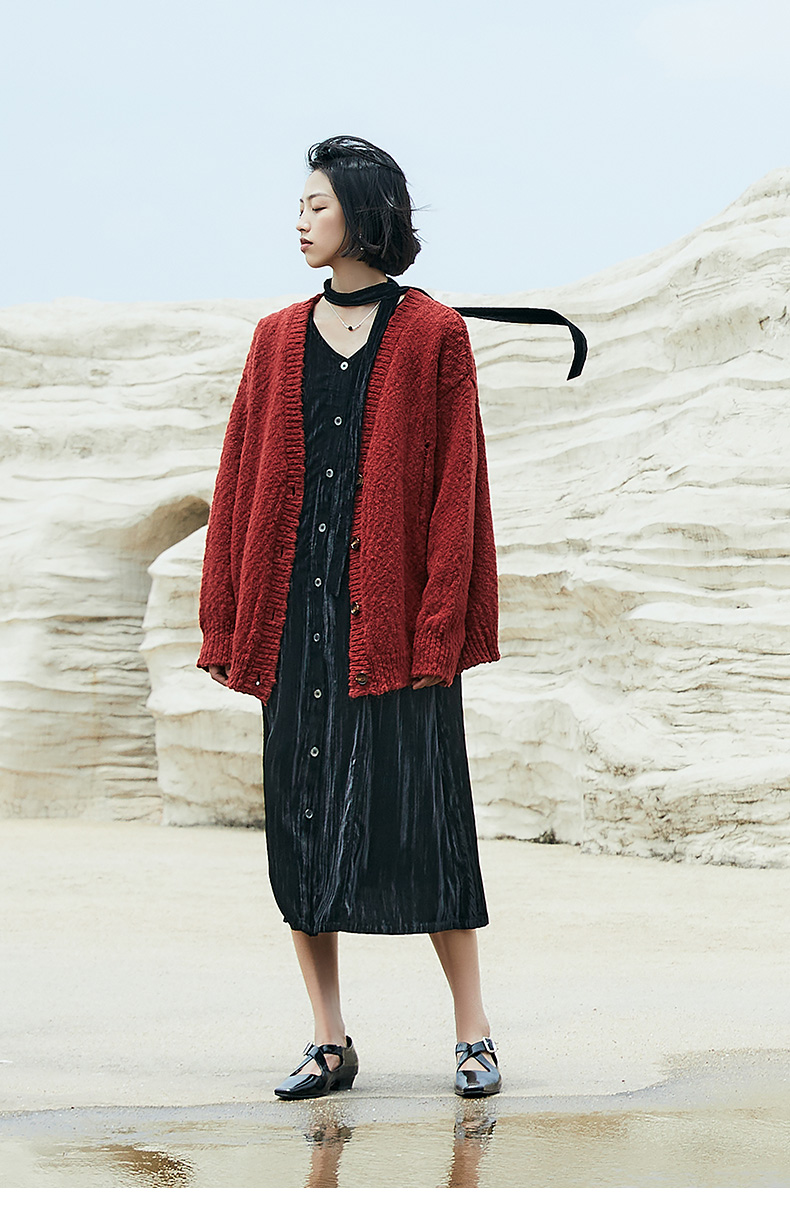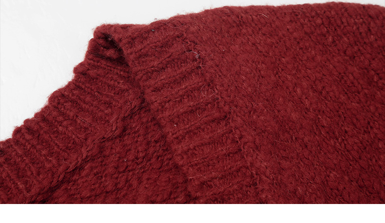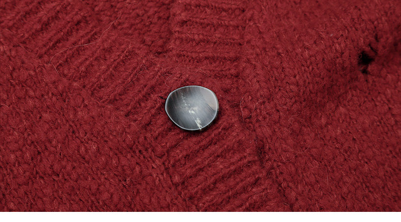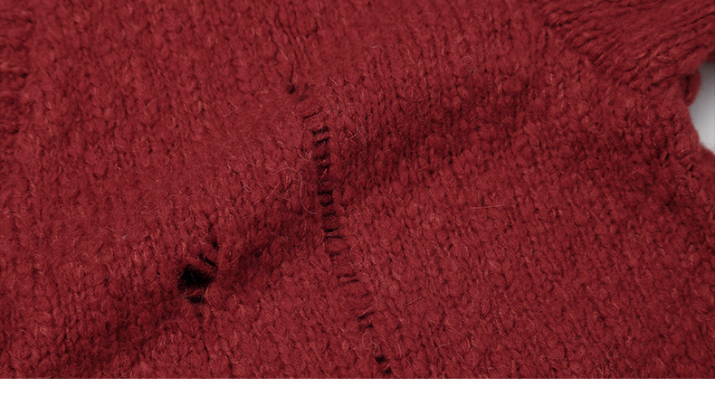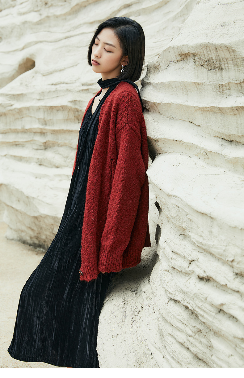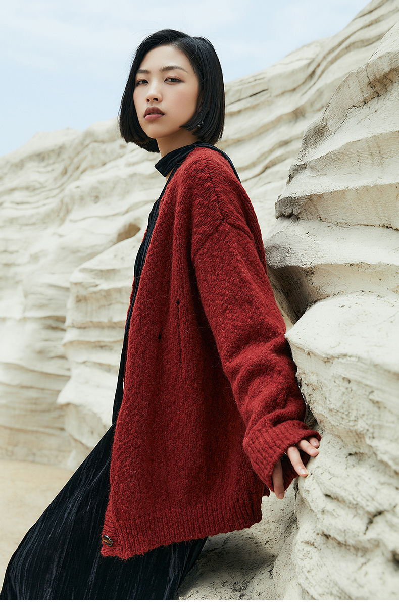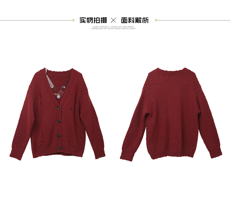 复古红 V 领针织开衫女秋冬新款慵懒风宽松显瘦破洞设计感毛衣外套外穿