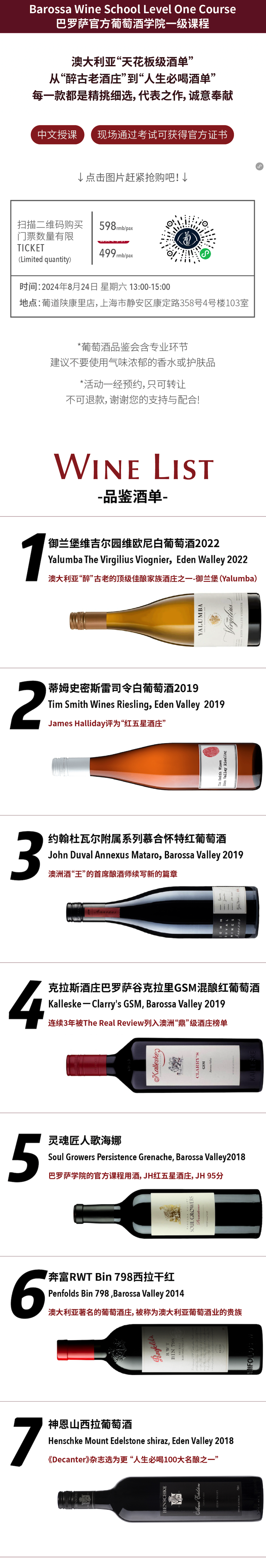 💰价格:会员499元/人,非会员680/人 包含报名、教材、官方讲师、考试、证书和品尝巴罗萨精选葡萄酒!酒款从6款升级到7款