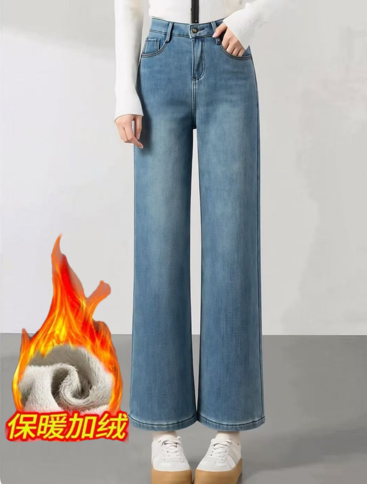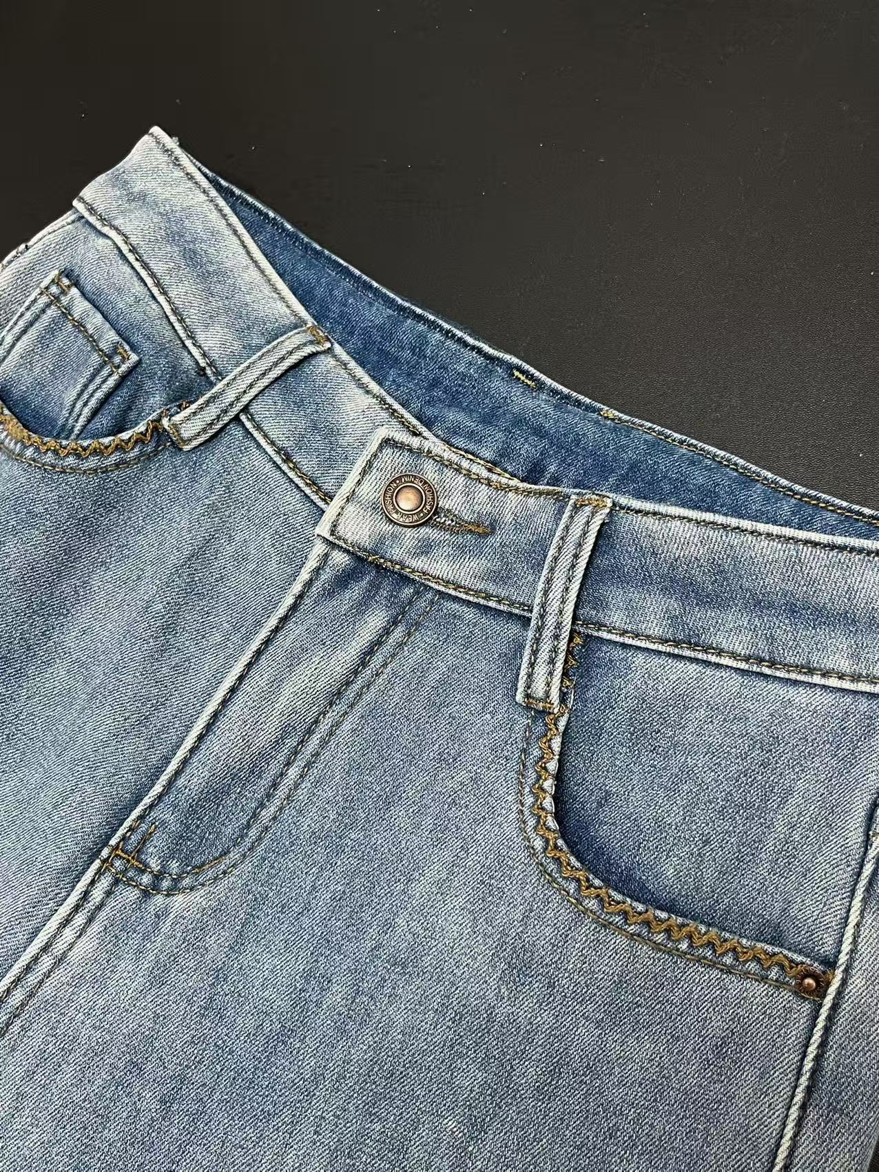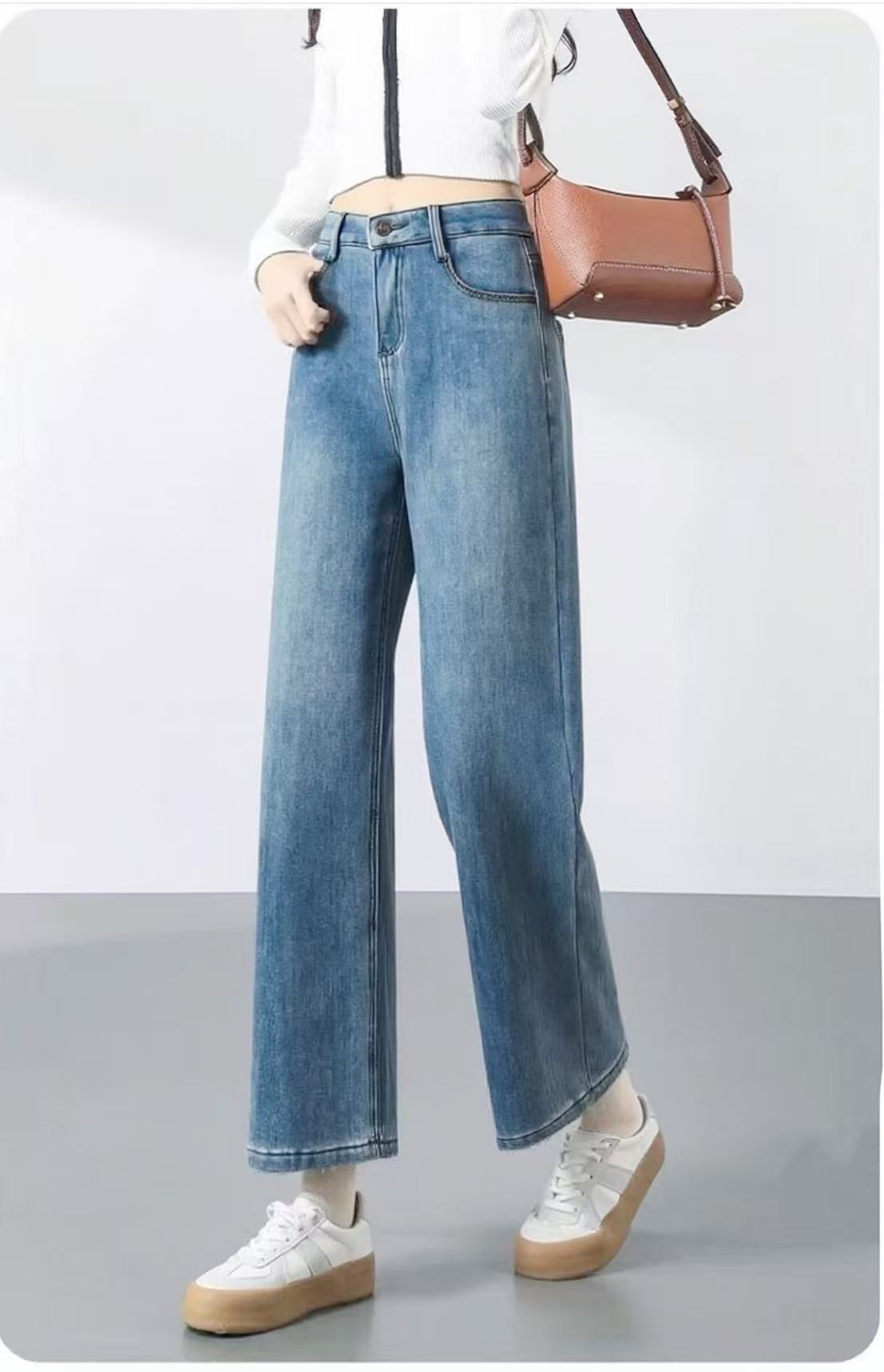 🔥🔥【2025爆款牛仔】波浪边口袋密密绒~6883窄版小个子气质冬季加绒牛仔直筒裤-喜出