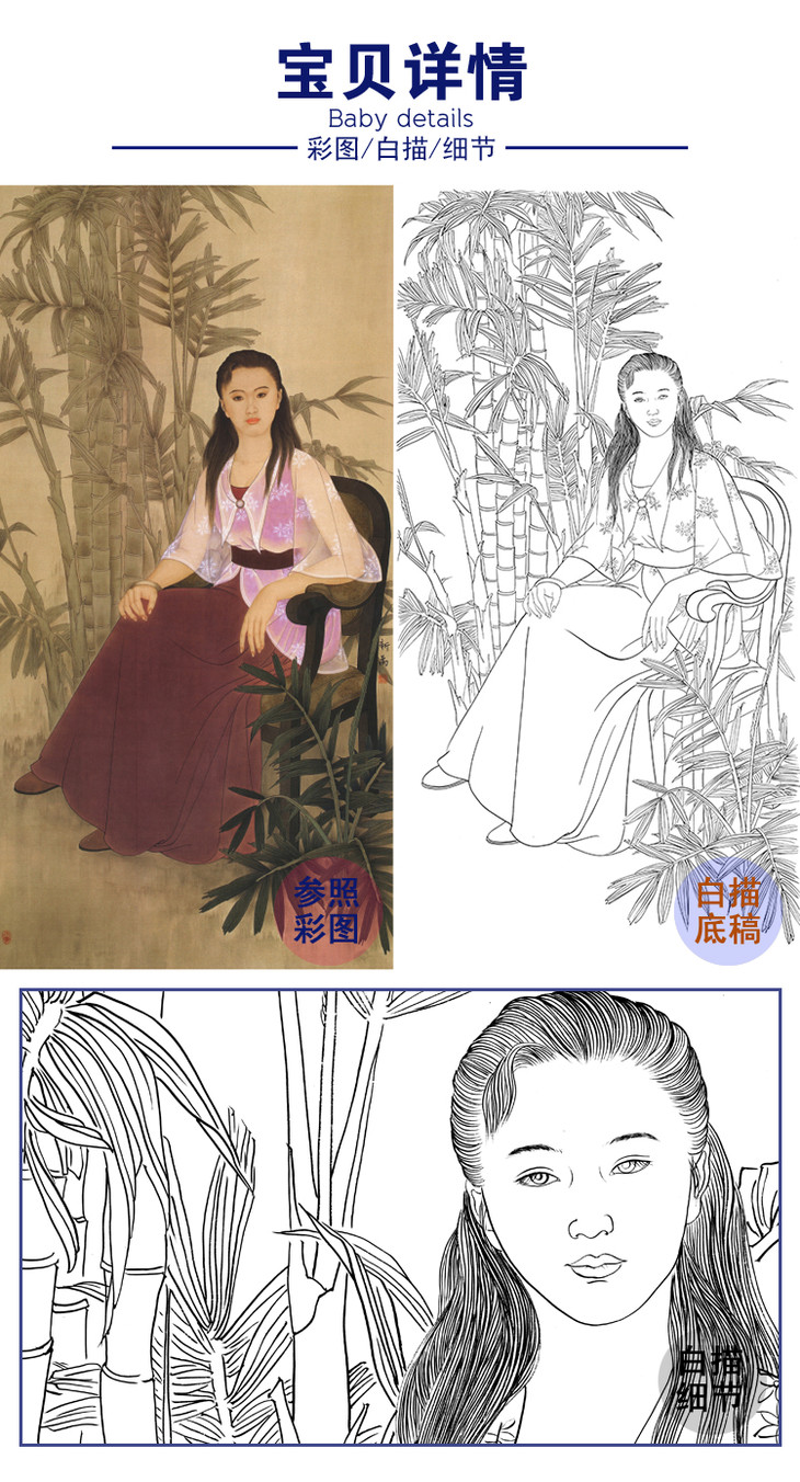 竖幅工笔传统仕女人物白描底稿-杨淑涛-芭蕉仕女-B050