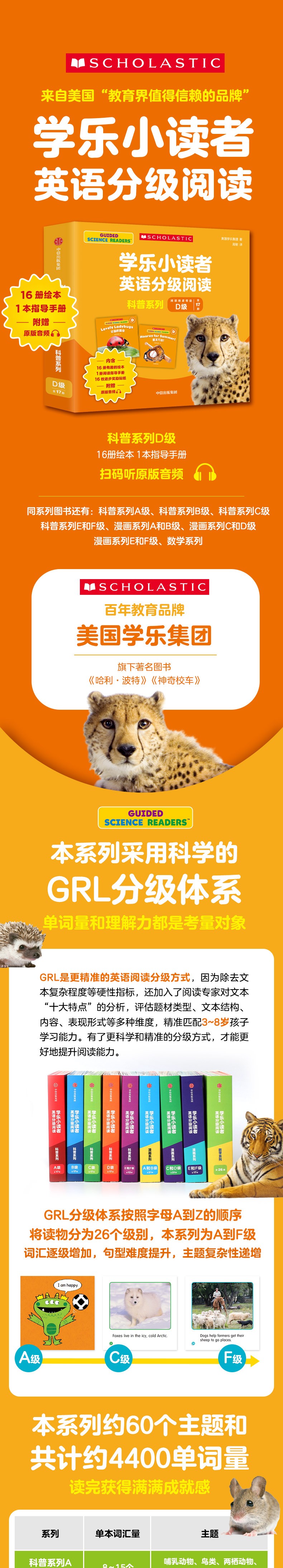 3.科学的GRL分级体系,更适合中国小孩。GRL分级加入阅读专家对文本的主观分析,评估题材类型、文本结构、内容、表现形式等多种维度,精准匹配孩子的学习能力。