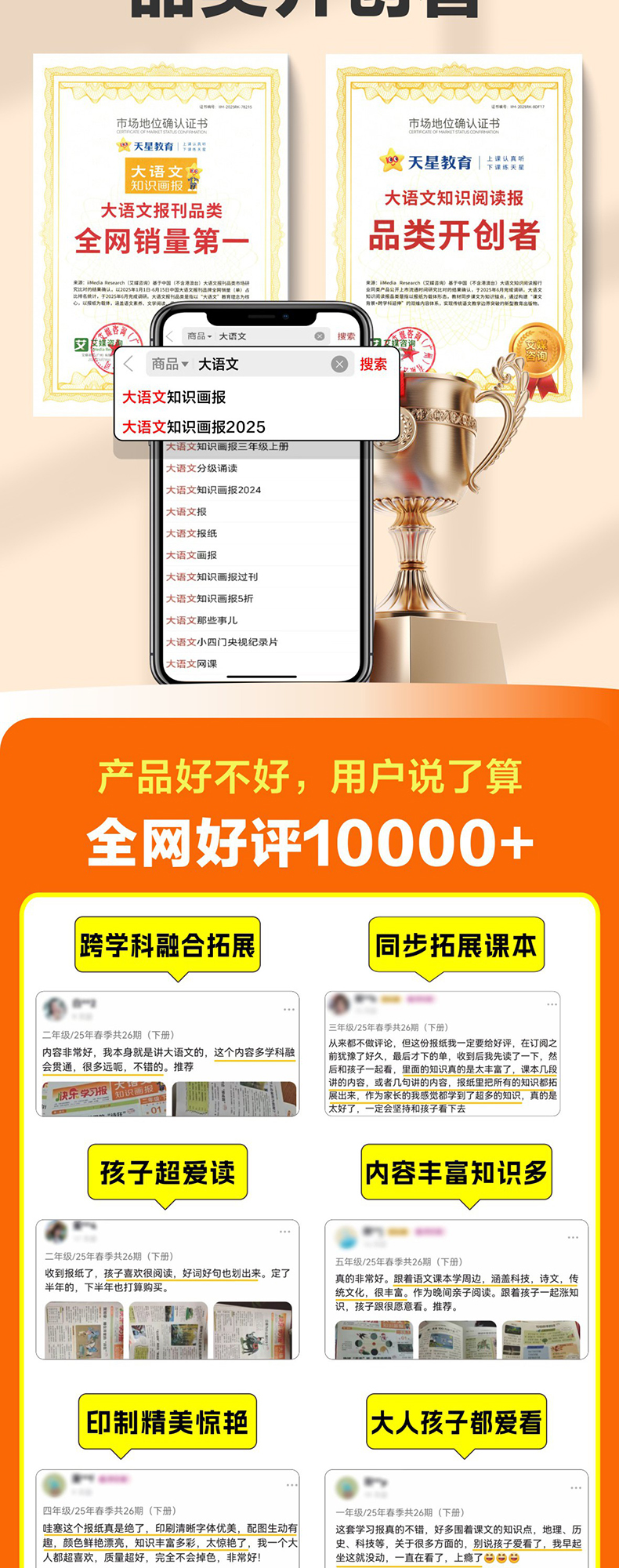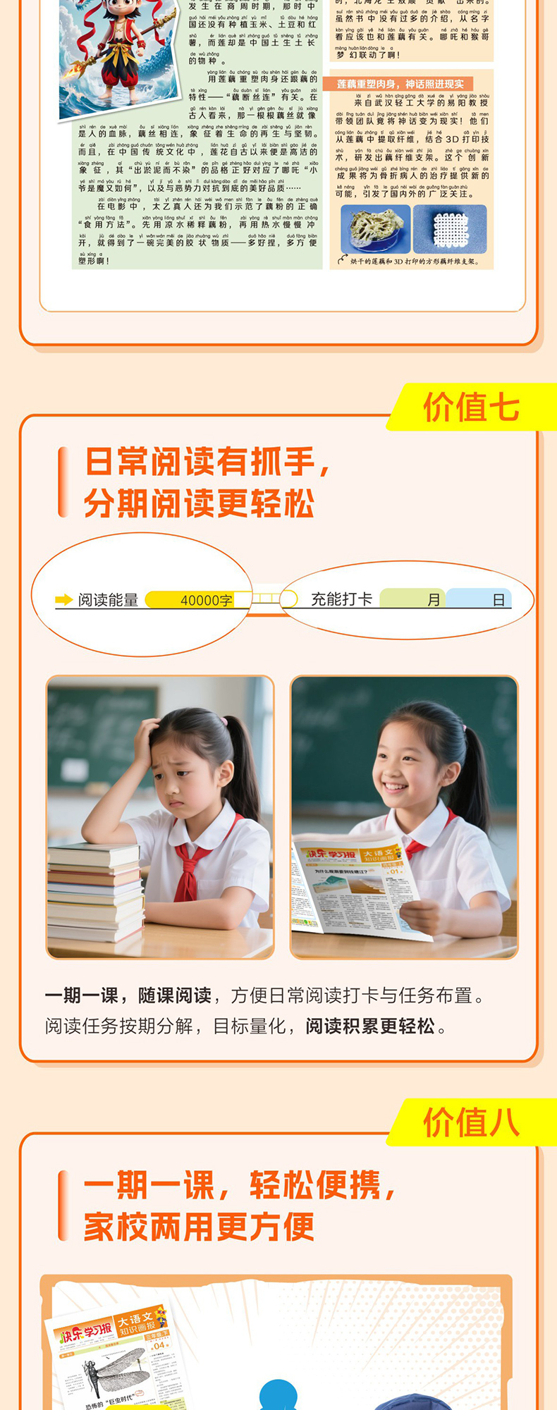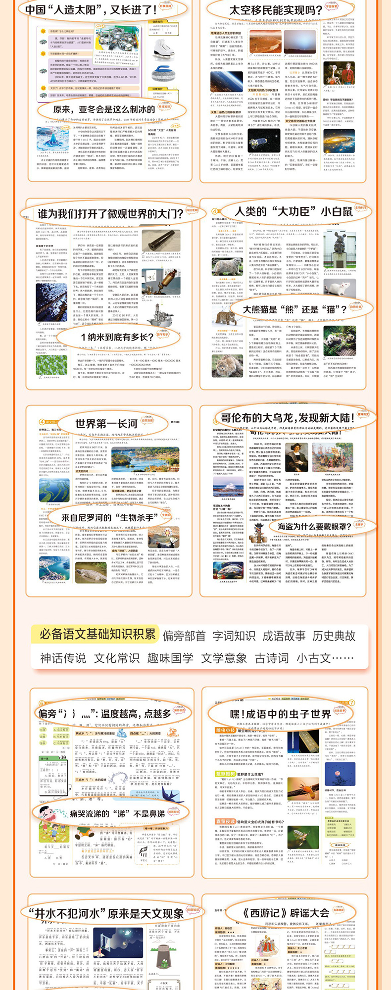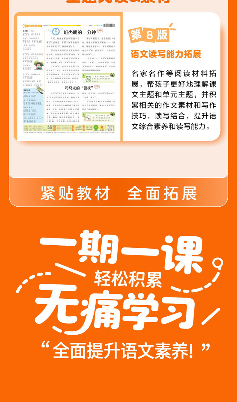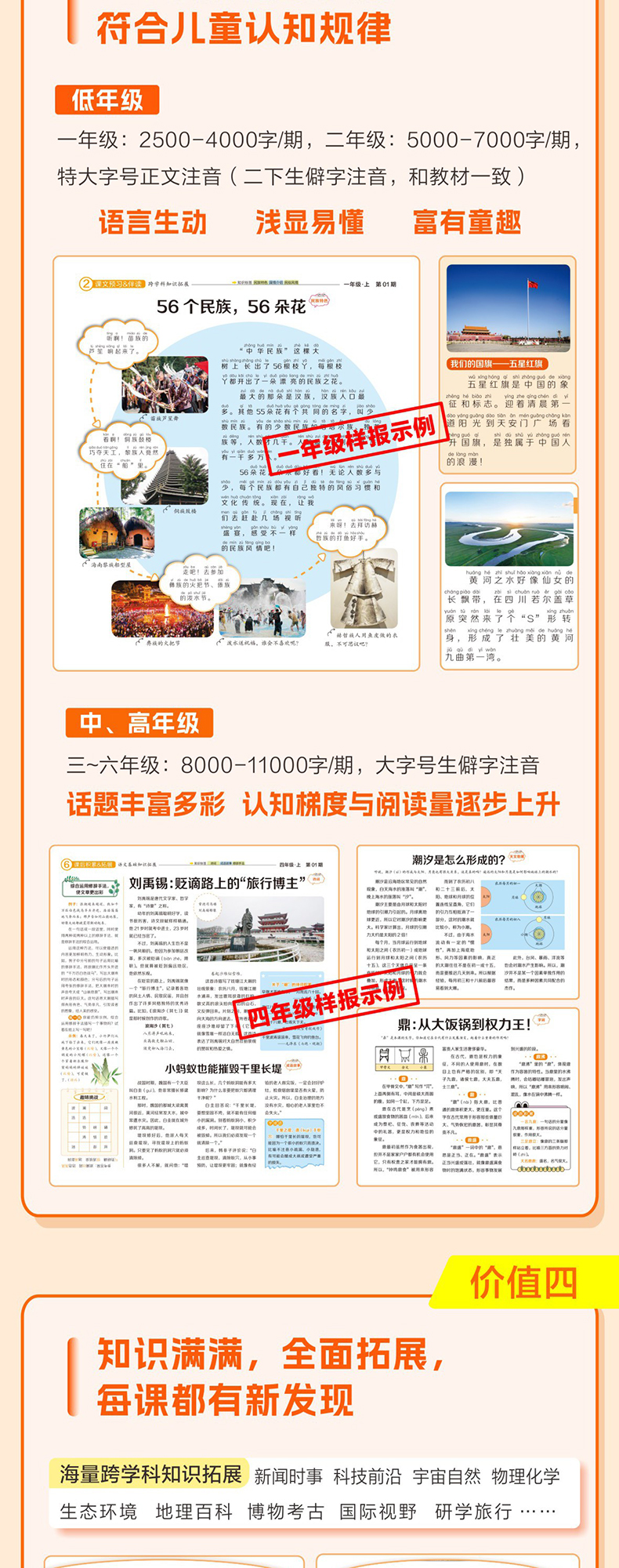内容介绍:《大语文知识画报》是大语文知识阅读报品类开创者。报纸紧扣小学语文课本,一期一课,同步拓展。它以教材为核心,巧妙融合历史、文化、科学、时事等跨学科知识,有效帮助孩子课前预习、课文伴读与课后积累,通过知识带动阅读,全面提升语文能力。内容干货满满,便携易读,家校两用都方便。本报一经上市,很快便取得了大语文报刊品类全网销量第一的成就。