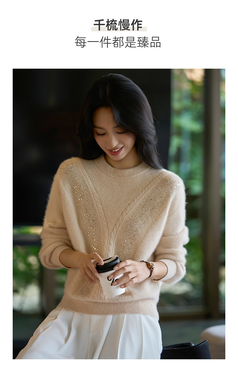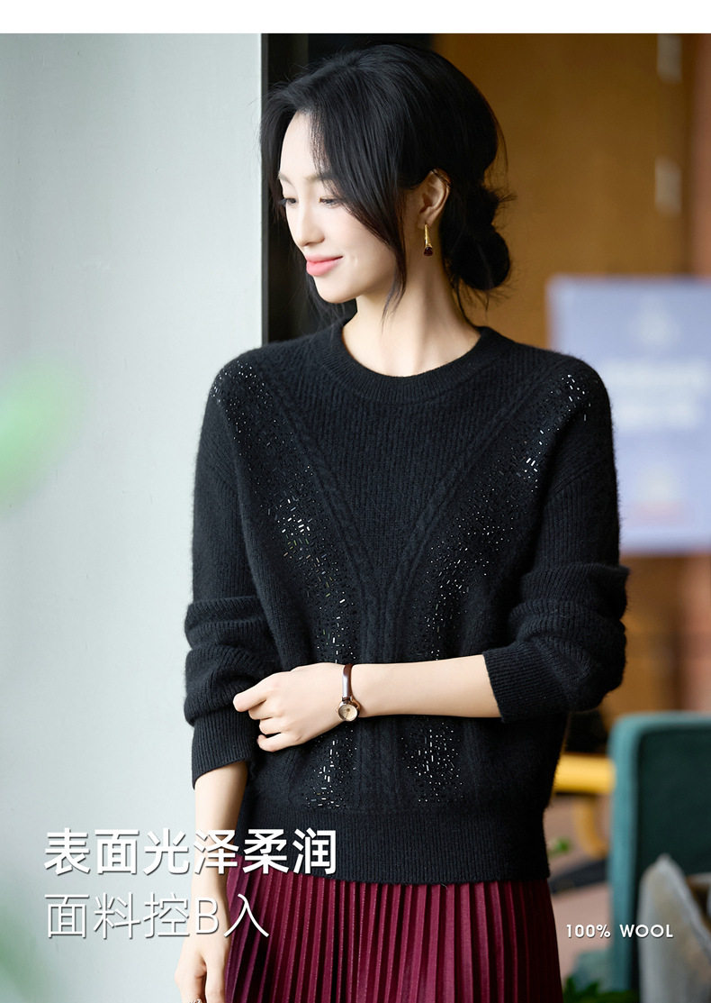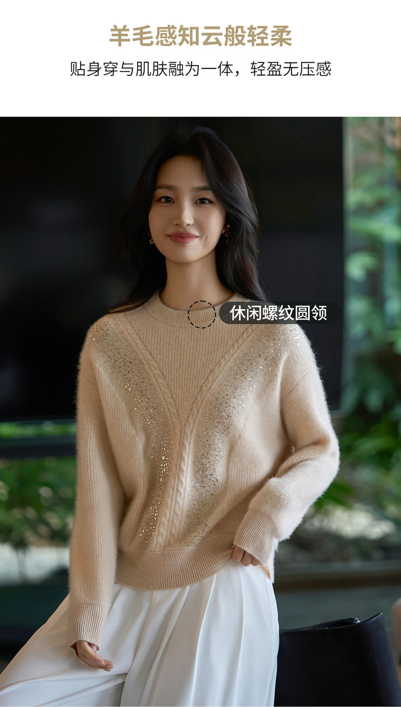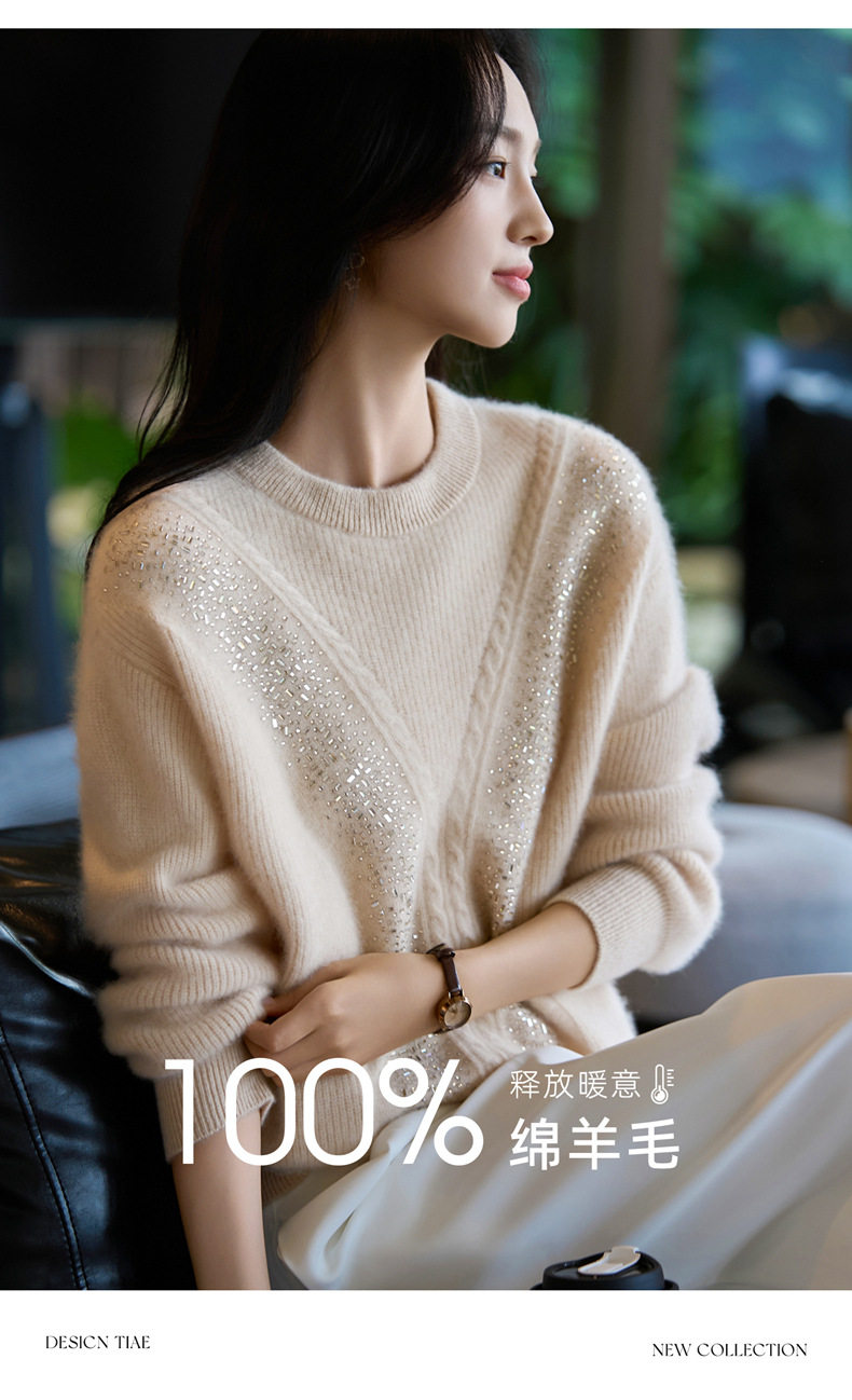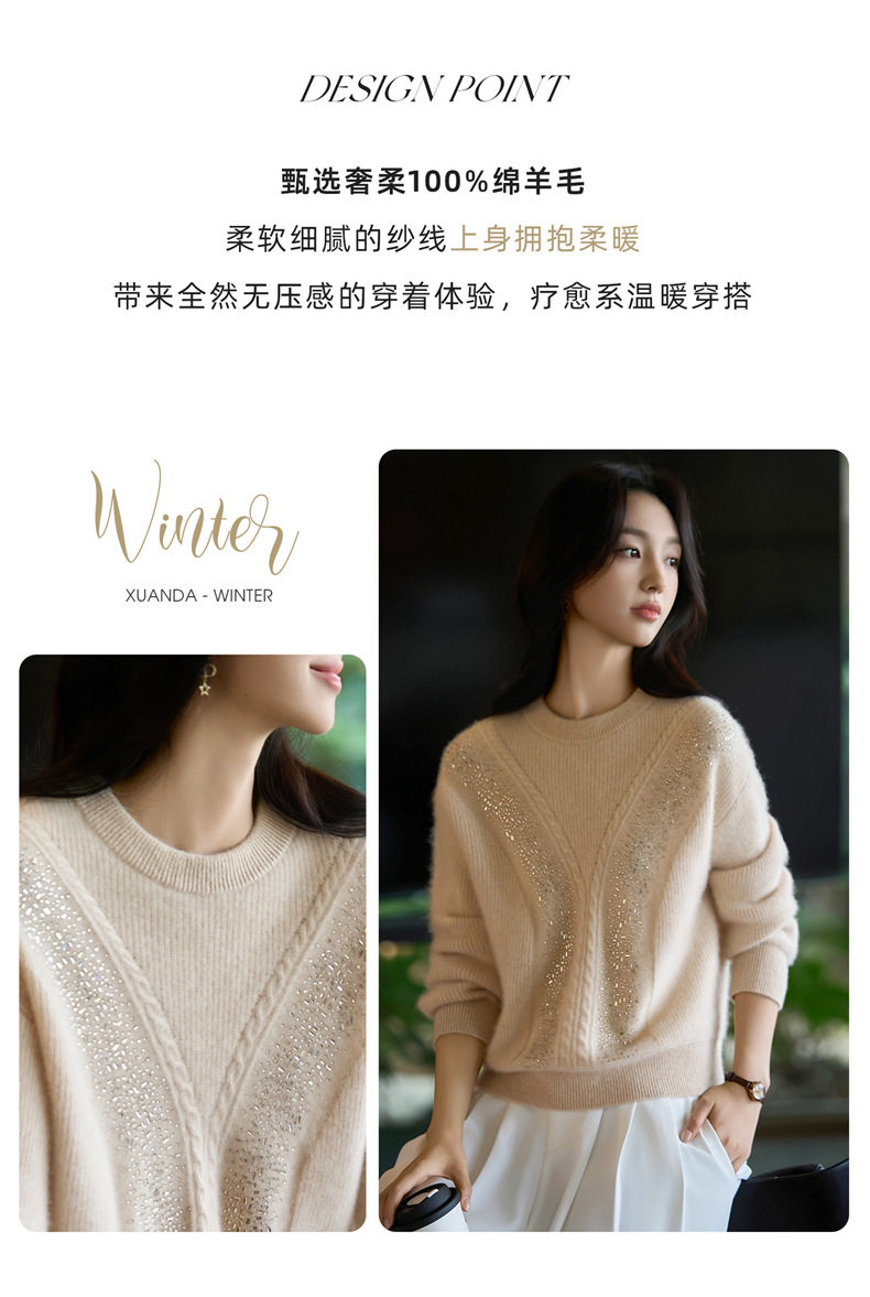 「自」全新升级【铂金会员257/天猫339/差价82】(22809)洛诗琳气质圆领加厚羊毛衫2025冬季重工烫钻长袖宽松针织毛衣
