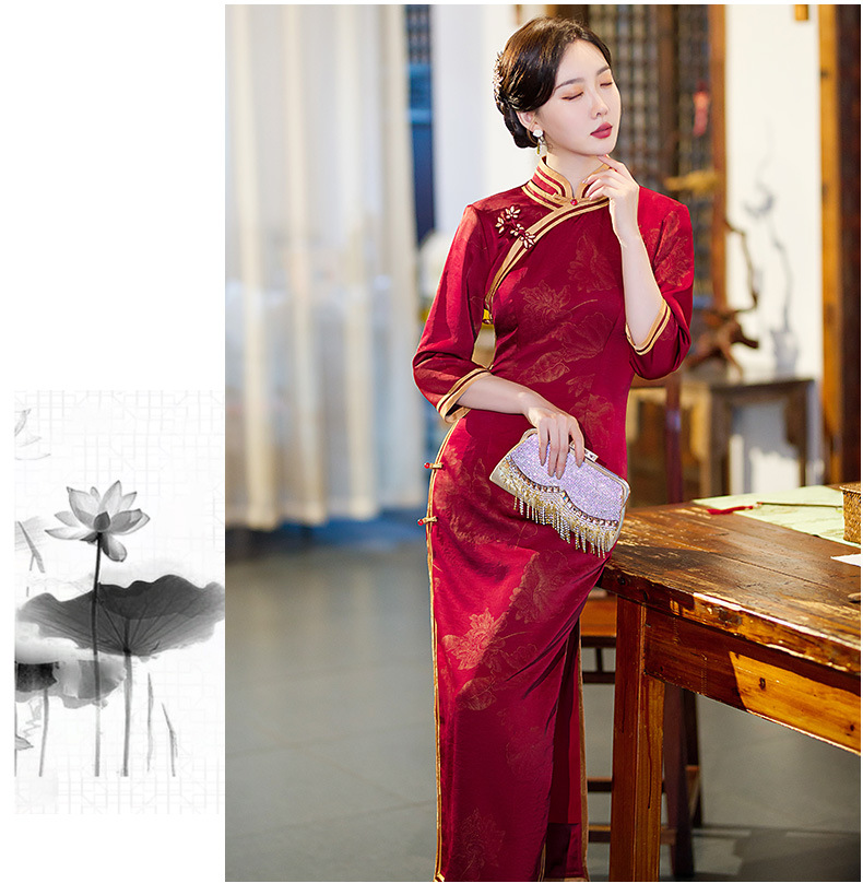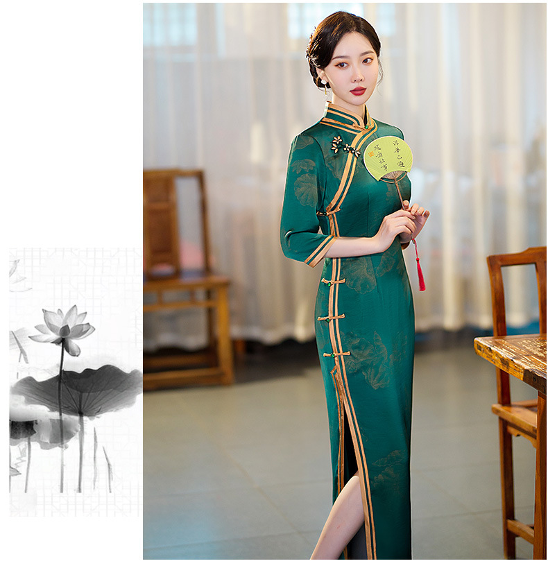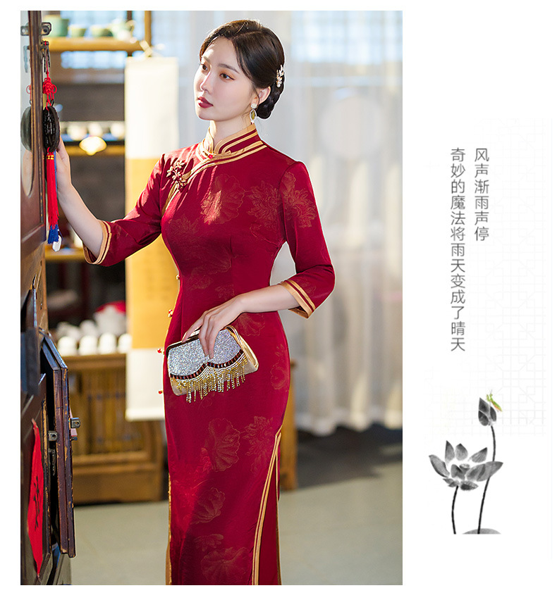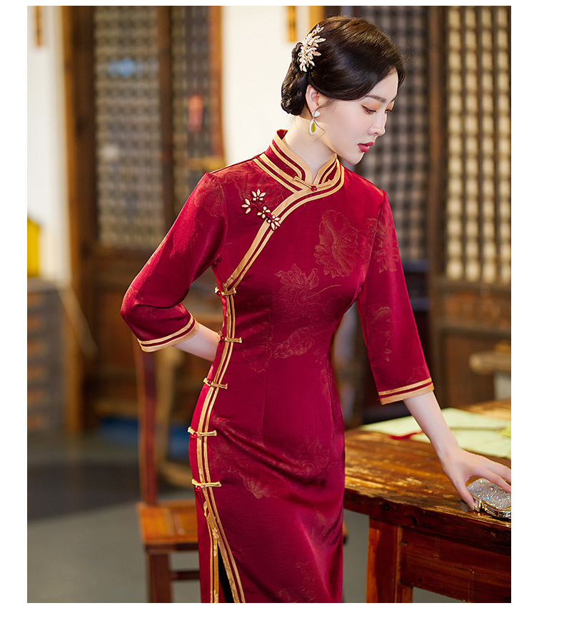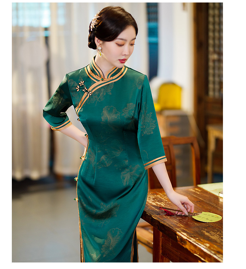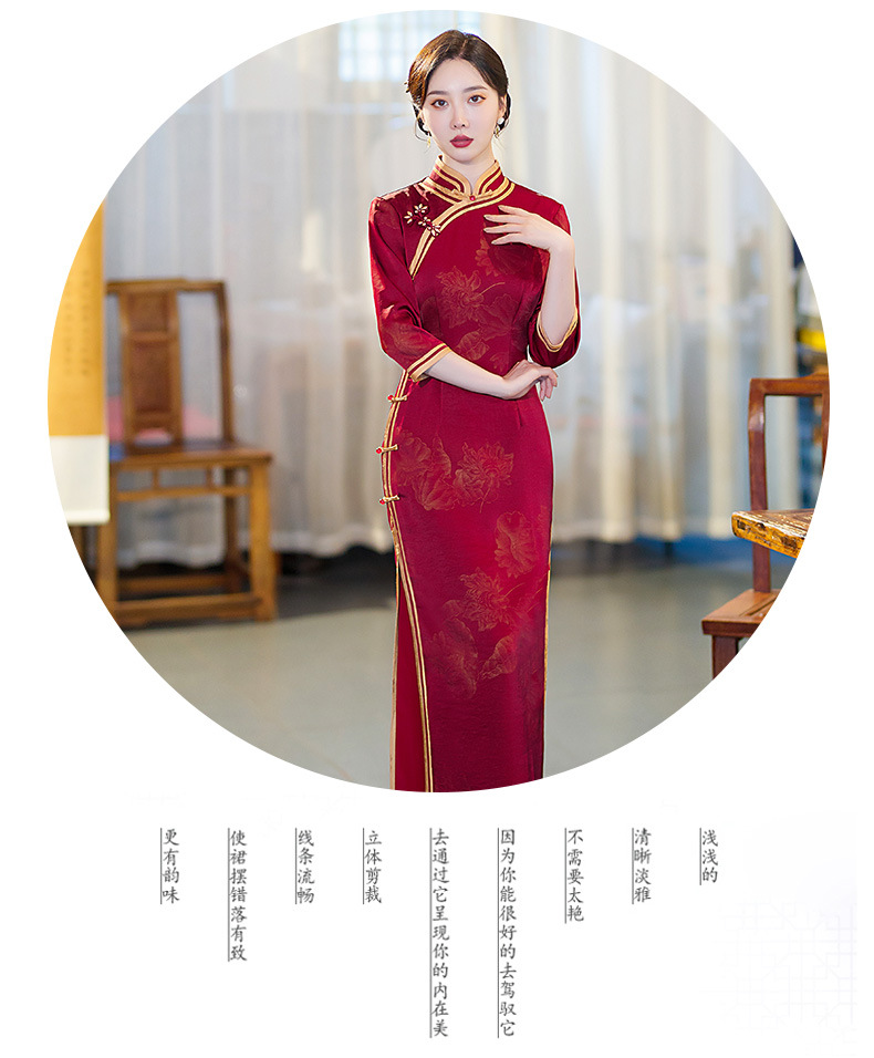 GSJ-9093复古长款蚀骨仿醋酸中国风七分袖立领旗袍
