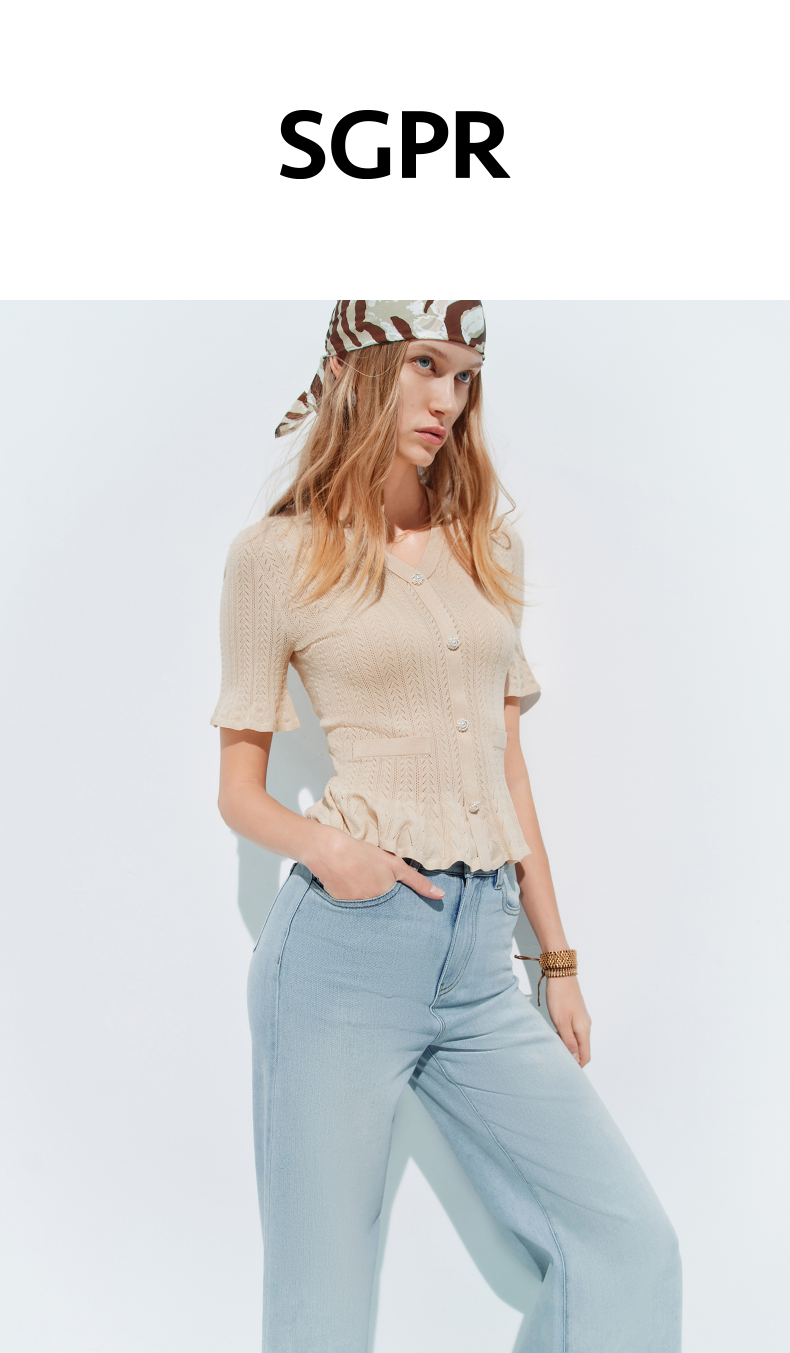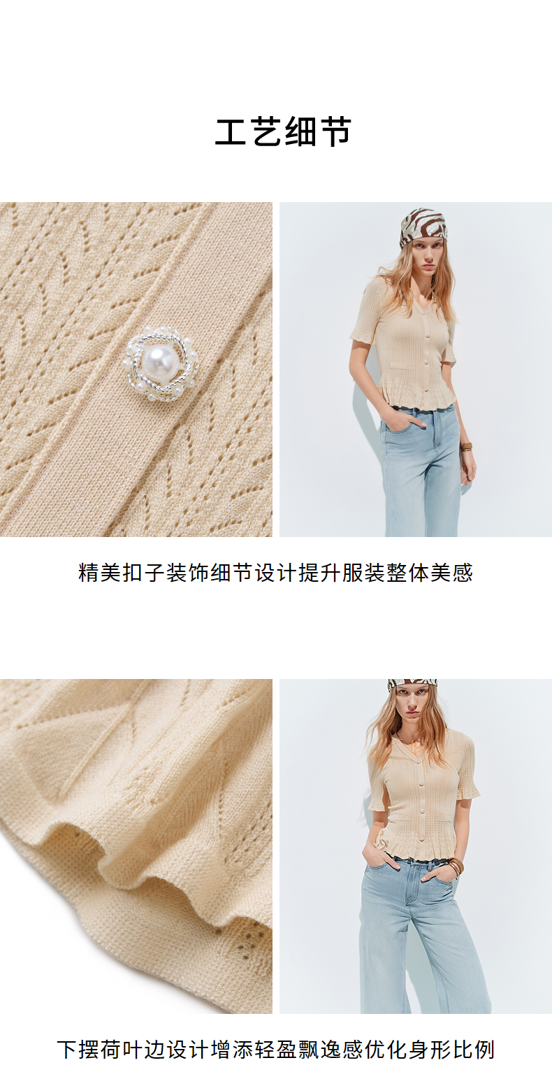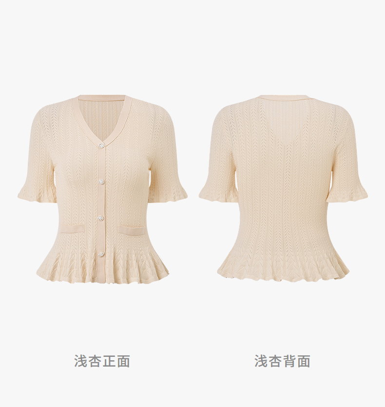 【SGPR】浅杏色收腰修身上衣2026年夏季新款短袖荷叶边针织衫毛衣(货号:MU80SW004)