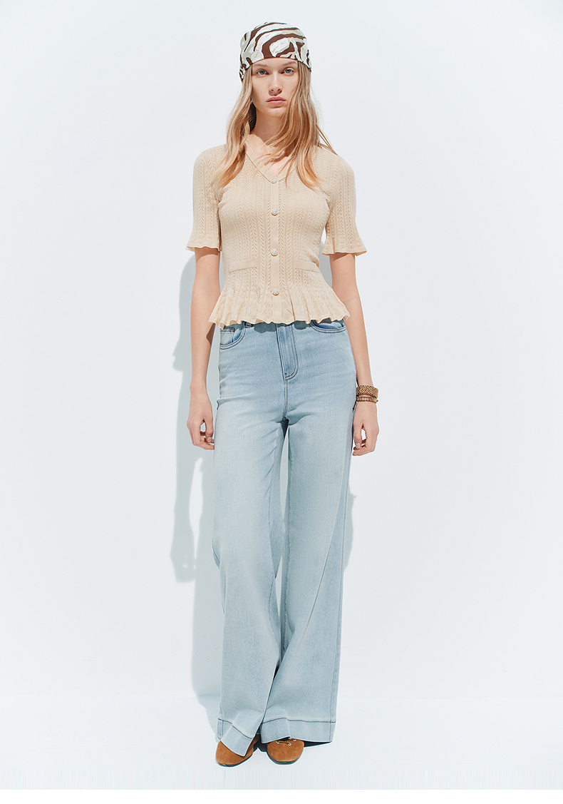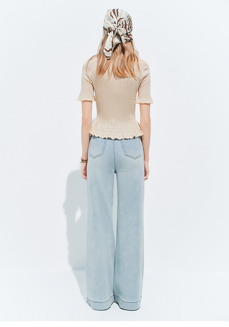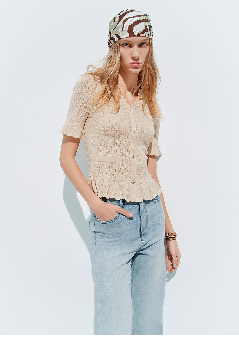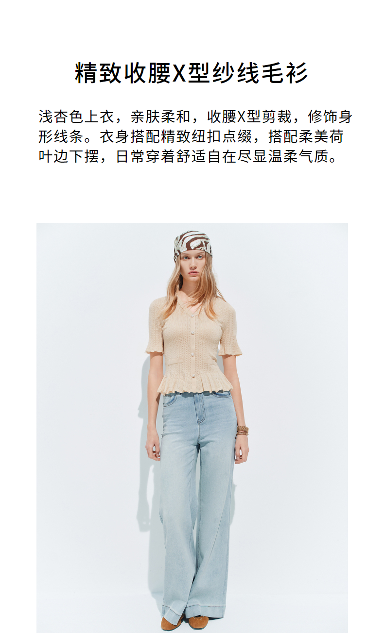 【SGPR】浅杏色收腰修身上衣2026年夏季新款短袖荷叶边针织衫毛衣(货号:MU80SW004)