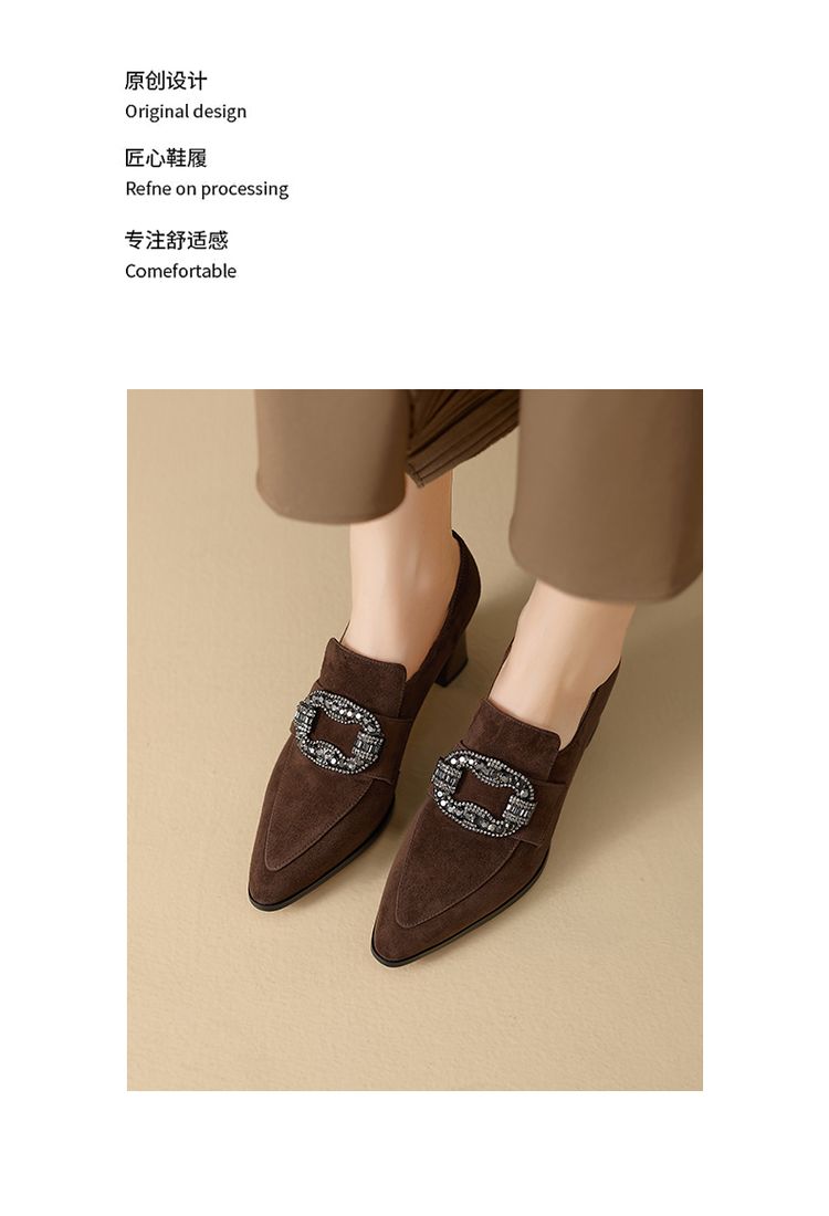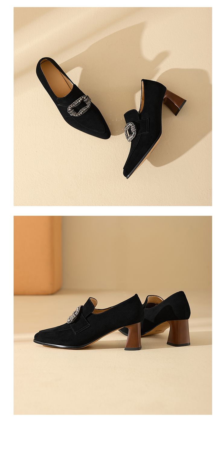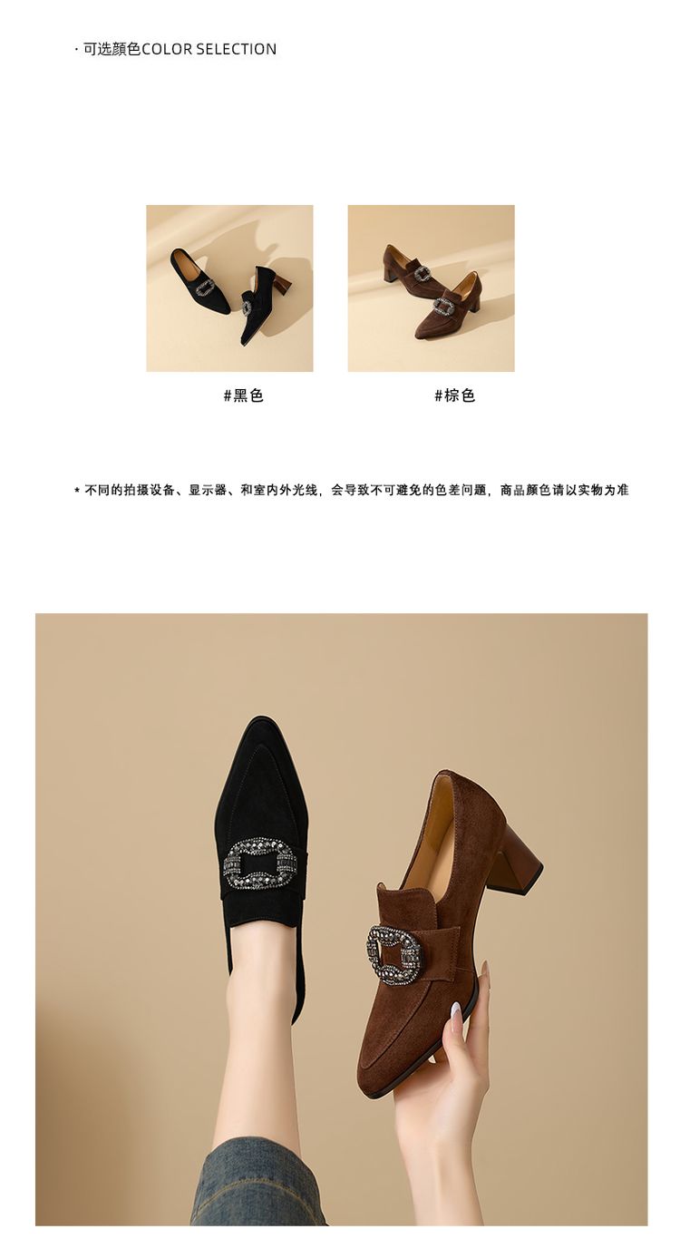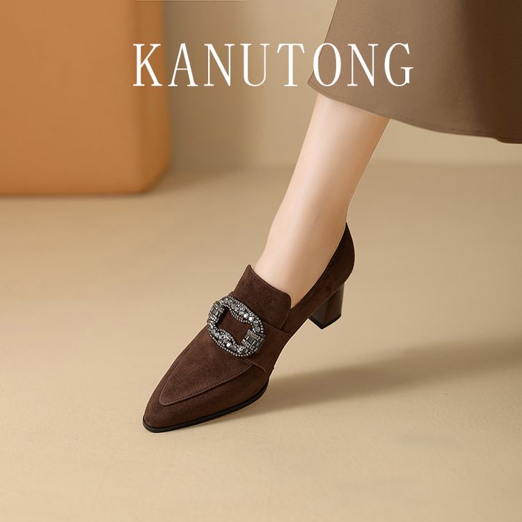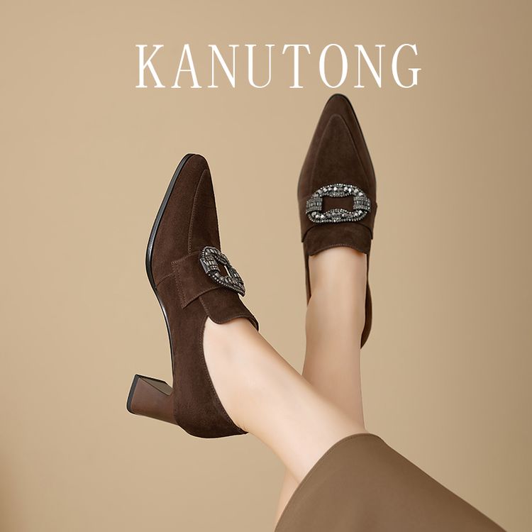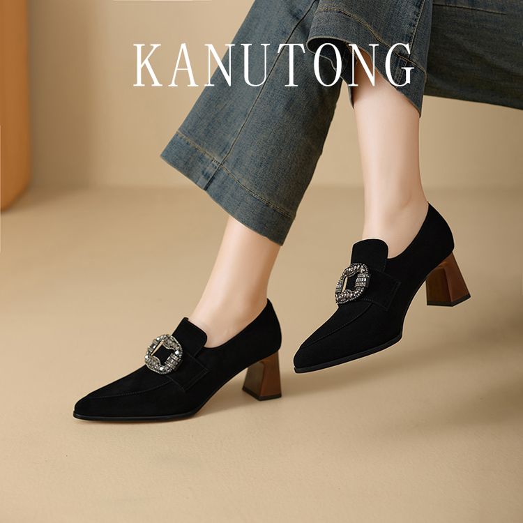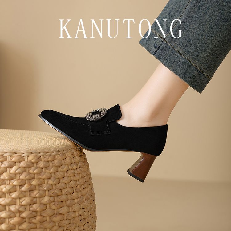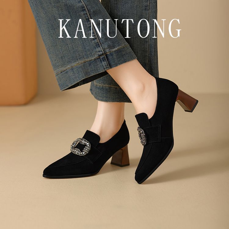 【预售5天】复古磨砂高跟鞋女春秋新款尖头粗跟水钻方扣真皮深口单鞋百搭女鞋KNTNX&KT1687
