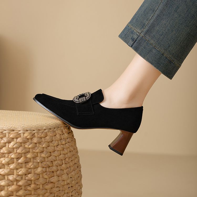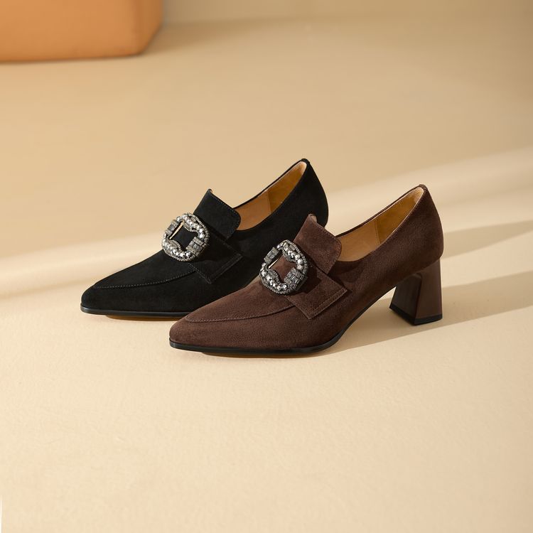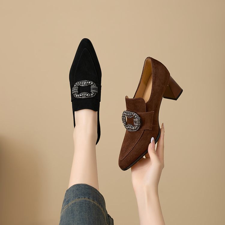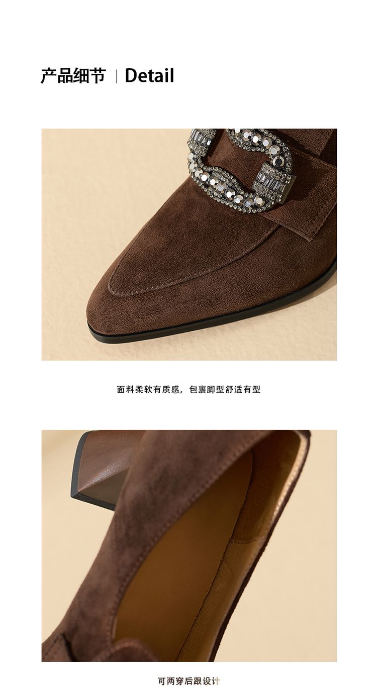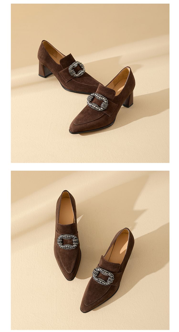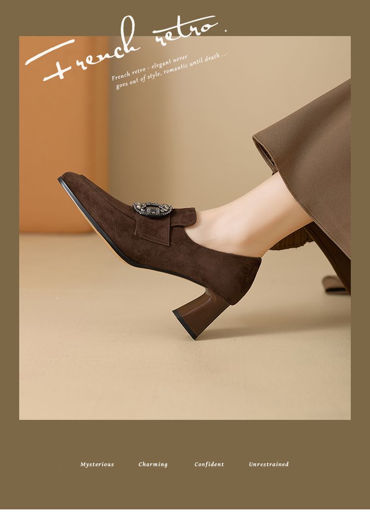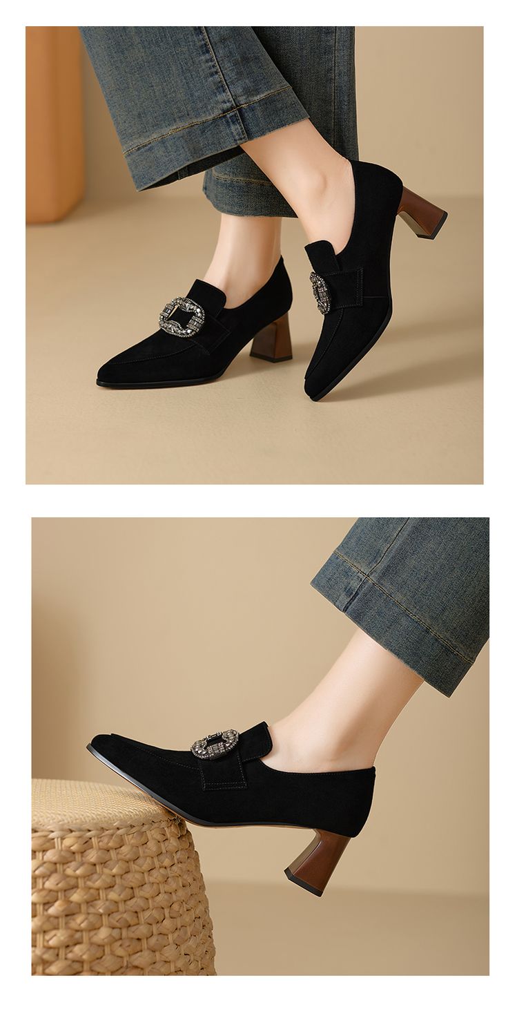 【预售5天】复古磨砂高跟鞋女春秋新款尖头粗跟水钻方扣真皮深口单鞋百搭女鞋KNTNX&KT1687