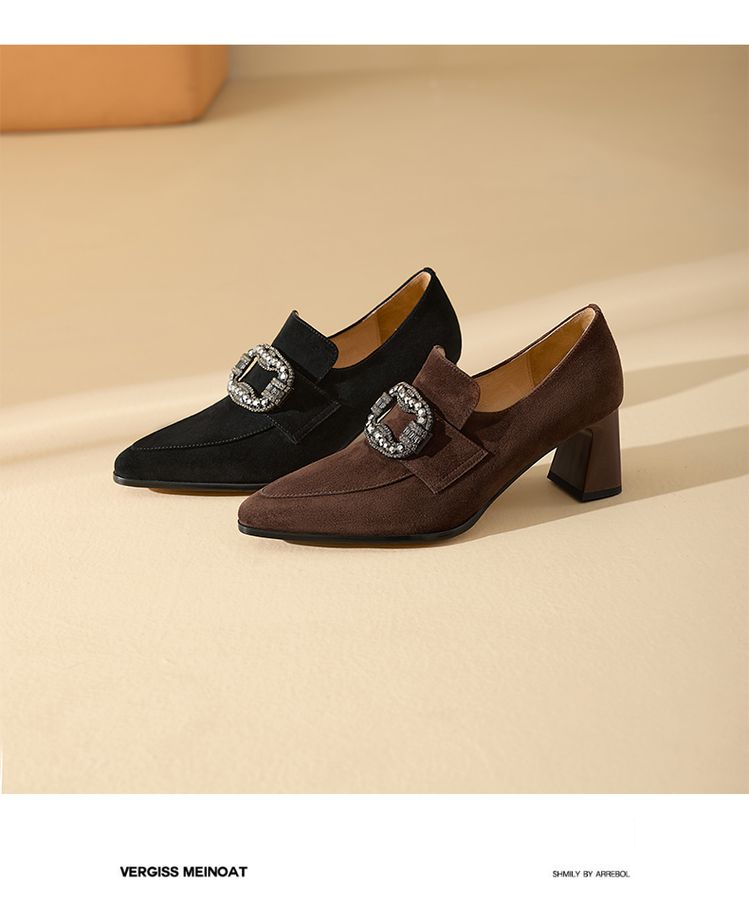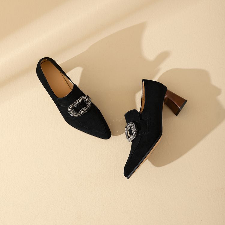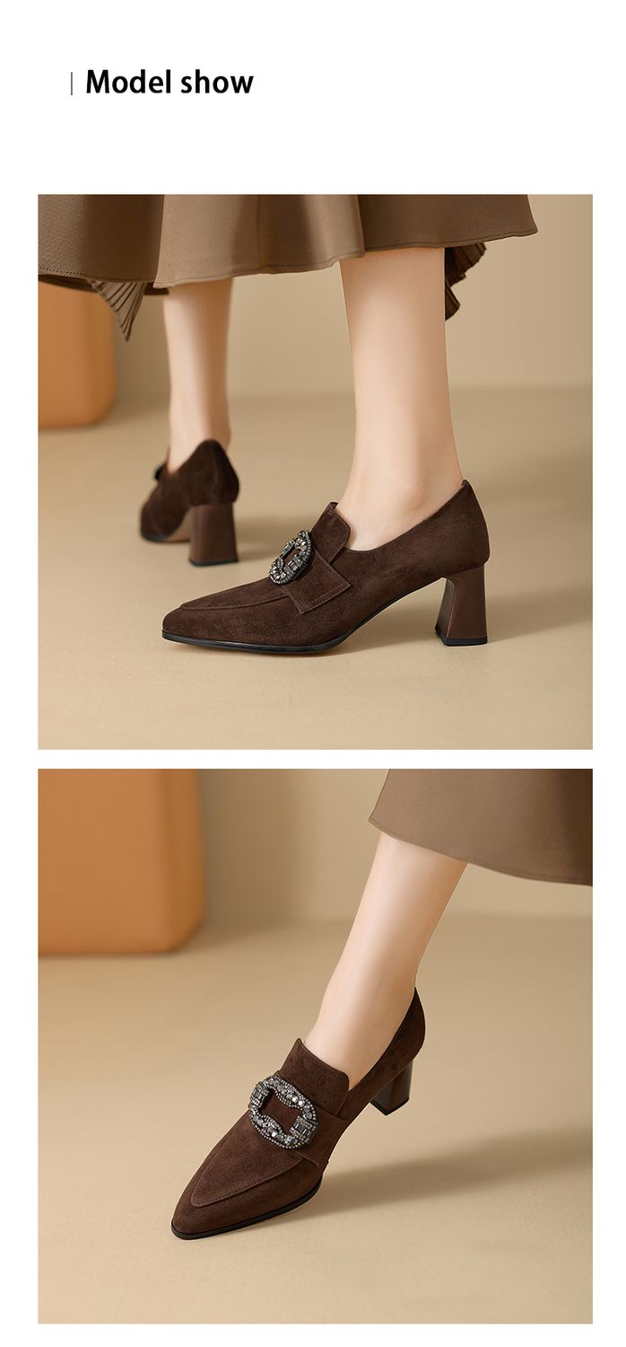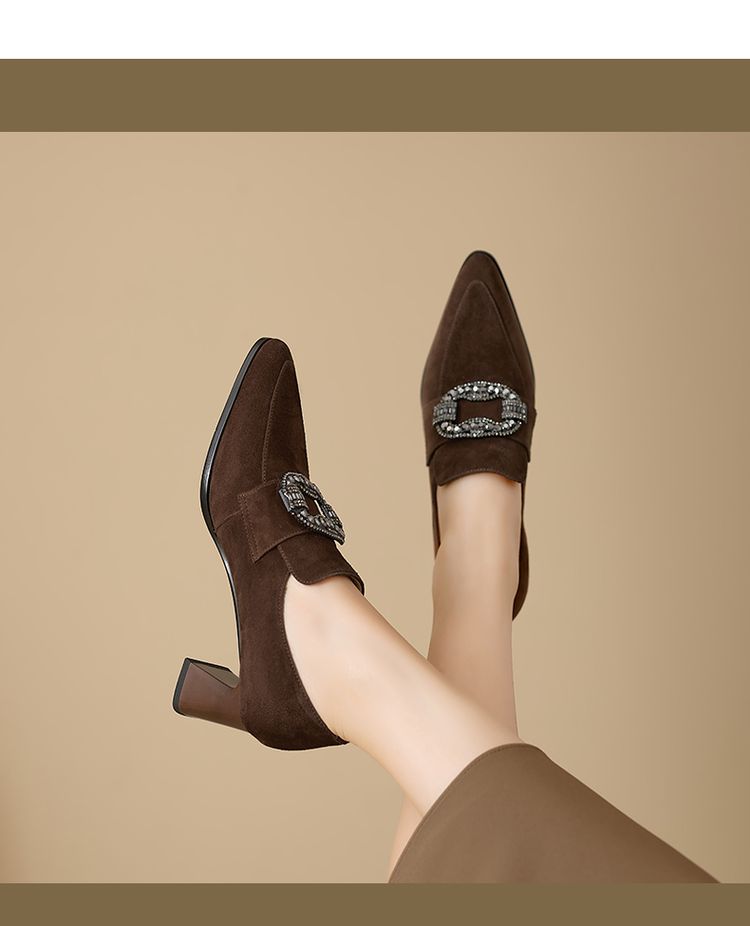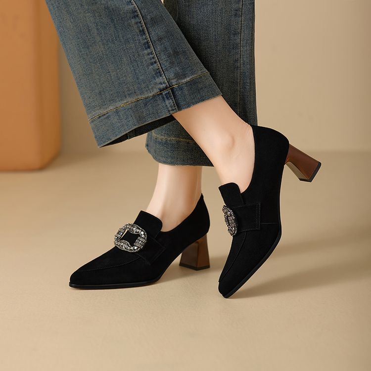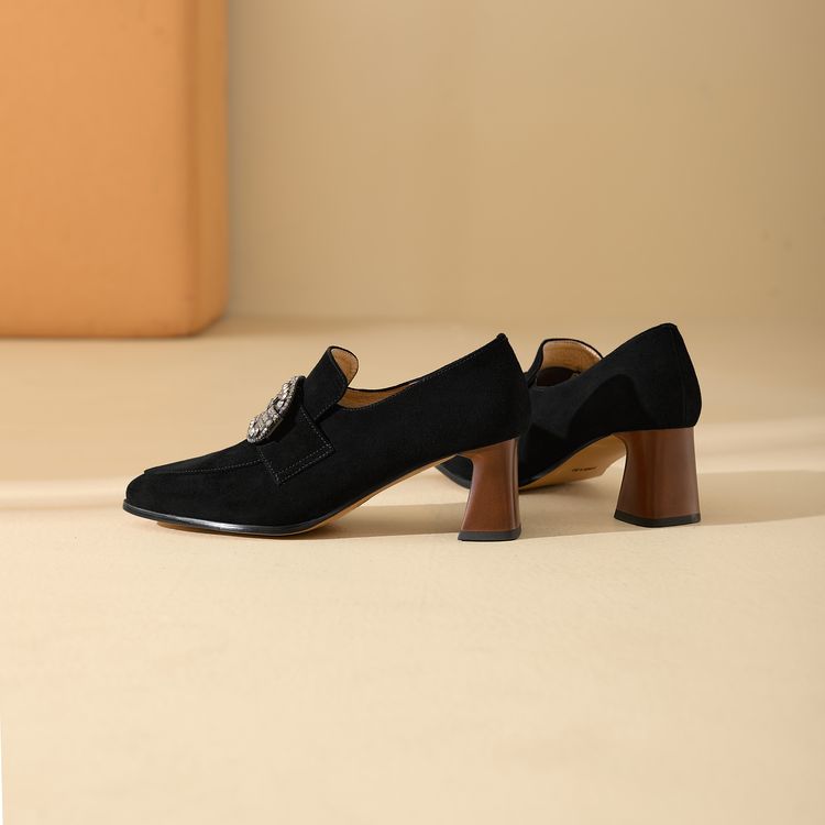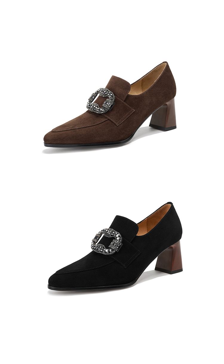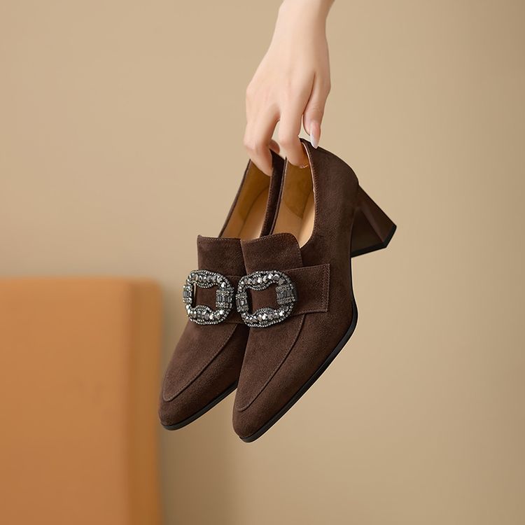 【预售5天】复古磨砂高跟鞋女春秋新款尖头粗跟水钻方扣真皮深口单鞋百搭女鞋KNTNX&KT1687