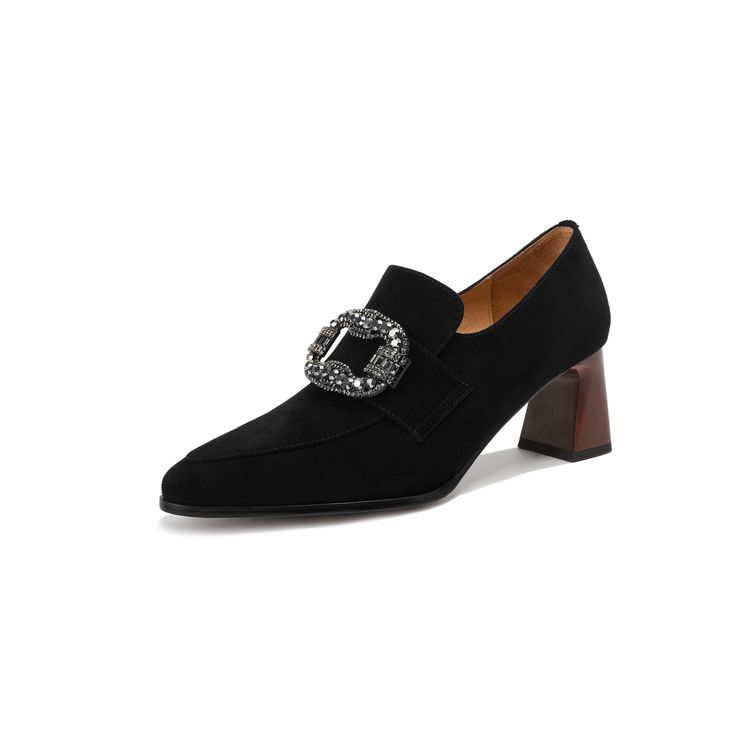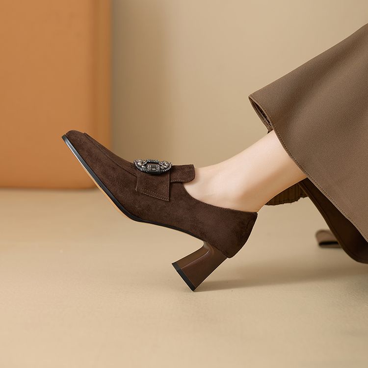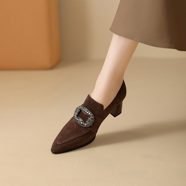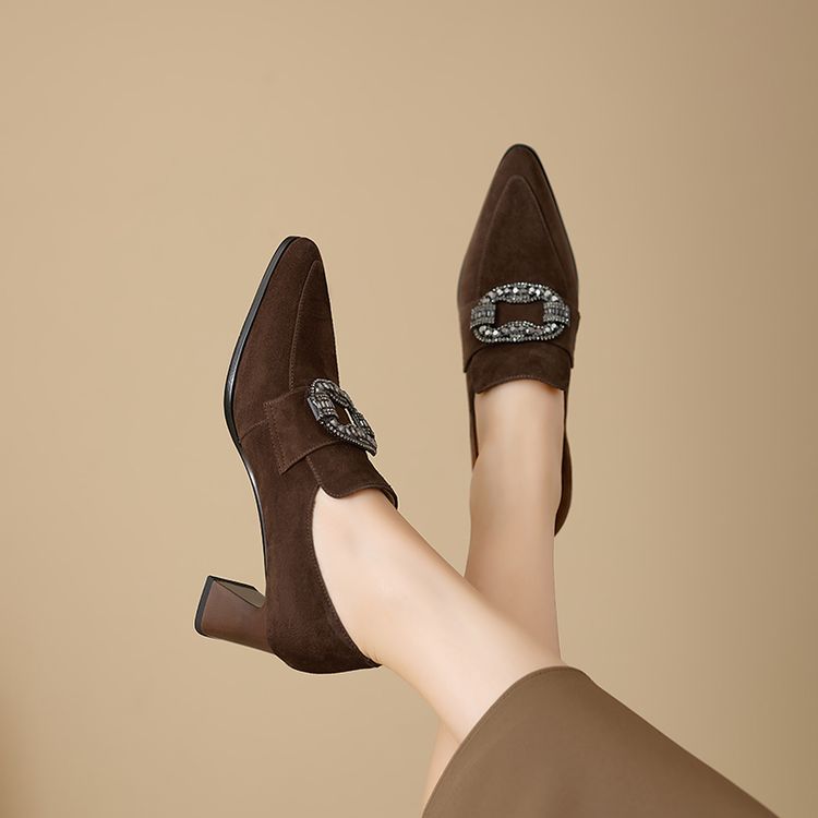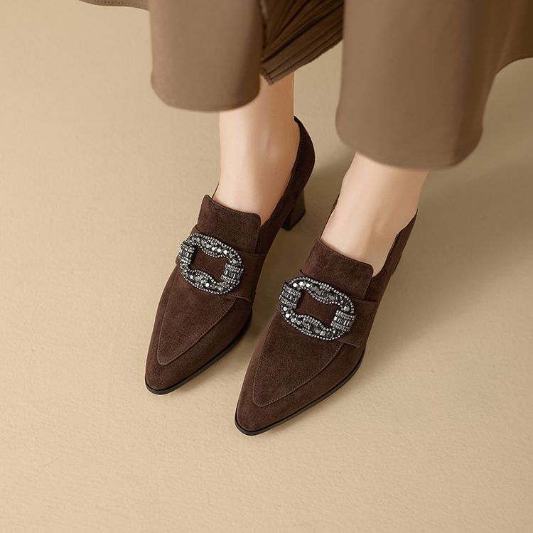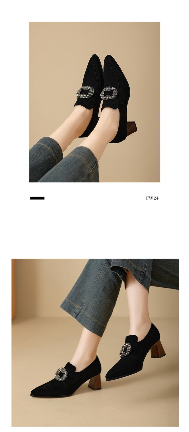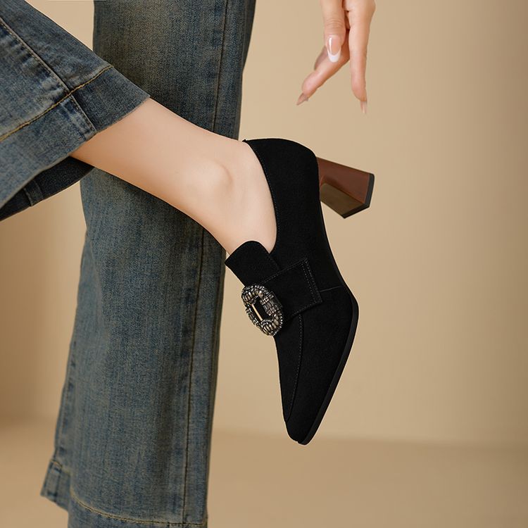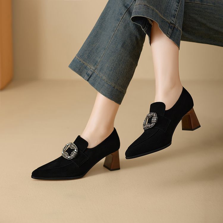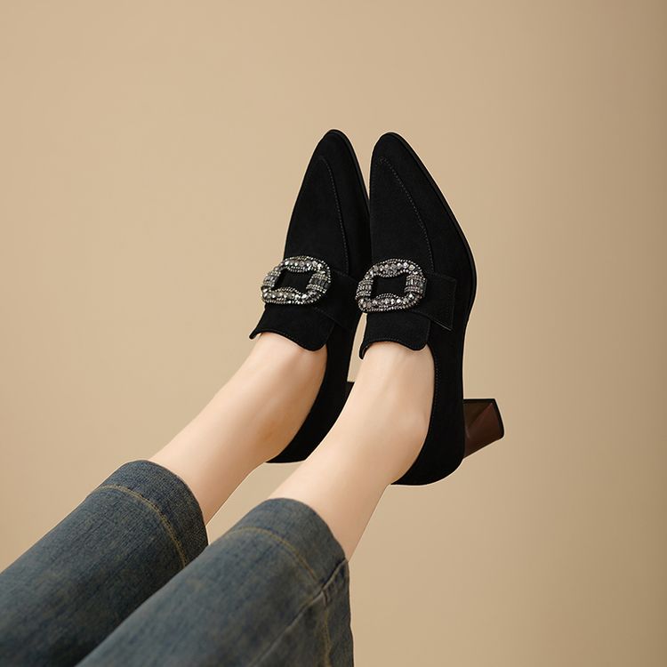 【预售5天】复古磨砂高跟鞋女春秋新款尖头粗跟水钻方扣真皮深口单鞋百搭女鞋KNTNX&KT1687