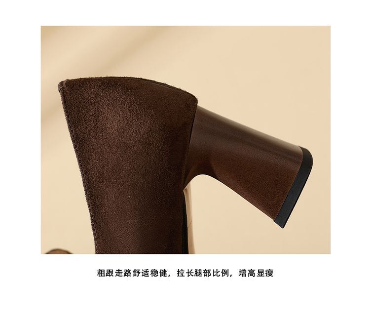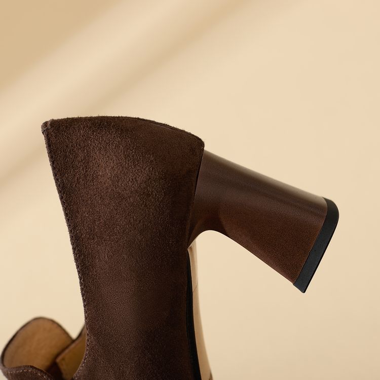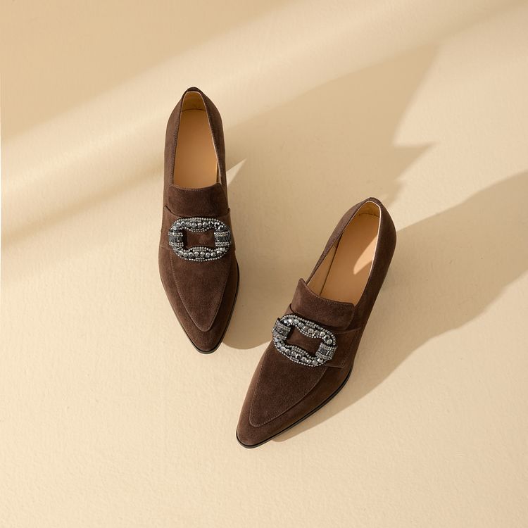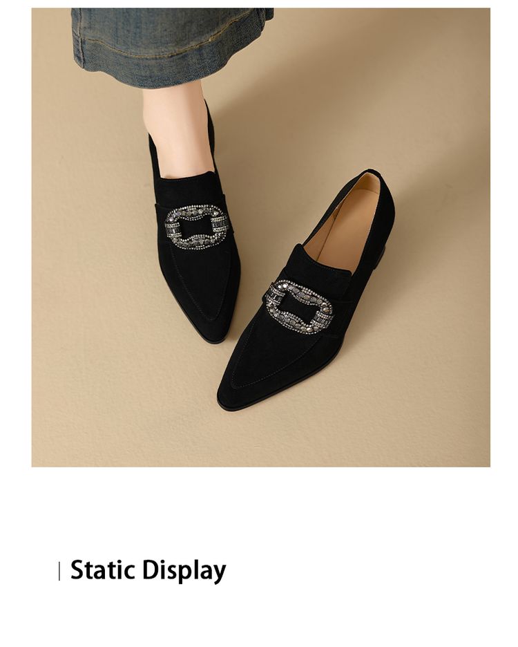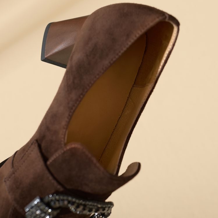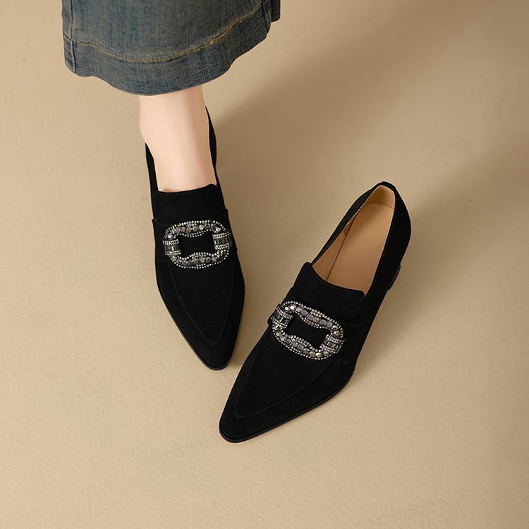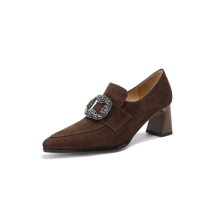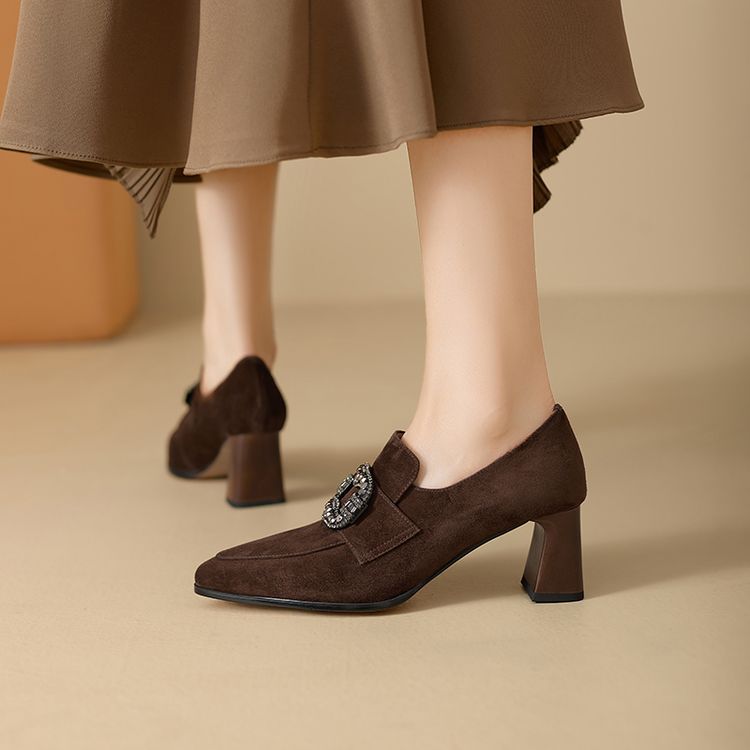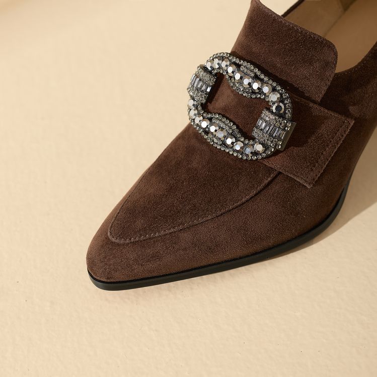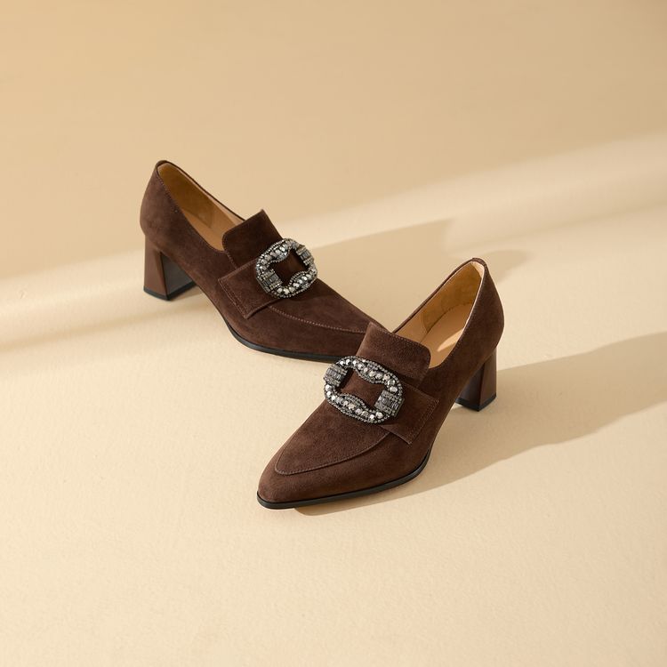 【预售5天】复古磨砂高跟鞋女春秋新款尖头粗跟水钻方扣真皮深口单鞋百搭女鞋KNTNX&KT1687