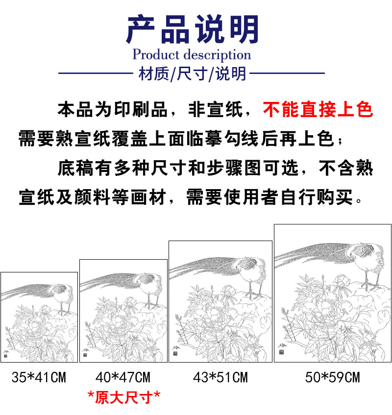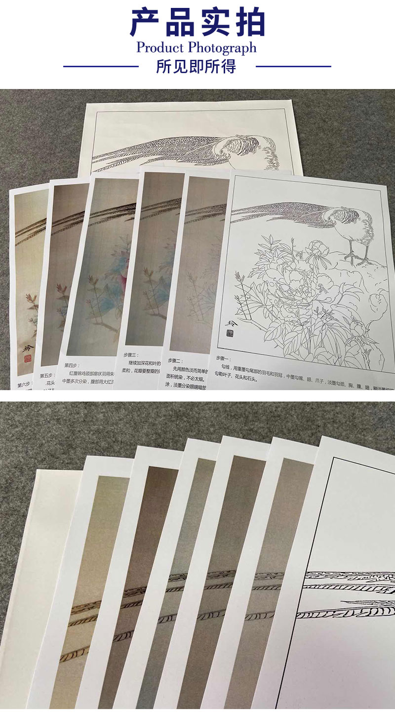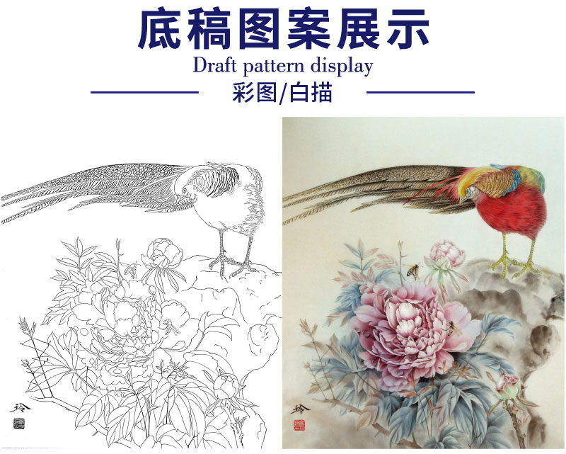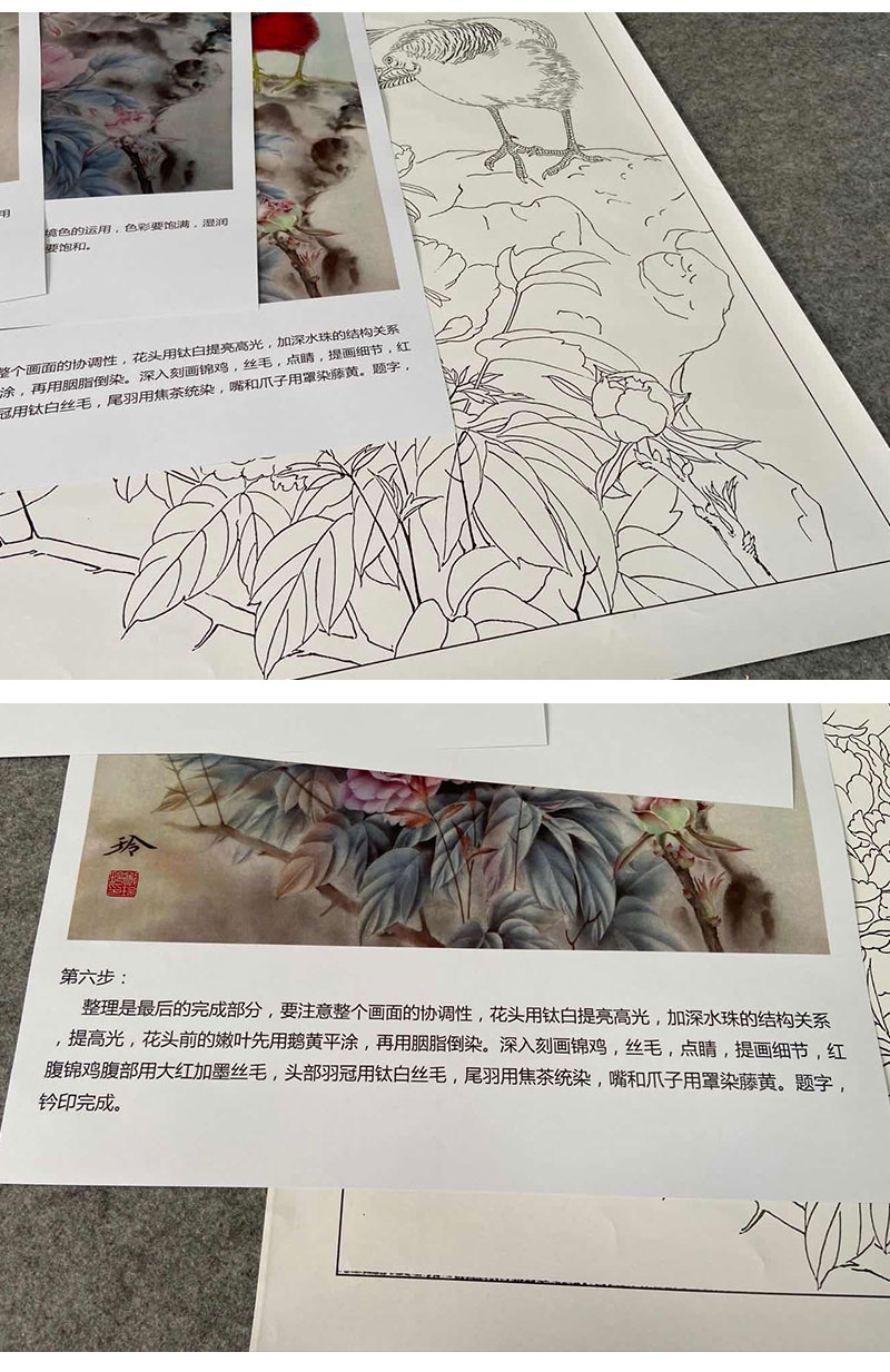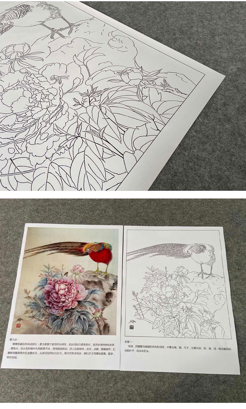 【有步骤、大彩图】郑玲玲工笔画白描底稿《聆听花语》牡丹锦鸡初学者临摹花鸟线稿ZL55