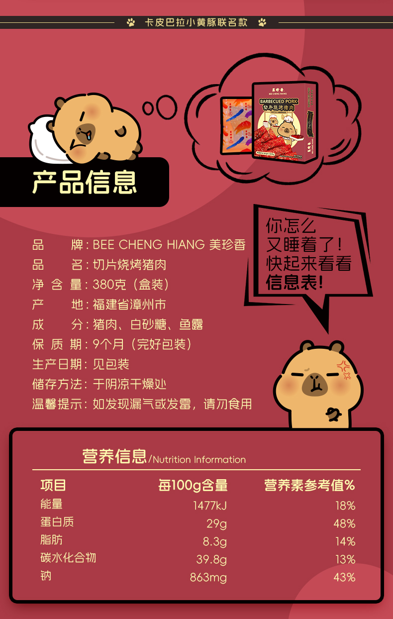 美珍香切片烧烤猪肉380g新加坡品牌特产熟食即食零食非猪肉脯肉干 卡皮巴拉联名款