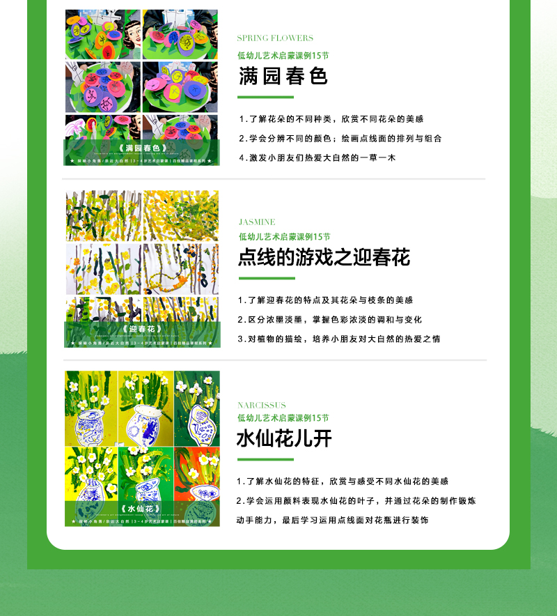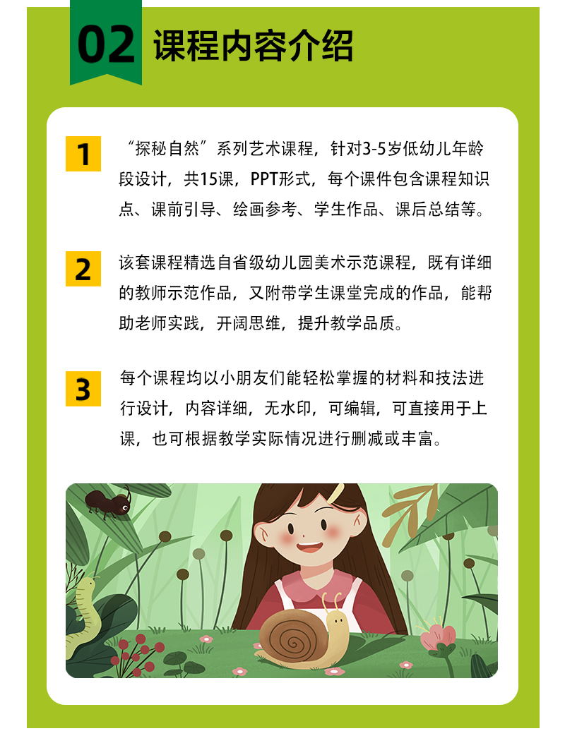 《“探秘自然”系列艺术课PPT课件15例》课件包/课程包/针对3-5岁低幼儿年龄段设计,共15课,PPT形式,每个课件包含课程知识点、课前引导、绘画参考、学生作品、课后总结等。