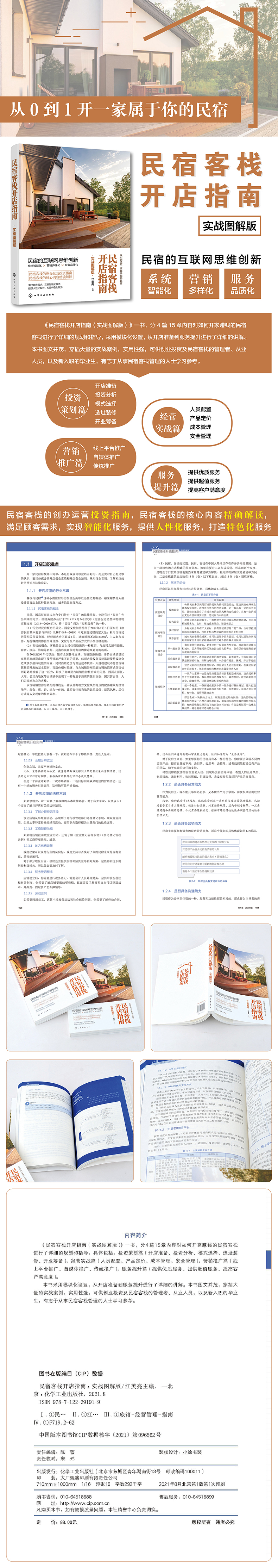 《民宿客栈开店指南(实战图解版)》一书,分4篇15章内容对如何开家赚钱的民宿客栈进行了详细的规划和指导,具体包括:投资策划篇(开店准备、投资分析、模式选择、选址装修、开业筹备),经营实战篇(人员配置、产品定价、成本管理、安全管理),营销推广篇(线上平台推广、自媒体推广、传统推广),服务提升篇(提供优质服务、提供超值服务、提高客户满意度)。