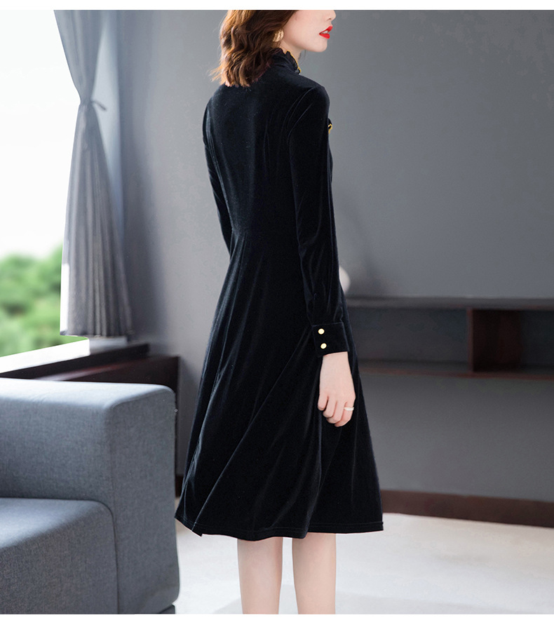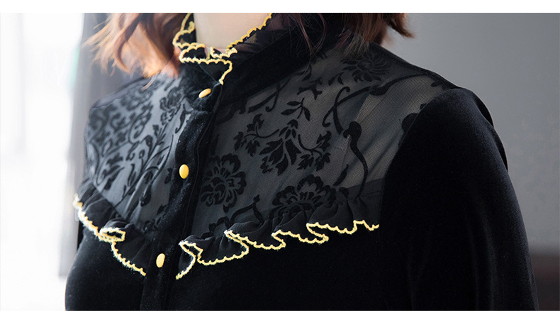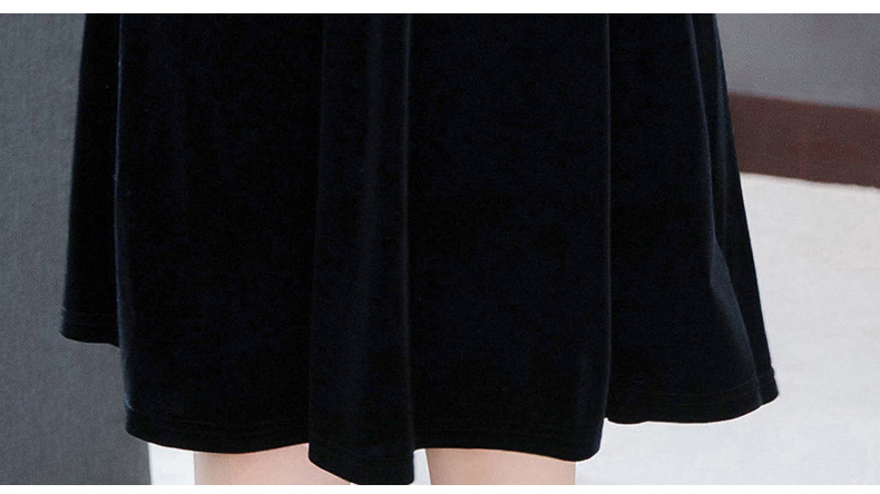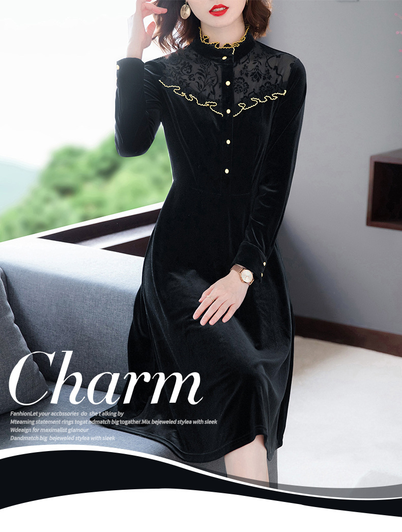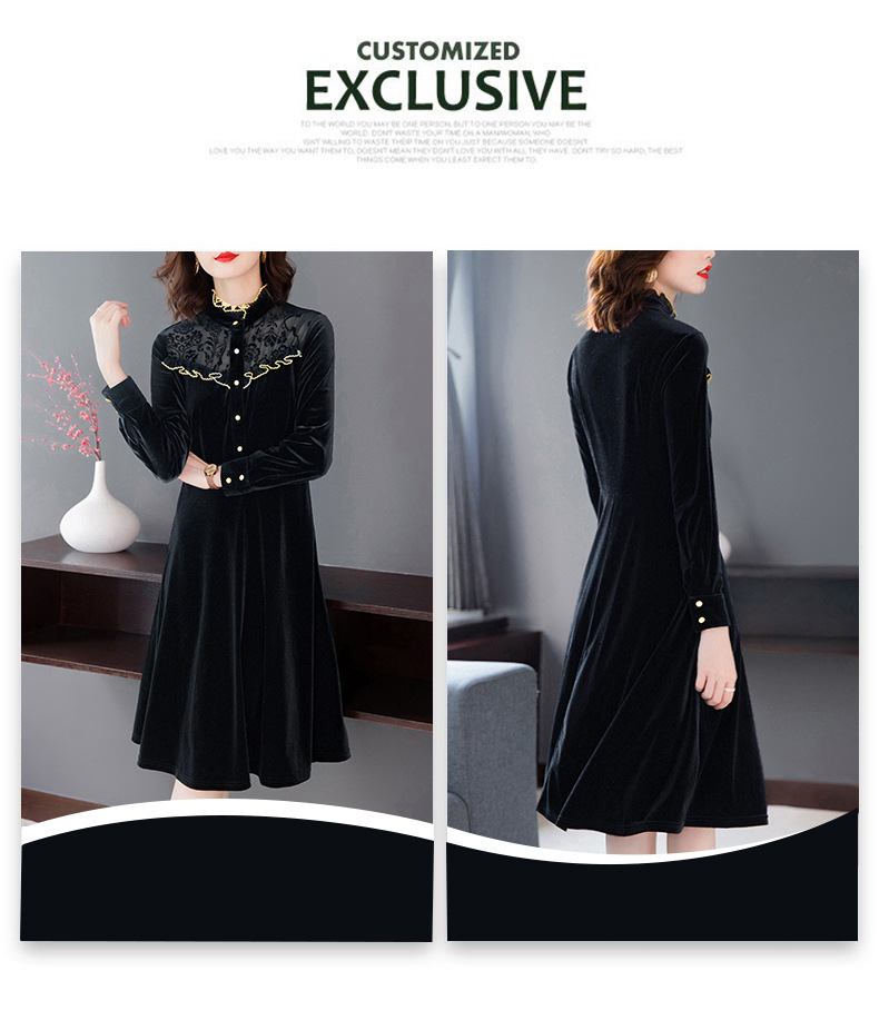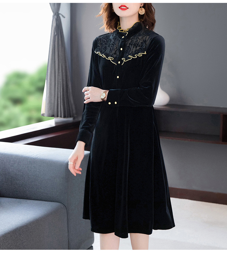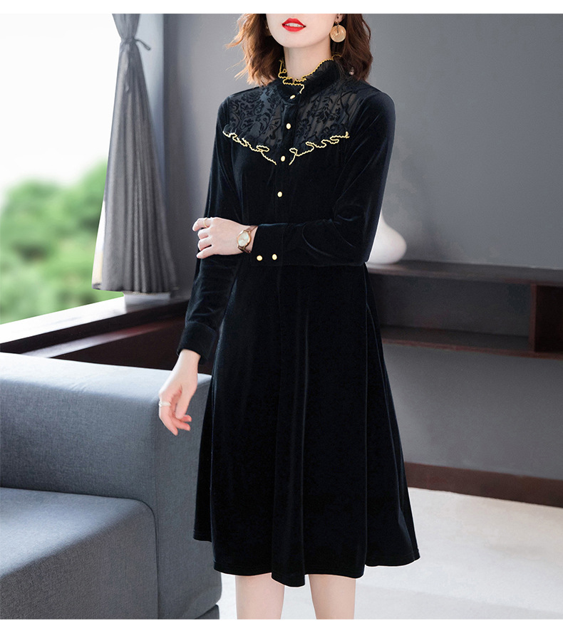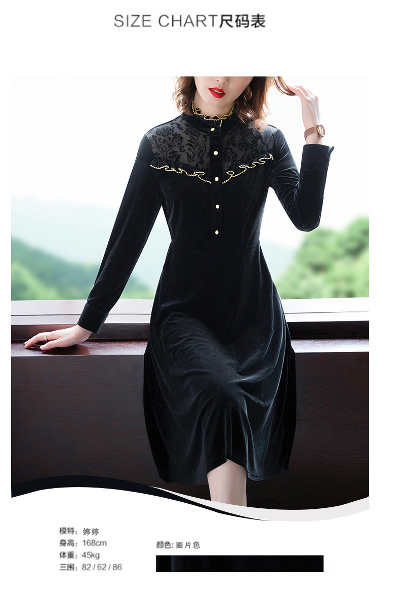 XY-AS6530 2022秋季新款气质优雅蕾丝拼接长袖过膝中长款裙子复古丝绒连衣裙