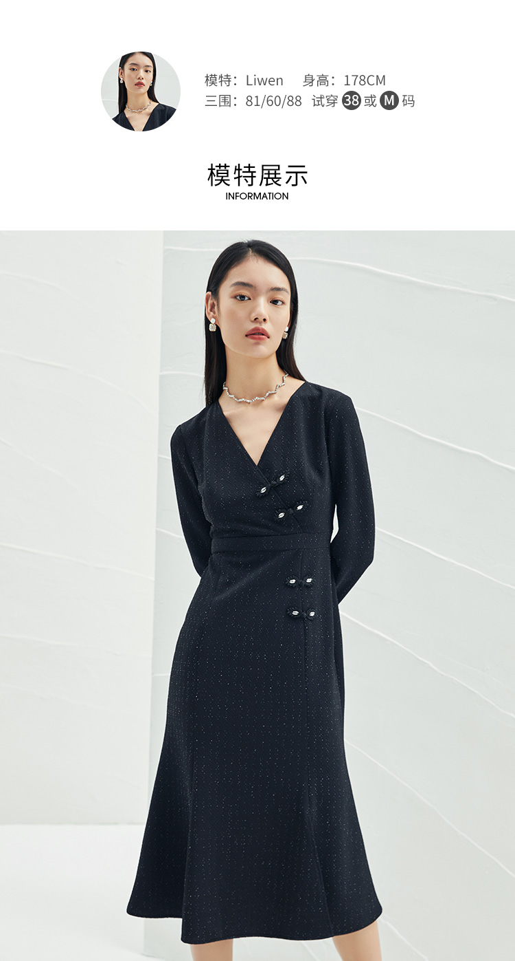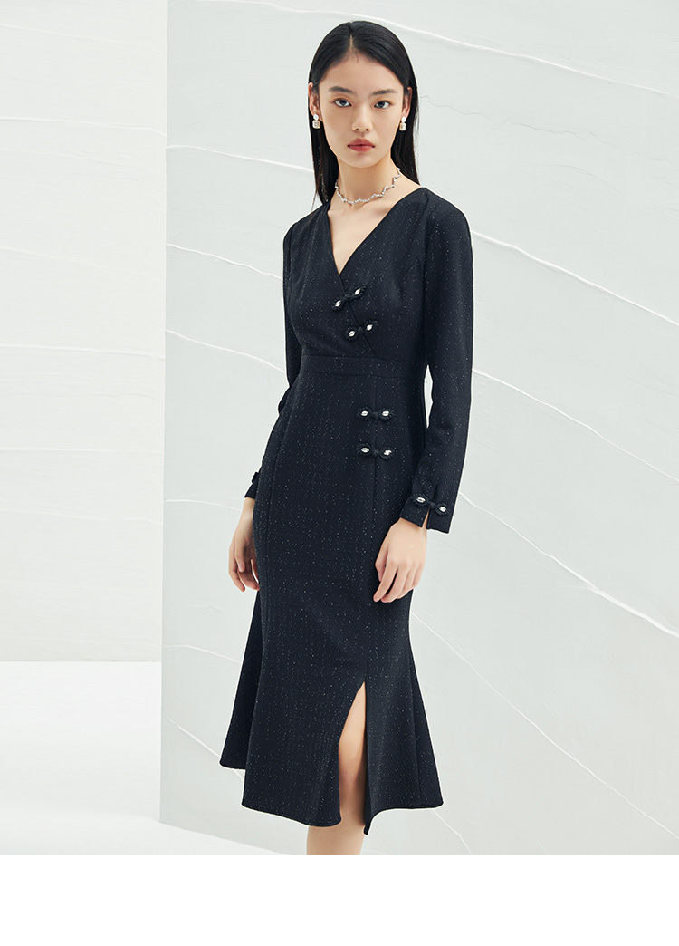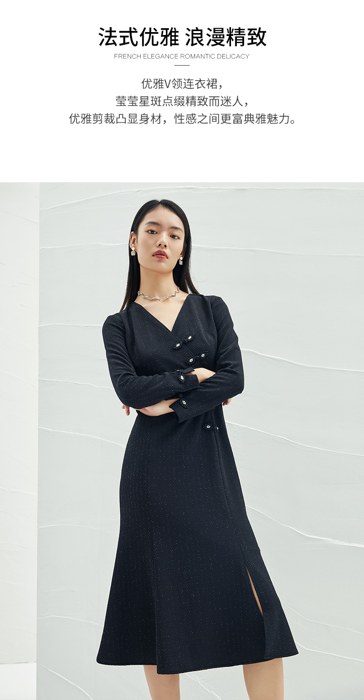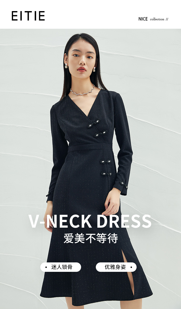 EITIE爱特爱春季新款时尚通勤改良旗袍V领开叉显瘦A字纯色连衣裙A2207911