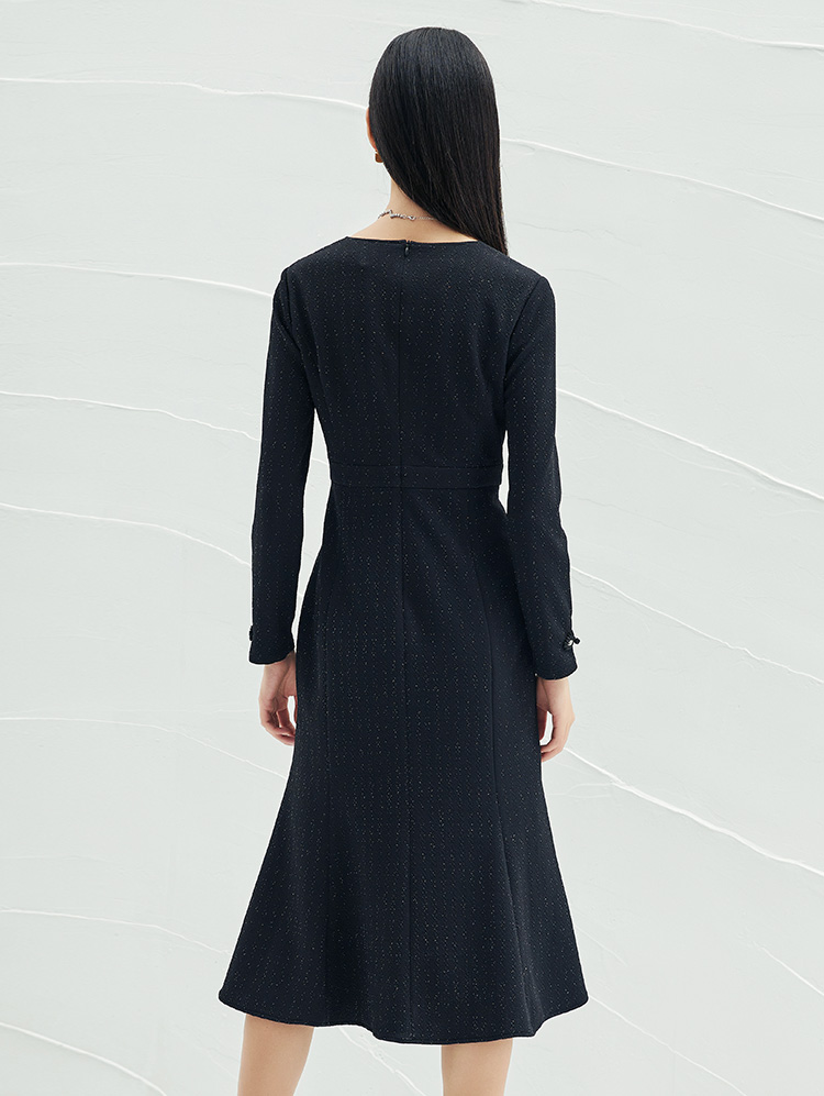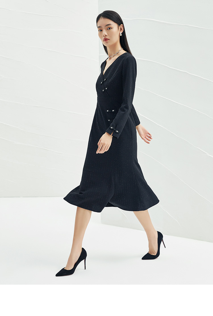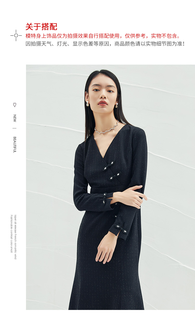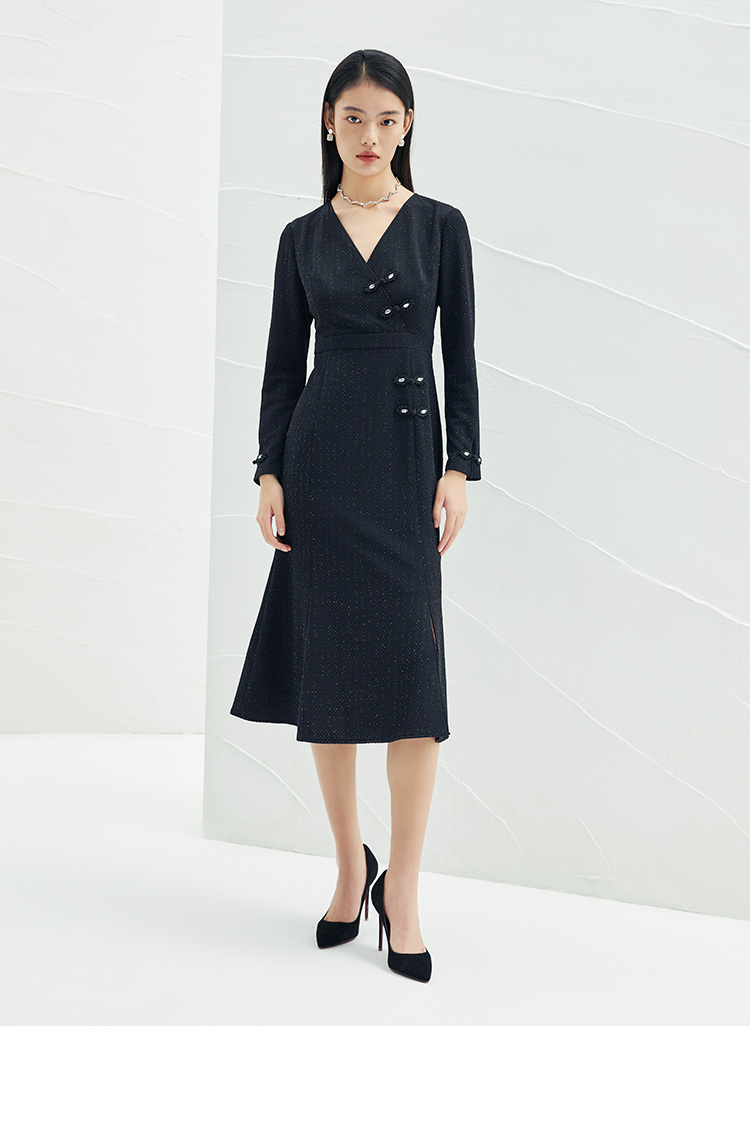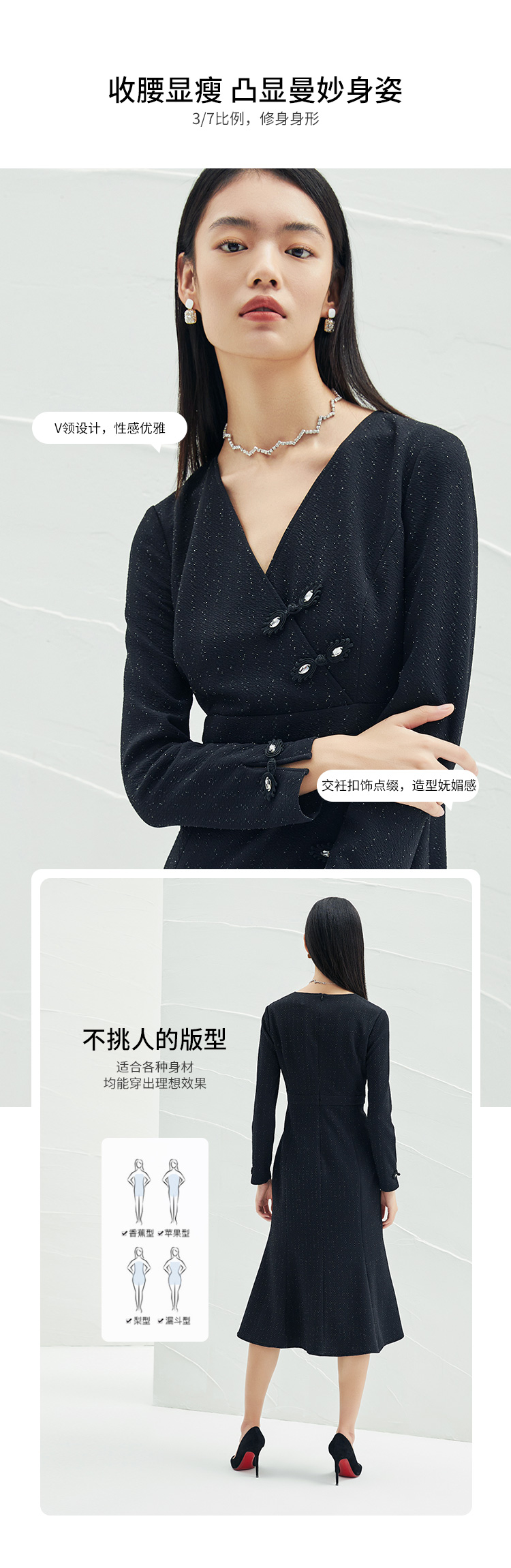EITIE爱特爱春季新款时尚通勤改良旗袍V领开叉显瘦A字纯色连衣裙A2207911