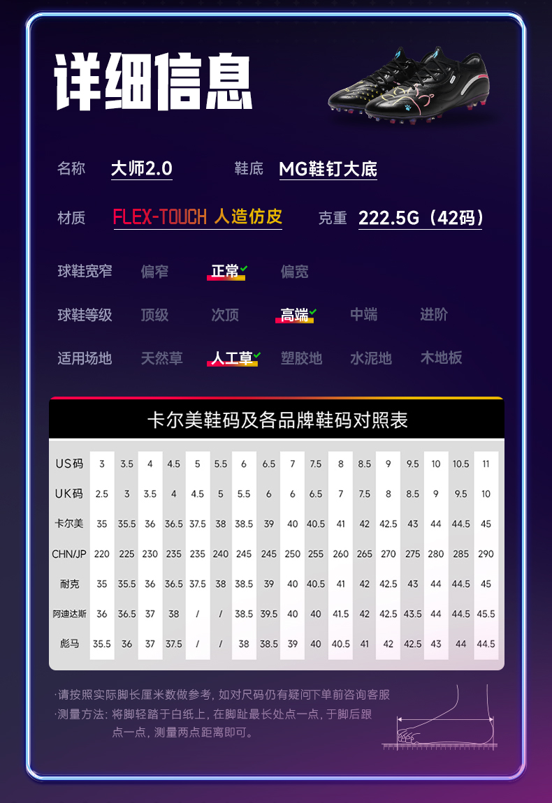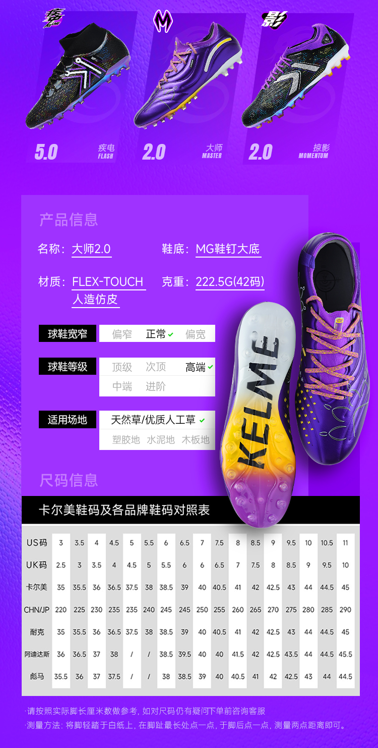 卡尔美新款兰亭序大师2.0MG触感型鞋钉大底男足球鞋
