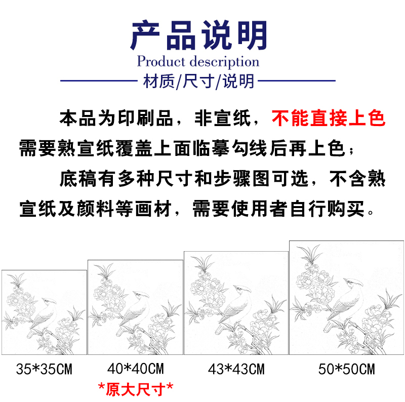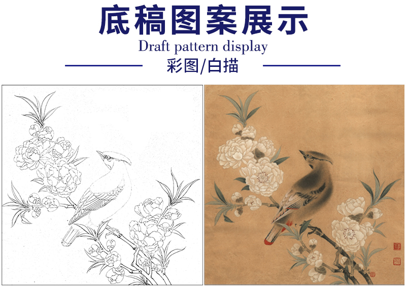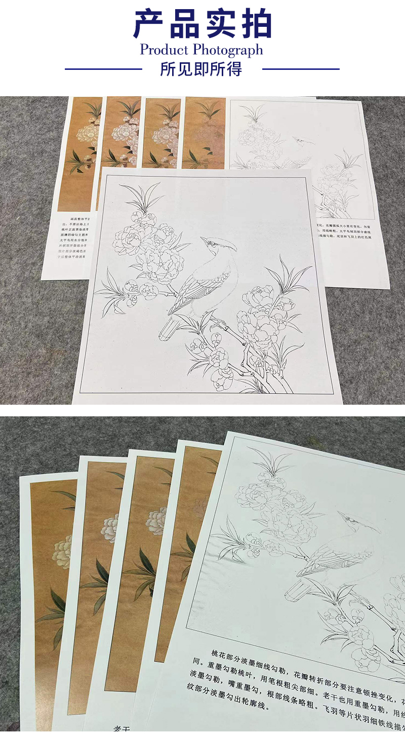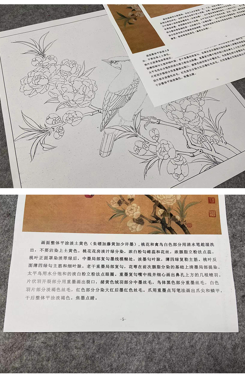 【有步骤、大彩图】李晓明工笔画白描底稿斗方小品《临宋桃花山鸟图》初学者临摹花鸟线稿KL12