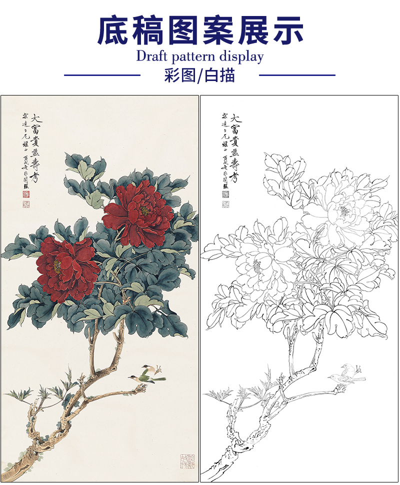 于非闇花鸟工笔画白描底稿《大富贵亦寿考》临摹勾线高清打印稿HS12