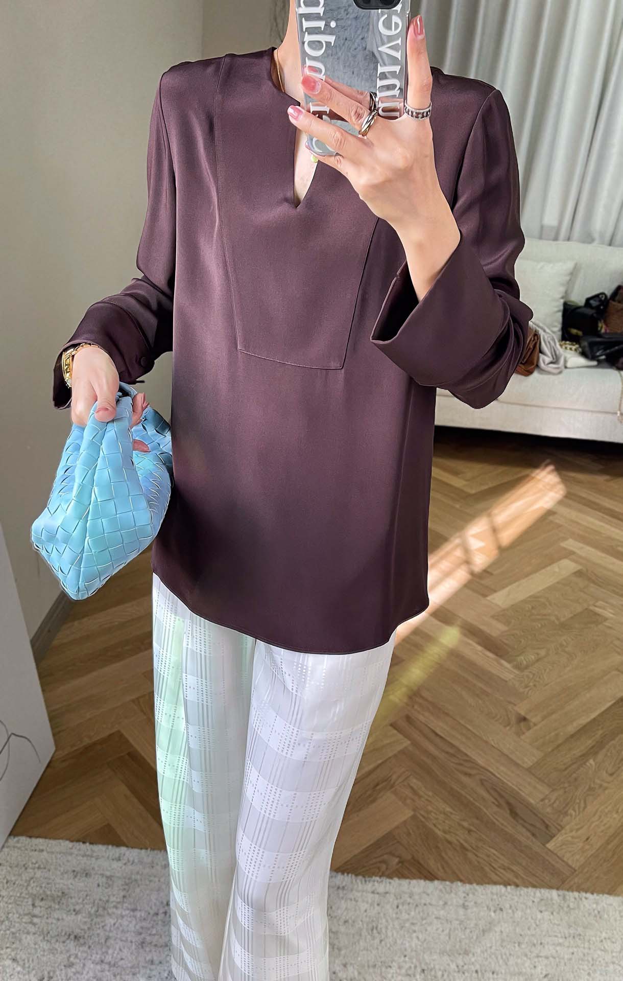 「K」洛诗琳43154高级感真丝衬衫2025新款气质V领桑蚕丝上衣80352