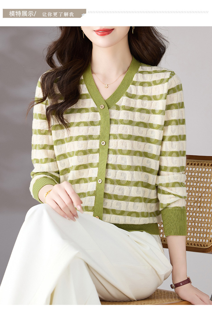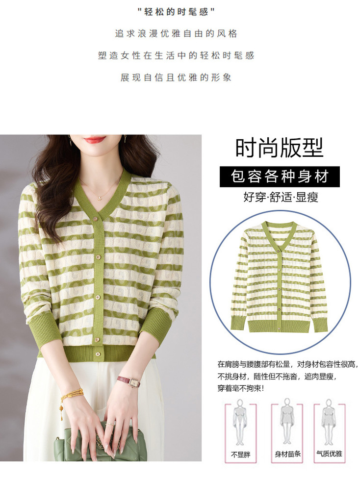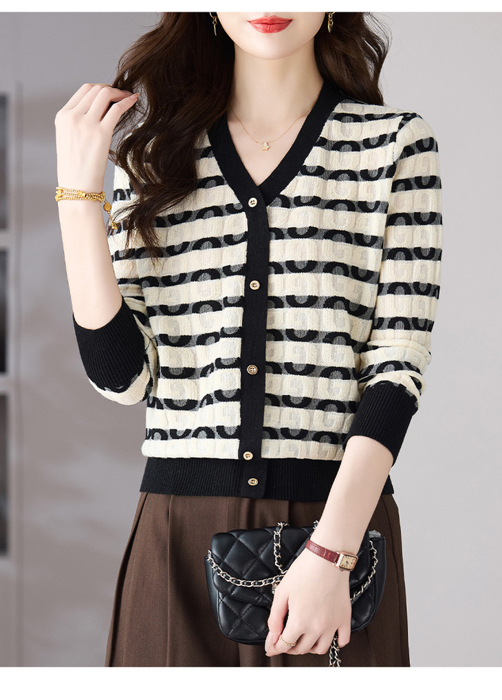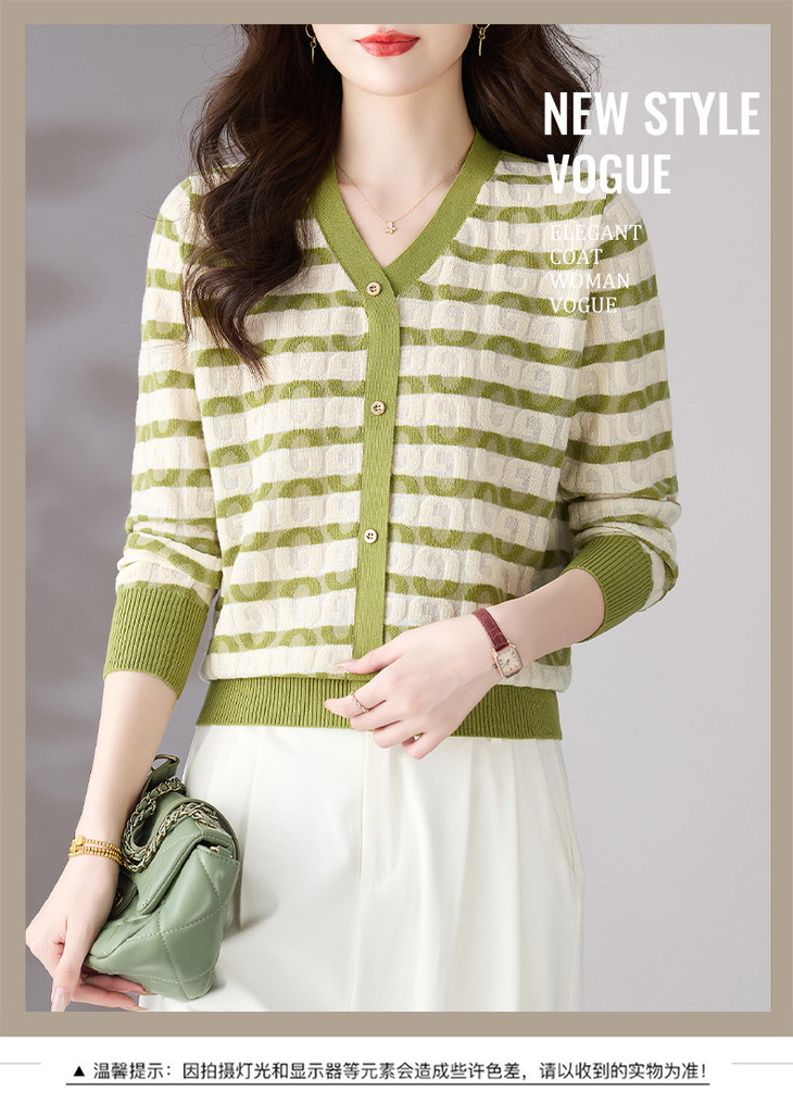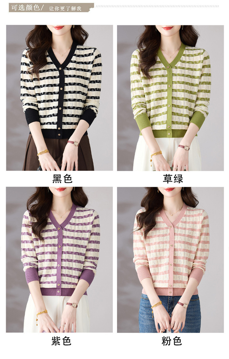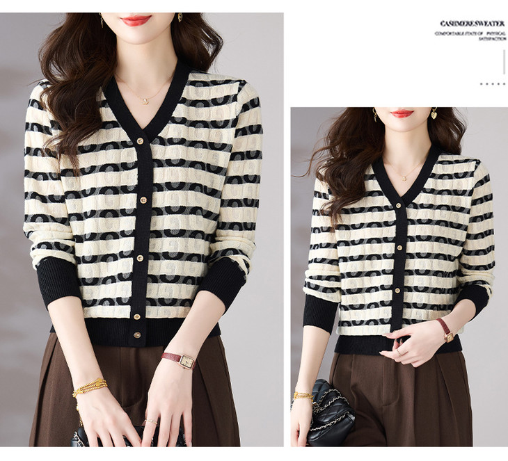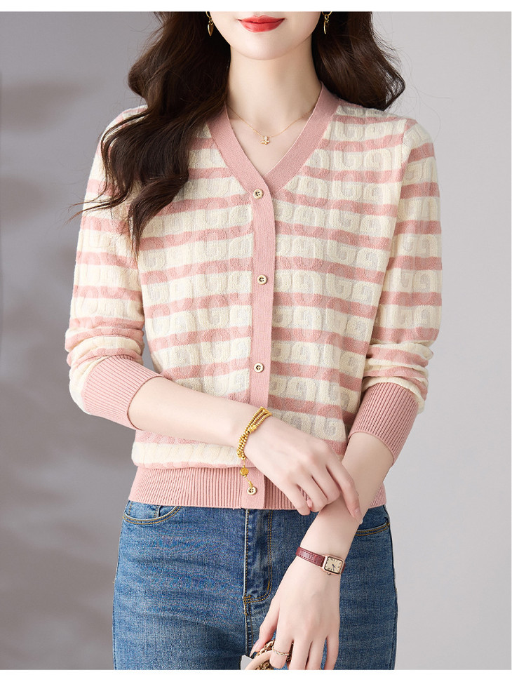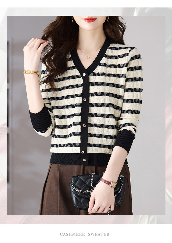 V领条纹针织衫,小香风长袖上衣打底小衫CC-101-82067