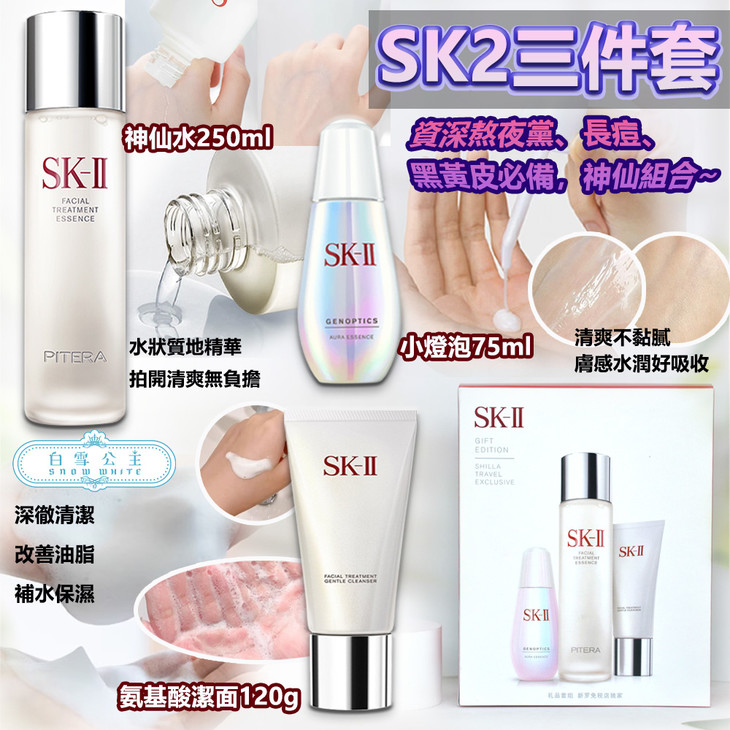 👑SK2三件套(小灯泡+神仙水+洗面奶) 👍资深熬夜党、长痘、黑黄皮必备,神仙组合😍。 💦神仙水:可以平衡水油 ✨小灯泡:可以变白提亮 ✅氨基酸洗面奶,清洁的同时温和地去角质 ✨套装搭配使用,皮肤会变得又透又亮 💎容易出油的T区也会变得清透,肌肤真会变得又光又亮 【套装包括】:小灯泡75ml+神仙水250ml+洗面奶120g