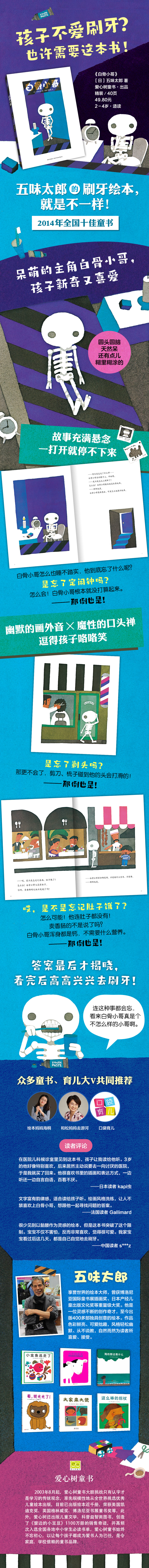 4、很少见到以骷髅作为灵感的绘本,但这本书突破了这个限制。宝宝不仅不害怕,反而***喜欢,觉得很可爱。这本书从一个巧妙的角度提醒宝宝们不要忘了睡前刷牙,我家宝宝看过后这几天,都是自己自觉地去刷牙。 ——中国读者 s***z