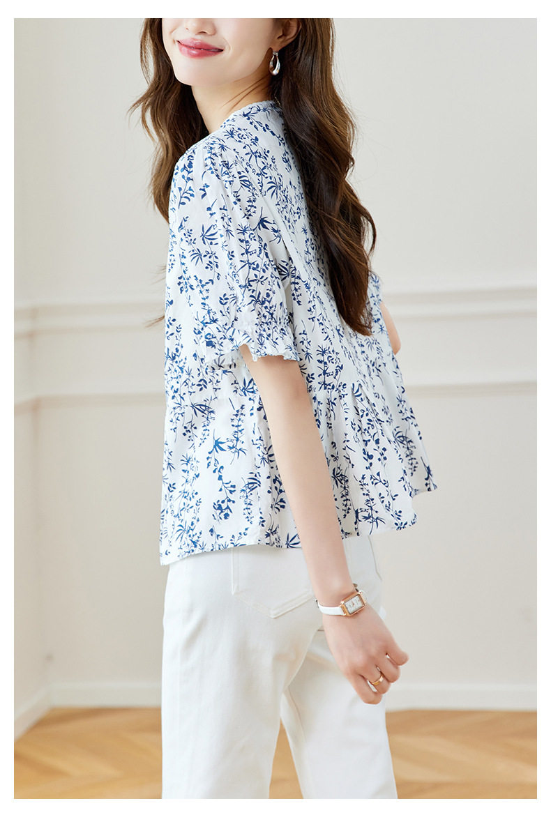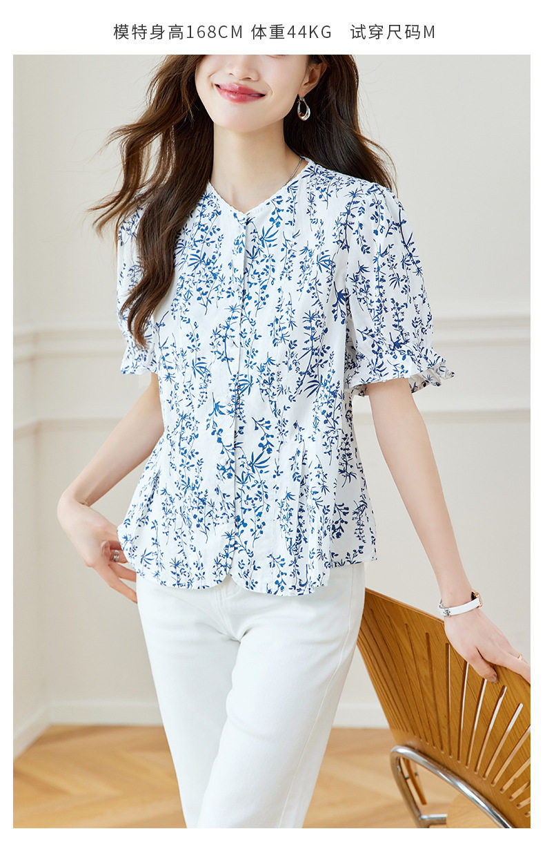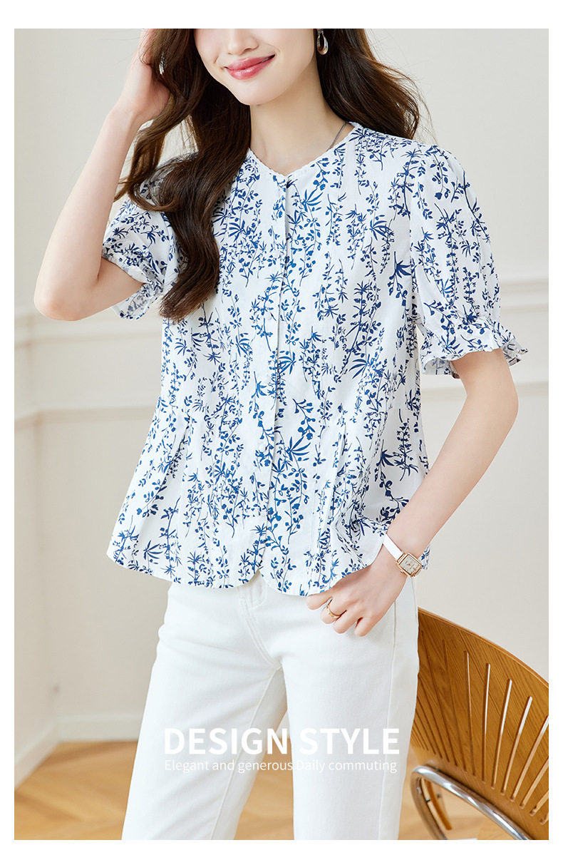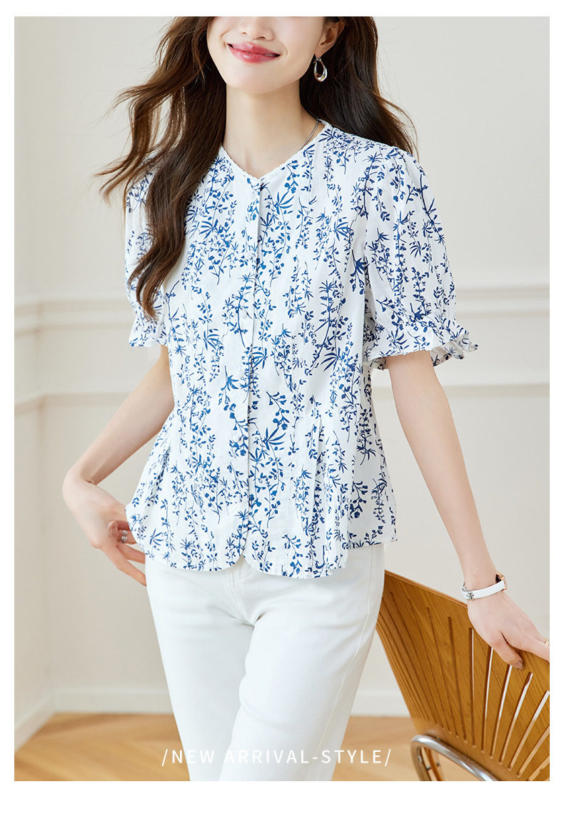 新中式印花衬衫青花瓷短袖上衣女夏季薄款纯棉别致衬衣女 MJ-44085